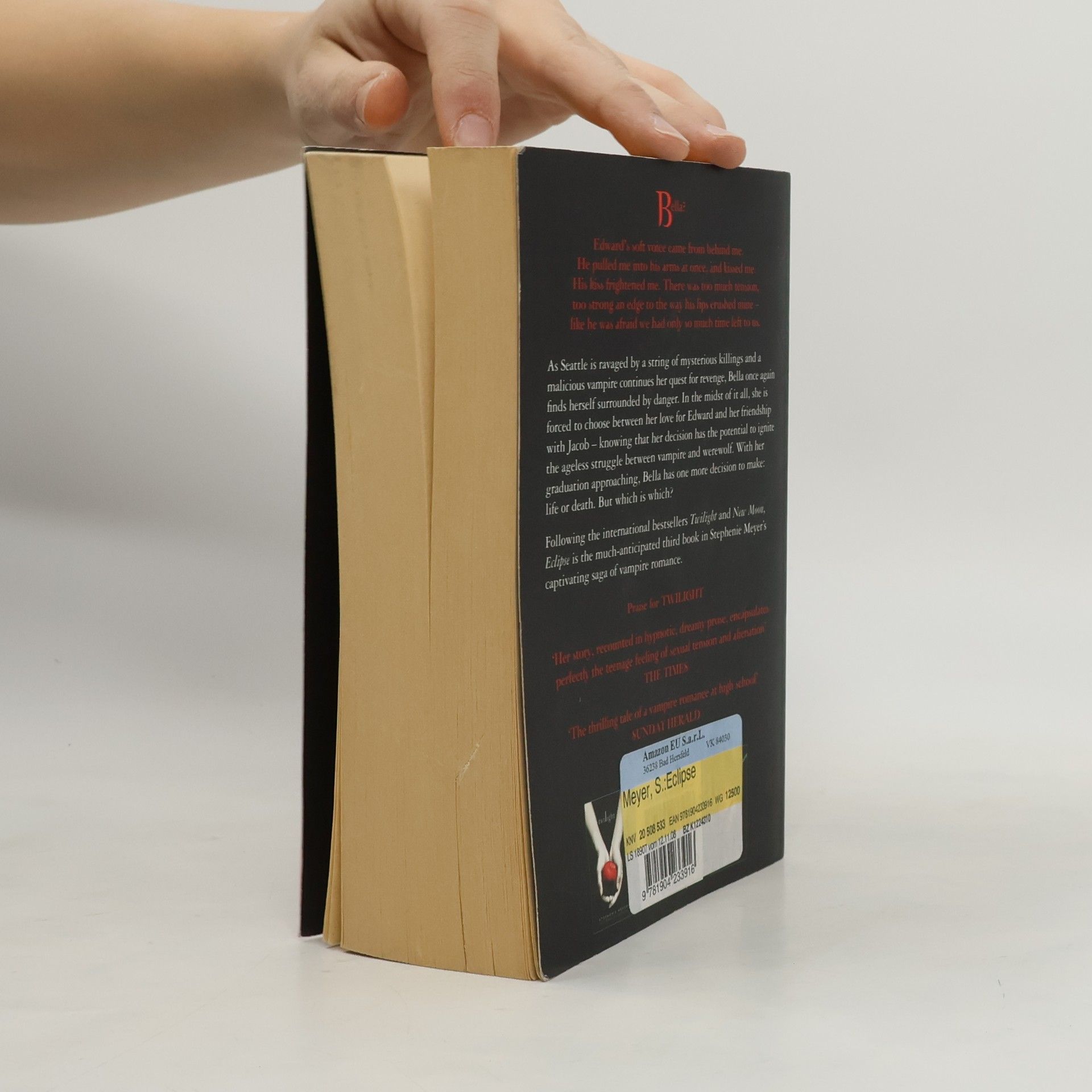 Bella?' Edward's soft voice came from behind me. I turned to see him spring lightly up the porch steps, his hair windblown from running. He pulled me into his arms at once, and kissed me again. His kiss frightened me. There was too much tension, too strong an edge to the way his lips crushed mine - like he was afraid we had only so much time left to us. As Seattle is ravaged by a string of mysterious killings and a malicious vampire continues her quest for revenge, Bella once again finds herself surrounded by danger. In the midst of it all, she is forced to choose between her love for Edward and her friendship with Jacob - knowing that her decision has the potential to ignite the ageless struggle between vampire and werewolf. With her graduation approaching, Bella has one more decision to make: life or death. But which is which? Following the international bestsellers Twilight and New Moon, Eclipse is the much-anticipated third book in Stephenie Meyer's captivating saga of vampire romance.