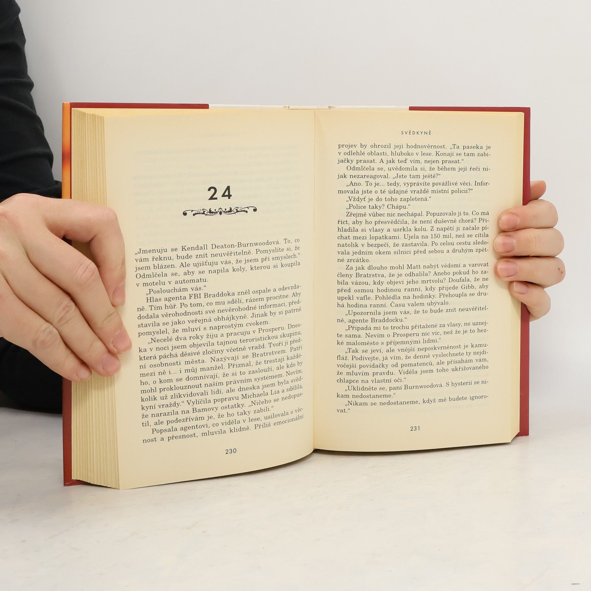 Kendall Deatonové se podaří vyprostit sebe i své dítě z havarovaného auta a se směsicí odvahy a strachu se vyškrábat z rokle nahoru na silnici, kde může očekávat pomoc. Jenomže ona si netroufá prozradit svou identitu ani požádat o ochranu úřady. Namísto toho plánuje okamžitý útěk. Její riskantní dobrodružství začíná... Kendall přijela do Prosperu, městečka v Jižní Karolíně, aby se stala veřejnou obhájkyní u místního soudu. Přivítala ji mrazivá atmosféra - soudci nebylo po chuti, že tak důležité místo má zastávat žena. Při své práci Kendall narazí na podivné tajemství, kterému se snaží přijít na kloub. Zároveň se o ni začne zajímat nejmocnější člověk z města, Matt Burnwood, a zamilovaná Kendall se za tohoto muže, jenž její život promění v peklo, provdá. Nyní může jen doufat, že to přežije. A že se jí před hrůzu nahánějícími událostmi podaří ochránit i své dítě. Je nebezpečnou, zpěčující se svědkyní, která ví až moc o zákeřném zlu... a ženou, která ví velmi málo o vlastním srdci.... celý text