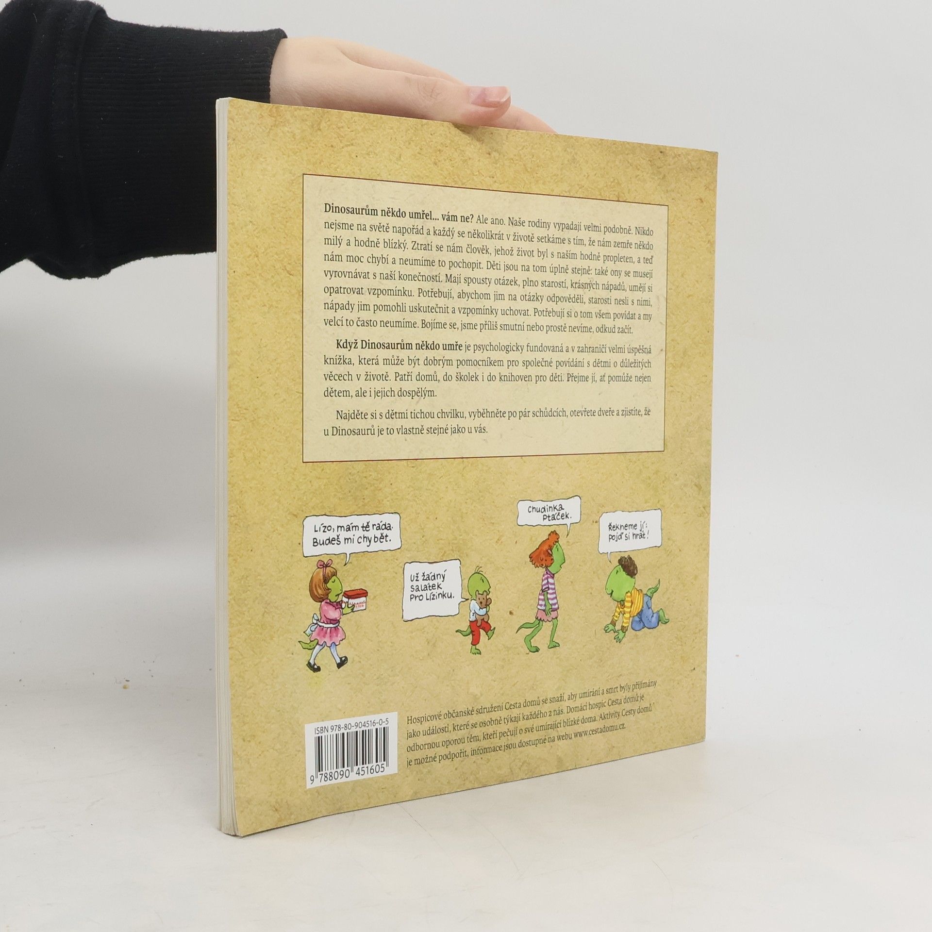 Dinosaurům někdo umřel... vám ne? Ale ano. Naše rodiny vypadají velmi podobně. Nikdo nejsme na světě napořád a každý se několikrát v životě setkáme s tím, že nám zemře někdo milý a hodně blízký. Ztratí se nám člověk, jehož život byl s naším hodně propleten, a teď nám moc chybí a neumíme to pochopit. Děti jsou na tom úplně stejně: také ony se musejí vyrovnávat s naší konečností. Mají spousty otázek, plno starostí, krásných nápadů, umějí si opatrovat vzpomínku. Potřebují, abychom jim na otázky odpověděli, starosti nesli s nimi, nápady jim pomohli uskutečnit a vzpomínky uchovat. Potřebují si o tom všem povídat a my velcí to často neumíme. Bojíme se, jsme příliš smutní nebo prostě nevíme, odkud začít.
