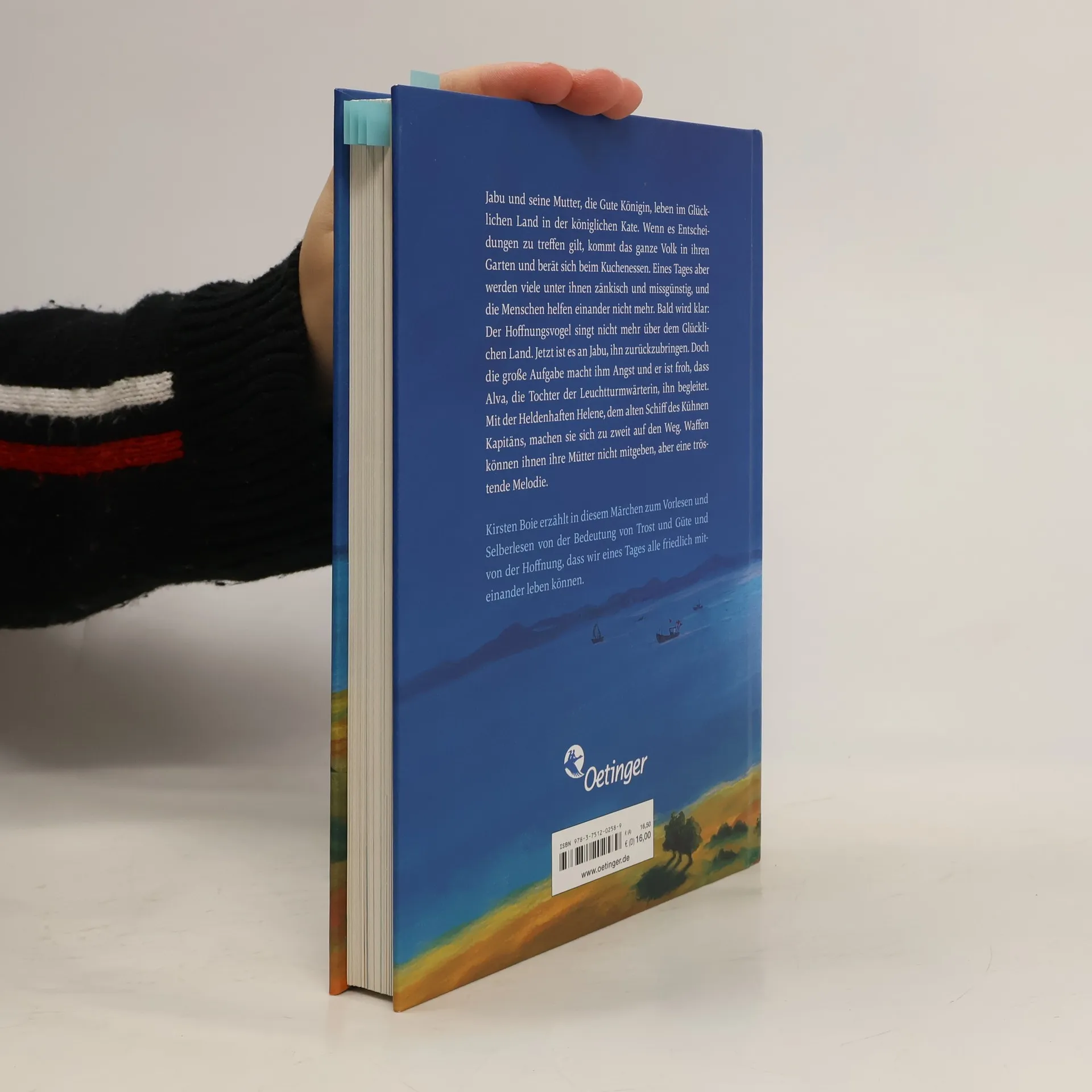 Parabel von der Hoffnung, dass eines Tages alle Menschen friedlich miteinander lebenJabu und seine Mutter, die Gute Königin, leben im Glücklichen Land in der königlichen Kate. Wenn es Entscheidungen zu treffen gilt, kommt das ganze Volk in ihren Garten und berät sich beim Kuchenessen. Eines Tages aber werden viele unter ihnen zänkisch und missgünstig, und die Menschen helfen einander nicht mehr. Bald wird klar: Der Hoffnungsvogel singt nicht mehr über dem Glücklichen Land. Jetzt ist es an Jabu, ihn zurückzubringen. Doch die große Aufgabe macht ihm Angst und er ist froh, dass Alva, die Tochter der Leuchtturmwärterin, ihn begleitet. Mit der Heldenhaften Helene, dem alten Schiff des Kühnen Kapitäns, machen sie sich zu zweit auf den Weg. Waffen können ihnen ihre Mütter nicht mitgeben, aber eine tröstende Melodie.Kirsten Boie erzählt in diesem Märchen zum Vorlesen und Selberlesen von der Bedeutung von Trost und Güte und von der Hoffnung, dass wir eines Tages alle friedlich miteinander leben können.