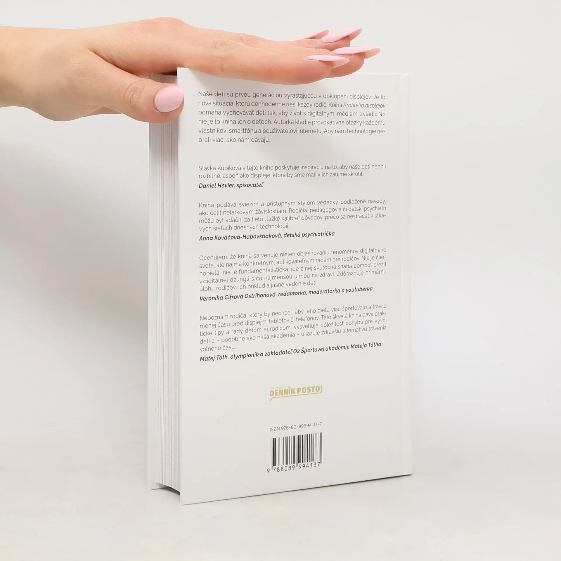 Naše deti sú prvou generáciou vyrastajúcou v obklopení displejov. Je to nová situácia, ktorú dennodenne rieši každý rodič. Kniha Krotitelia displejov pomáha vychovávať deti tak, aby život s digitálnymi médiami zvládli. No nie je to kniha len o deťoch. Autorka kladie provokatívne otázky každému vlastníkovi smartfónu a používateľovi internetu. Aby nám technológie nebrali viac, ako nám dávajú.