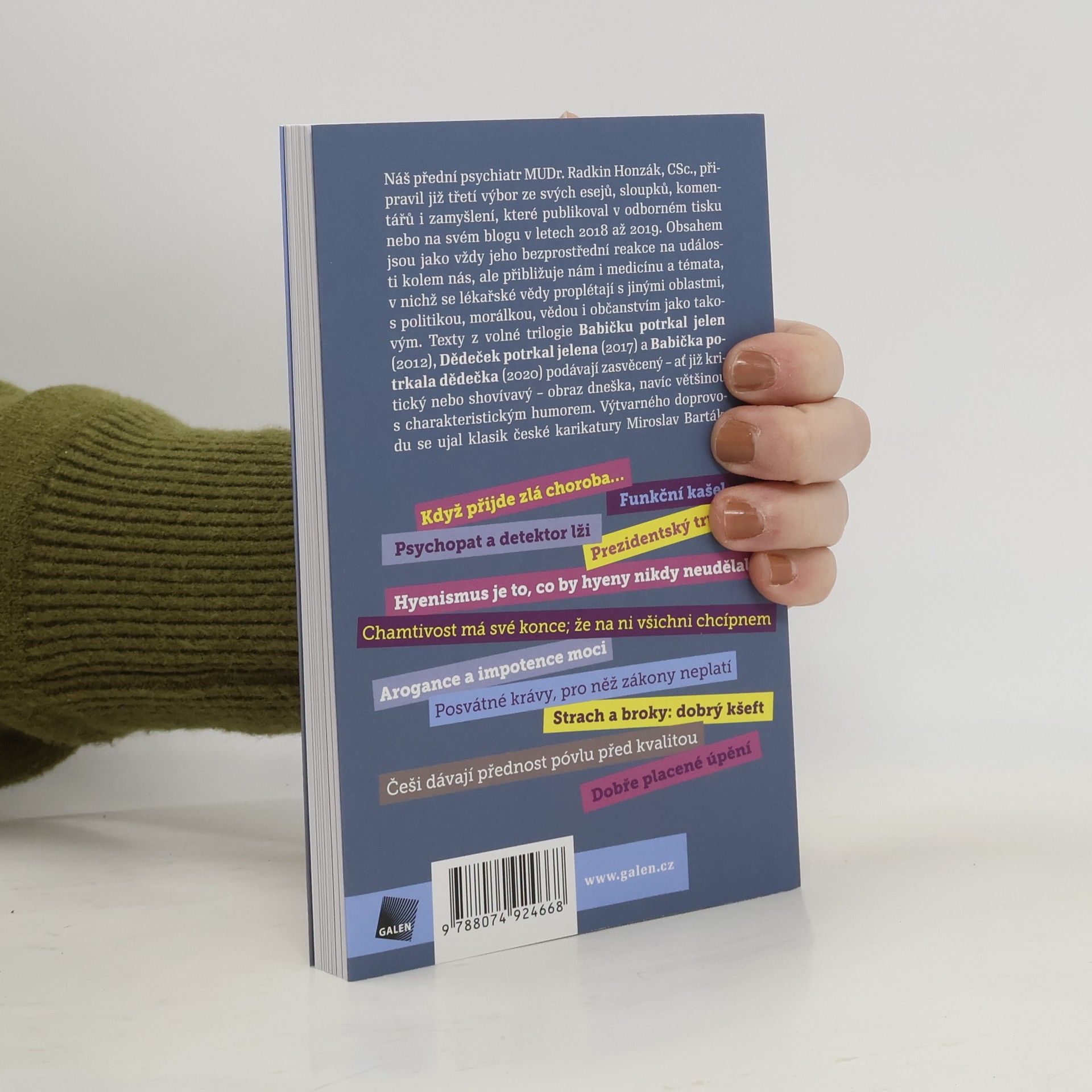 Náš přední psychiatr MUDr. Radkin Honzák, CSc. (* 1939), připravil již třetí výbor ze svých esejů, sloupků, komentářů i zamyšlení, které publikoval v odborných časopisech nebo na svém blogu v letech 2018 až 2019. Obsahem jsou jako vždy jeho bezprostřední reakce na události kolem nás, ale přibližuje nám i medicínu a témata, v nichž se lékařské vědy proplétají s jinými oblastmi, s politikou, morálkou, vědou i občanstvím jako takovým. Texty z volné trilogie Babičku potrkal jelen (2012), Dědeček potrkal jelena (2017) a Babička potrkala dědečka (2020) podávají zasvěcený – ať již kritický nebo shovívavý – obraz dnešní doby, navíc většinou s charakteristickým humorem. Výtvarného doprovodu se ujal klasik české karikatury Miroslav Barták.