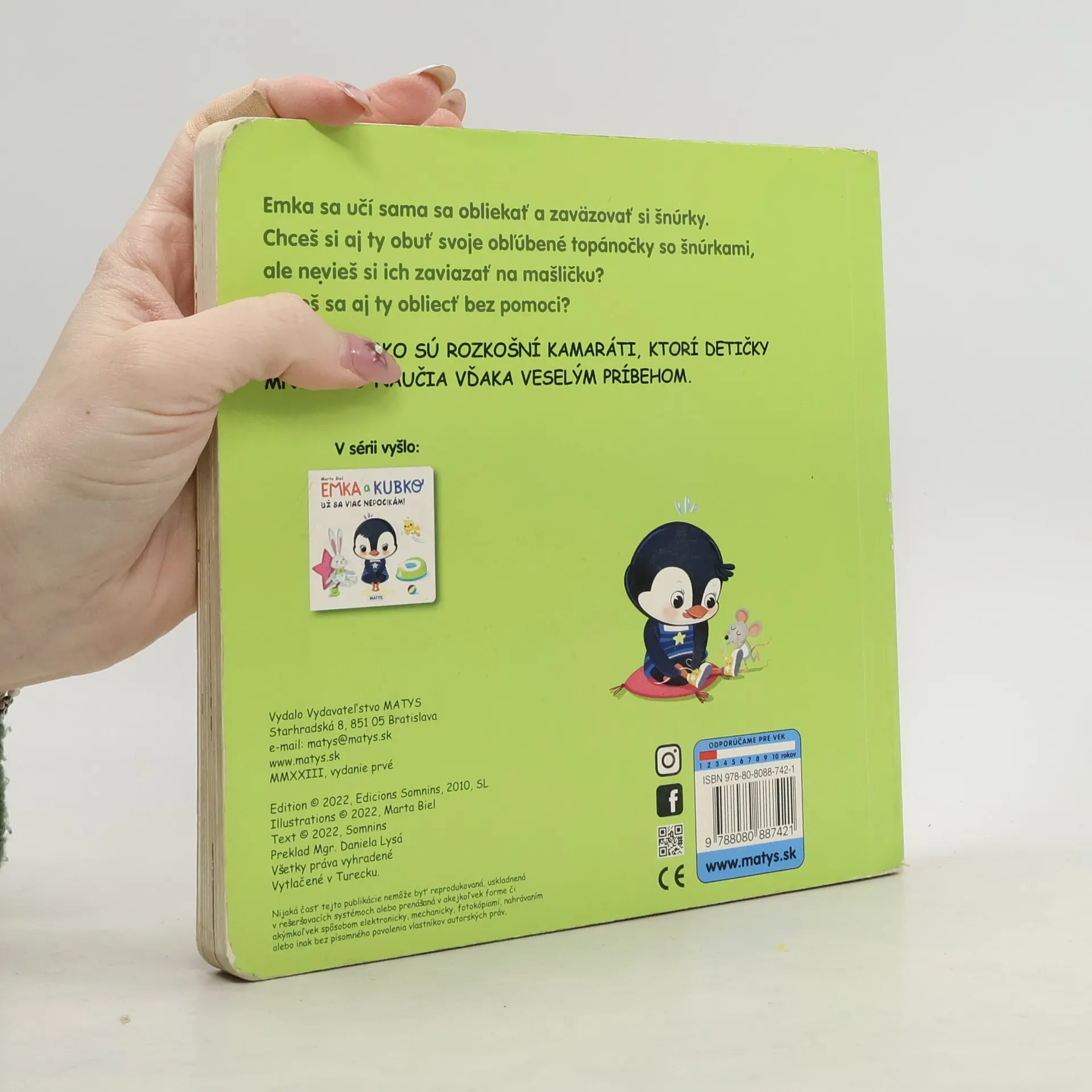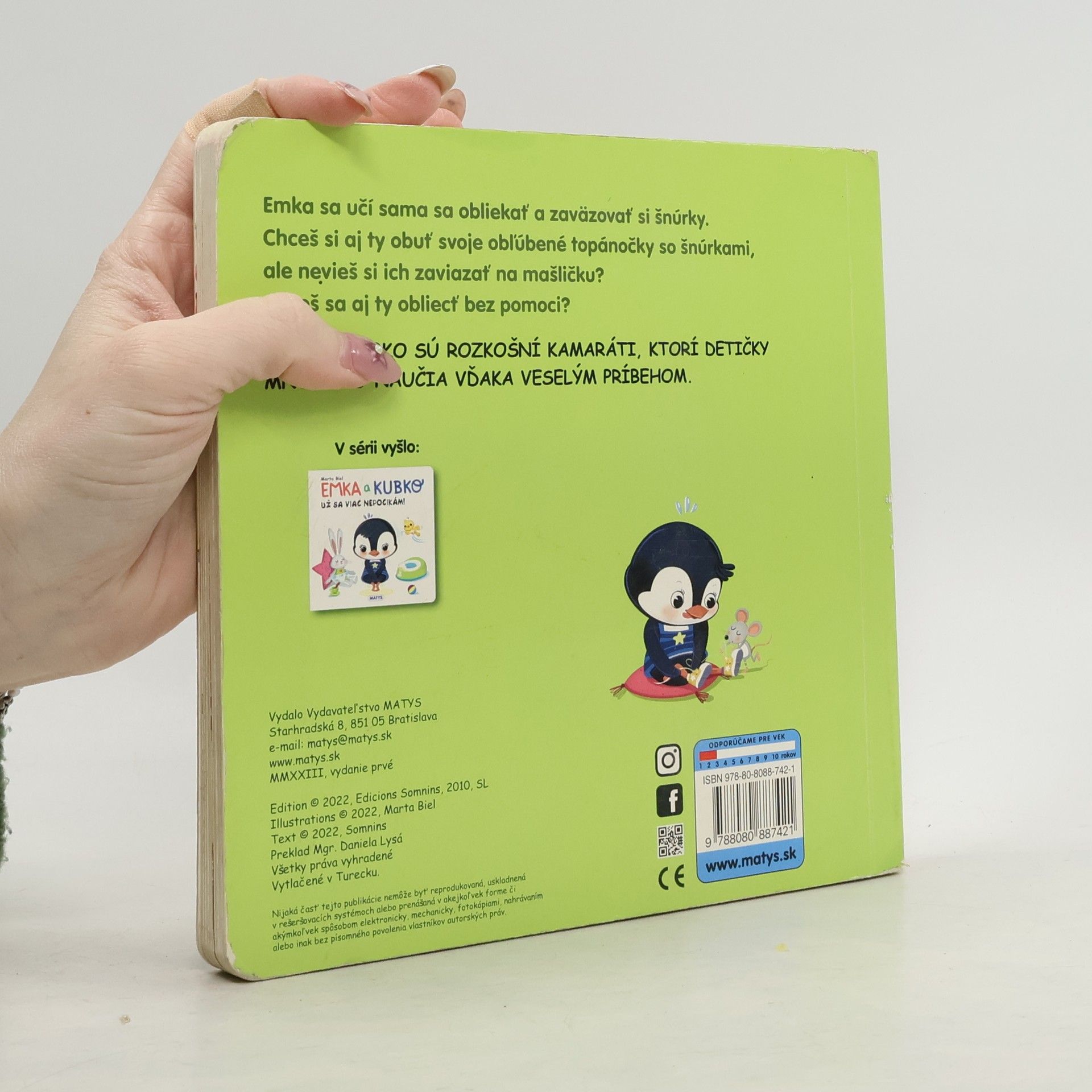 Emka a Kubko sú rozkošní kamaráti, ktorí detičky mnohému naučia vďaka veselým príbehom. Emka sa učí sama sa obliekať a zaväzovať si šnúrky. Chceš si aj ty obuť svoje obľúbené topánočky so šnúrkami, ale nevieš si ich zaviazať na mašličku? Chceš sa aj ty obliecť bez pomoci? Prinášame vám veselé hravé leporelo s krásnymi ilustráciami a okienkami.