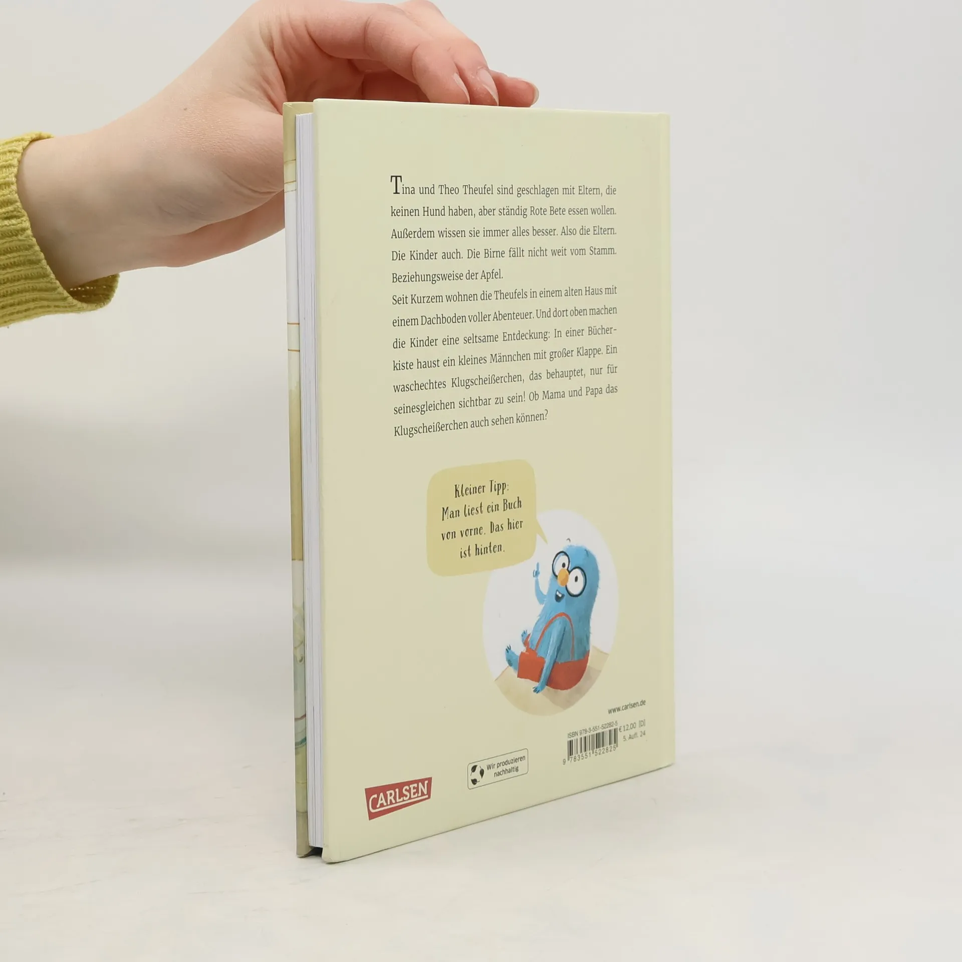 "Tina und Theo Theufel sind geschlagen mit Eltern, die keinen Hund haben, aber ständig Rote Beete essen wollen. Außerdem wissen sie immer alles besser. Also die Eltern. Die Kinder auch. Die Birne fällt nicht weit vom Stamm. Beziehungsweise der Apfel. Seit Kurzem wohnen die Theufels in einem alten Haus mit einem Dachboden voller Abenteuer. Und dort oben machen die Kinder auf dem Dachboden eine seltsame Entdeckung: In einer Bücherkiste haust ein kleines Männchen mit großer Klappe. Ein waschechtes Klugscheißerchen, das behauptet, nur für seinesgleichen sichtbar zu sein! Ob Mama und Papa das Klugscheisserchen auch sehen können?"--Publisher's website.