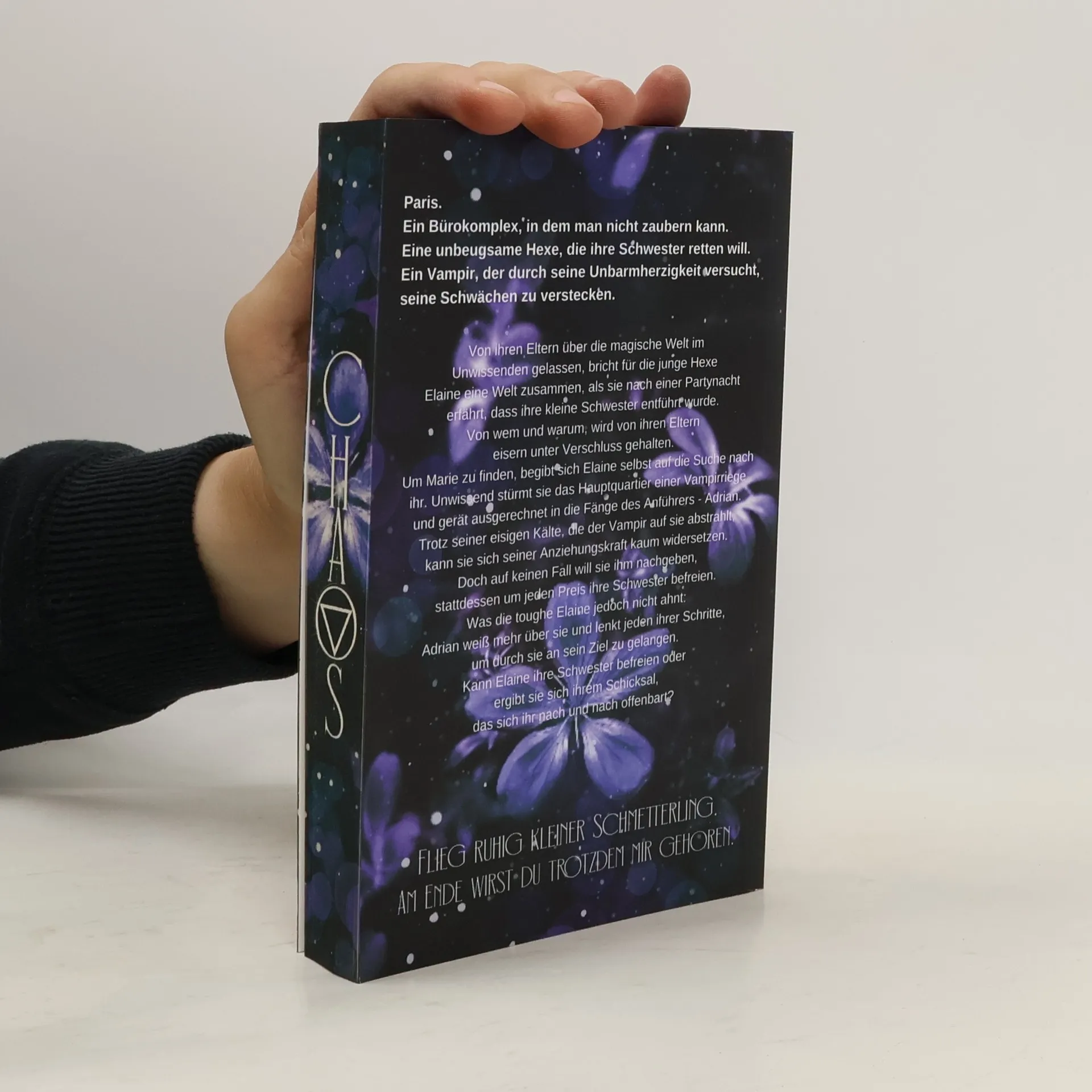 Paris. Ein Bürokomplex, in dem man nicht zaubern kann. Eine unbeugsame Hexe, die ihre Schwester retten will. Ein Vampir, der durch seine Unbarmherzigkeit versucht, seine Schwächen zu verstecken. Von ihren Eltern über die magische Welt im Unwissenden gelassen, bricht für die junge Hexe Elaine eine Welt zusammen, als sie nach einer Partynacht erfährt, dass ihre kleine Schwester entführt wurde. Von wem und warum, wird von ihren Eltern eisern unter Verschluss gehalten. Um Marie zu finden, begibt sich Elaine selbst auf die Suche nach ihr. Unwissend stürmt sie das Hauptquartier einer Vampirriege und gerät ausgerechnet in die Fänge des Anführers - Adrian. Trotz seiner eisigen Kälte, die der Vampir auf sie abstrahlt, kann sie sich seiner Anziehungskraft kaum widersetzen. Doch auf keinen Fall will sie ihm nachgeben, stattdessen um jeden Preis ihre Schwester befreien. Was die toughe Elaine jedoch nicht ahnt: Adrian weiß mehr über sie und lenkt jeden ihrer Schritte, um durch sie an sein Ziel zu gelangen. Kann Elaine ihre Schwester befreien oder ergibt sie sich ihrem Schicksal, das sich ihr nach und nach offenbart? "Flieg ruhig, mein kleiner Schmetterling ... Am Ende wirst du trotzdem mir gehören."