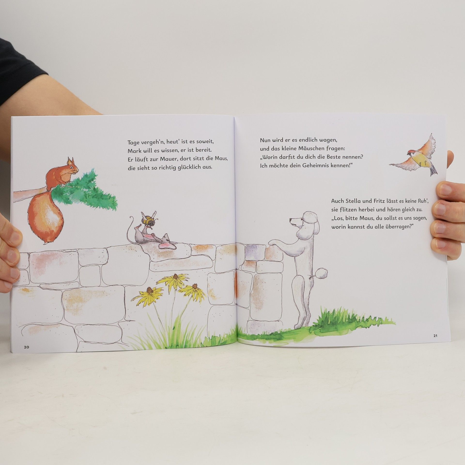 Das Eichhörnchen Mark, der Pudel Stella und der Vogel Fritz fragen sich, warum die Maus so glücklich ist. Alle drei möchten die Besten in ihren Fähigkeiten sein, schaffen es aber nicht und sind traurig. Neugierig machen sie sich auf die Suche nach dem Geheimnis des glücklichen Mäuschens.