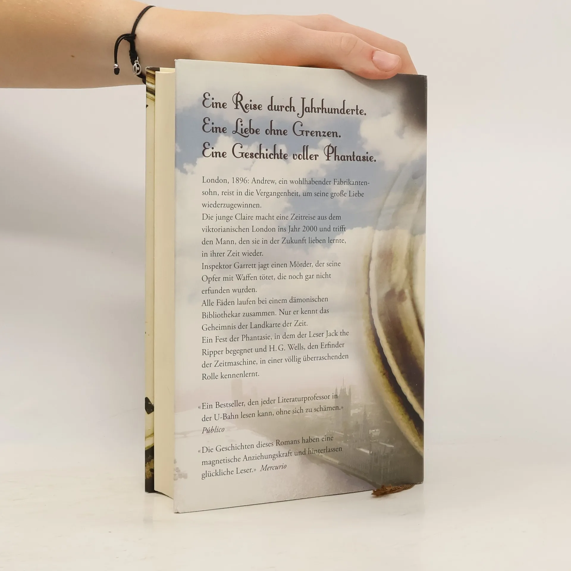 Eine Reise durch Jahrhunderte. Eine Liebe ohne Grenzen. Eine Geschichte voller Phantasie.London, 1896: Andrew, ein wohlhabender Fabrikantensohn, reist in die Vergangenheit, um seine große Liebe wiederzugewinnen. Die junge Claire macht eine Zeitreise aus dem viktorianischen London ins Jahr 2000 und trifft den Mann, den sie in der Zukunft lieben lernte, in ihrer Zeit wieder. Inspektor Garrett jagt einen Mörder, der seine Opfer mit Waffen tötet, die noch gar nicht erfunden wurden. Alle Fäden laufen bei einem dämonischen Bibliothekar zusammen. Nur er kennt das Geheimnis der Landkarte der Zeit. Ein Fest der Phantasie, in dem der Leser Jack the Ripper begegnet und H. G. Wells, den Erfinder der Zeitmaschine, in einer völlig überraschenden Rolle kennenlernt.«Ein Bestseller, den jeder Literaturprofessor in der U-Bahn lesen kann, ohne sich zu schämen.» Público«Die Geschichten dieses Romans haben eine magnetische Anziehungskraft und hinterlassen glückliche Leser.» Mercurio
