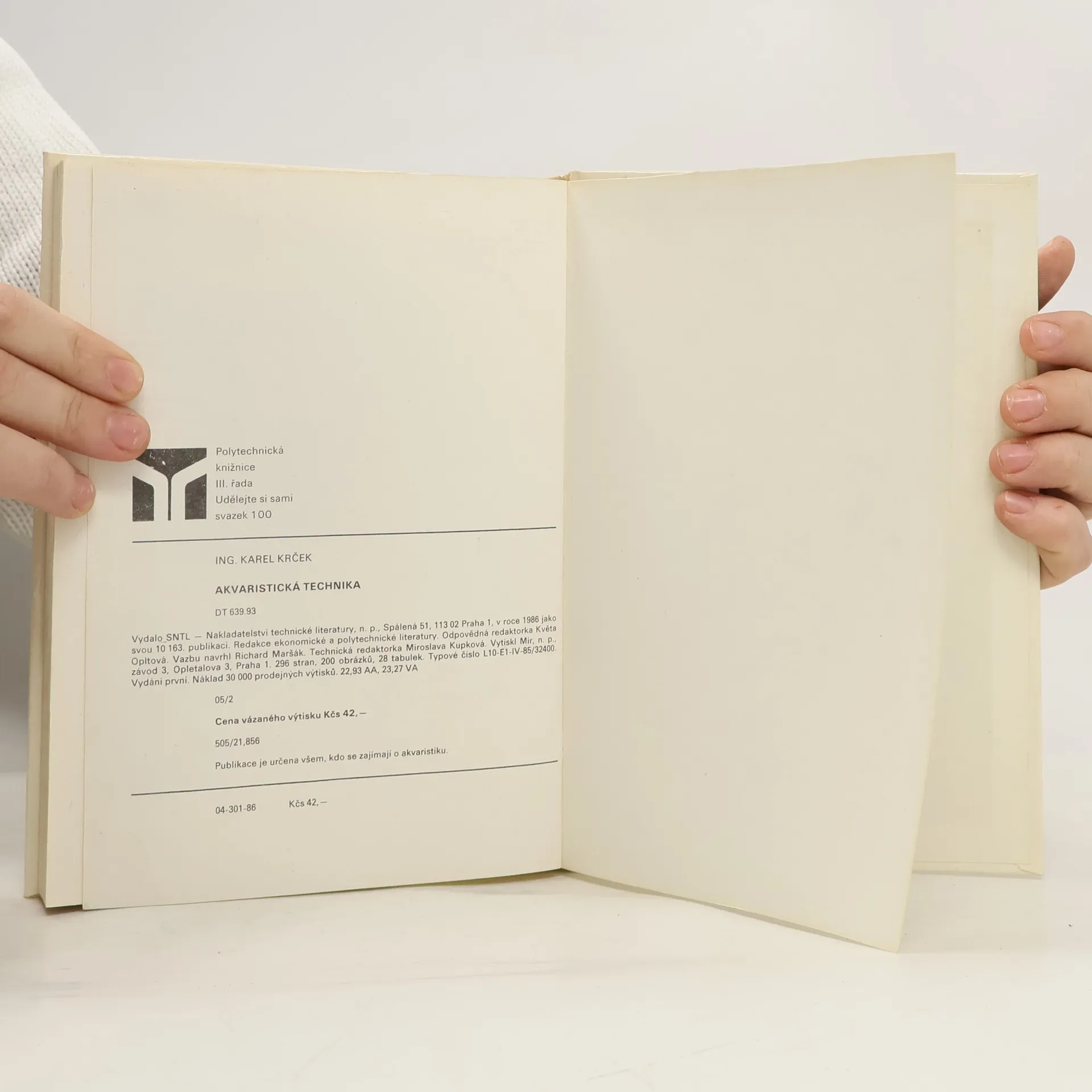 Určeno všem kdo se zajímá o akvaristiku. Kapitoly: Naše dílna, Nádrže a stojany, Voda a "Akvaristická chemie", Filtrace vody v akvaristice, Vodní čerpadla, Technické pomůcky a zařízení použivaná v akvaristice, Máte doma pěstírnu ?, Chov ryb v zahradních bazénech, Fotografování ryb a rostlin v akváriu, Akvaristika ve sběratelství. První vydání. Cena knihy v čase vydání: 42.- Kčs.