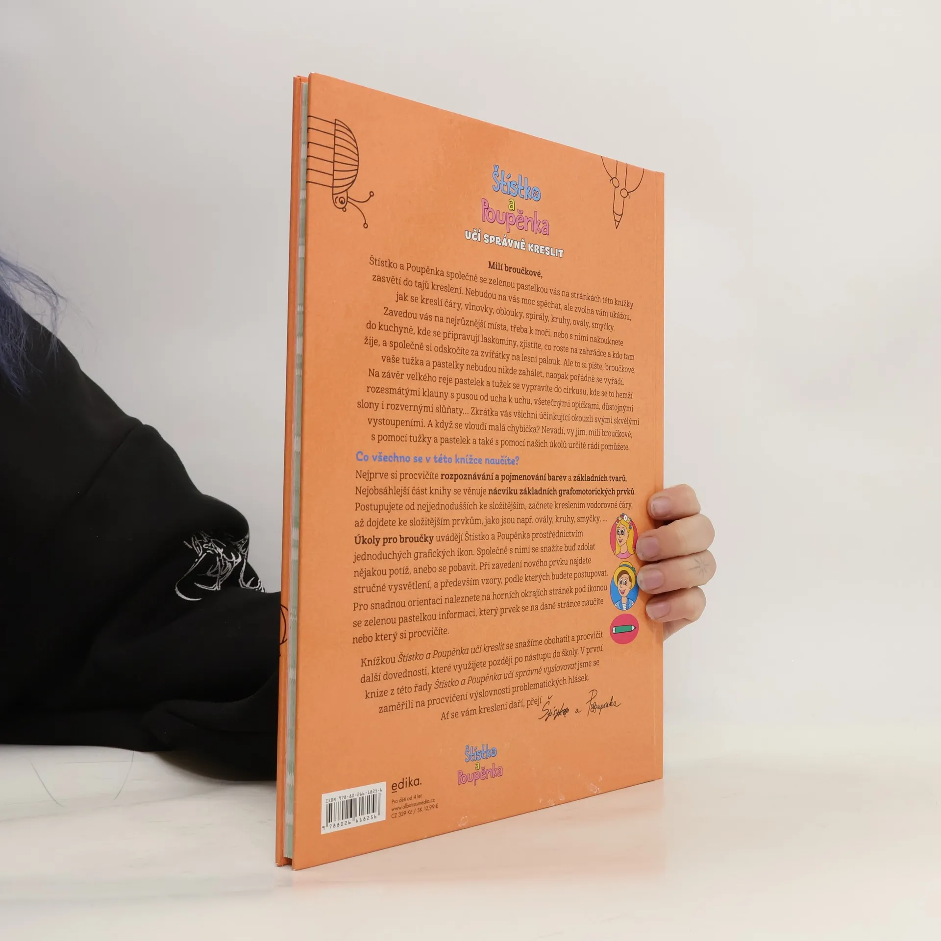 Může být procvičování základních grafomotorických prvků zábava? Štístko a Poupěnka s pomocí zelené pastelky předškolákům a mladším školákům dokážou, že ano. Proč? Protože si sami mohou knížku dotvořit. Zelená pastelka je zasvětí do tajů kreslení a postupně jim ukáže, jak si poradit s čarami, vlnovkami, oblouky, spirálami, kruhy, ovály, smyčkami, … Od lehčích úkolů plynule přejdou k náročnějším – a přitom je s oblíbenou dvojicí čeká spousta legrace!