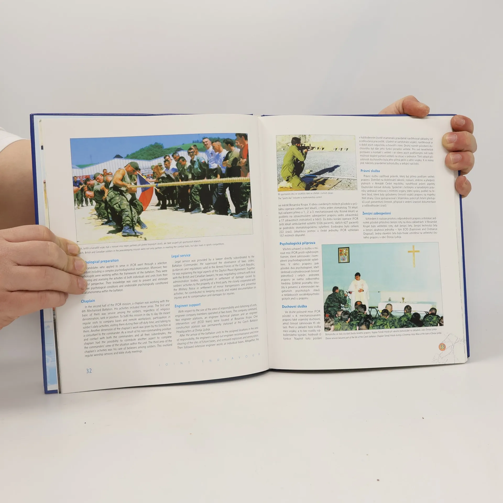 Propagační publikace přibližuje působení českých vojáků v Bosně a Hercegovině v rámci mírových operací NATO. Editor Jarmila Xaverová. Kapitoly zahrnují vzpomínky generálporučíka Karla Kuby na operaci Joint Endeavour, včetně úkolů českého kontingentu v misi IFOR a jeho odpovědnosti. Dále se zaměřuje na odborné služby 6. mechanizovaného praporu AČR, partnerskou spolupráci v rámci IFOR a významné události, které se odehrály během této mise. Následují vzpomínky generálmajora Josefa Šíby z operace Joint Guard, kde se popisují úkoly a činnosti českého praporu v misi SFOR, včetně pomoci místnímu obyvatelstvu a důležitých událostí. Další část se věnuje vzpomínkám brigádního generála Pavla Štefky z operace Joint Forge, která zahrnuje úkoly a odpovědnost českého mechanizovaného praporu v misi SFOR II a jeho pomoc místnímu obyvatelstvu. Publikace také obsahuje informace o velitelích českého kontingentu, hlavních typech výzbroje a techniky a slavnostním ukončení činnosti jednotek AČR v mírové misi SFOR v Bosně a Hercegovině.