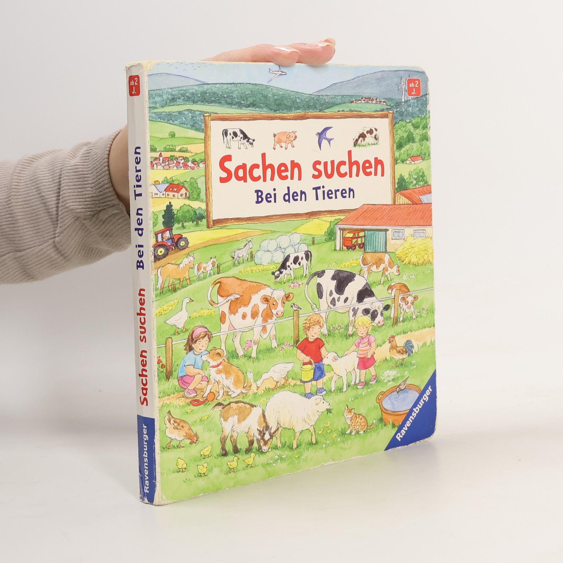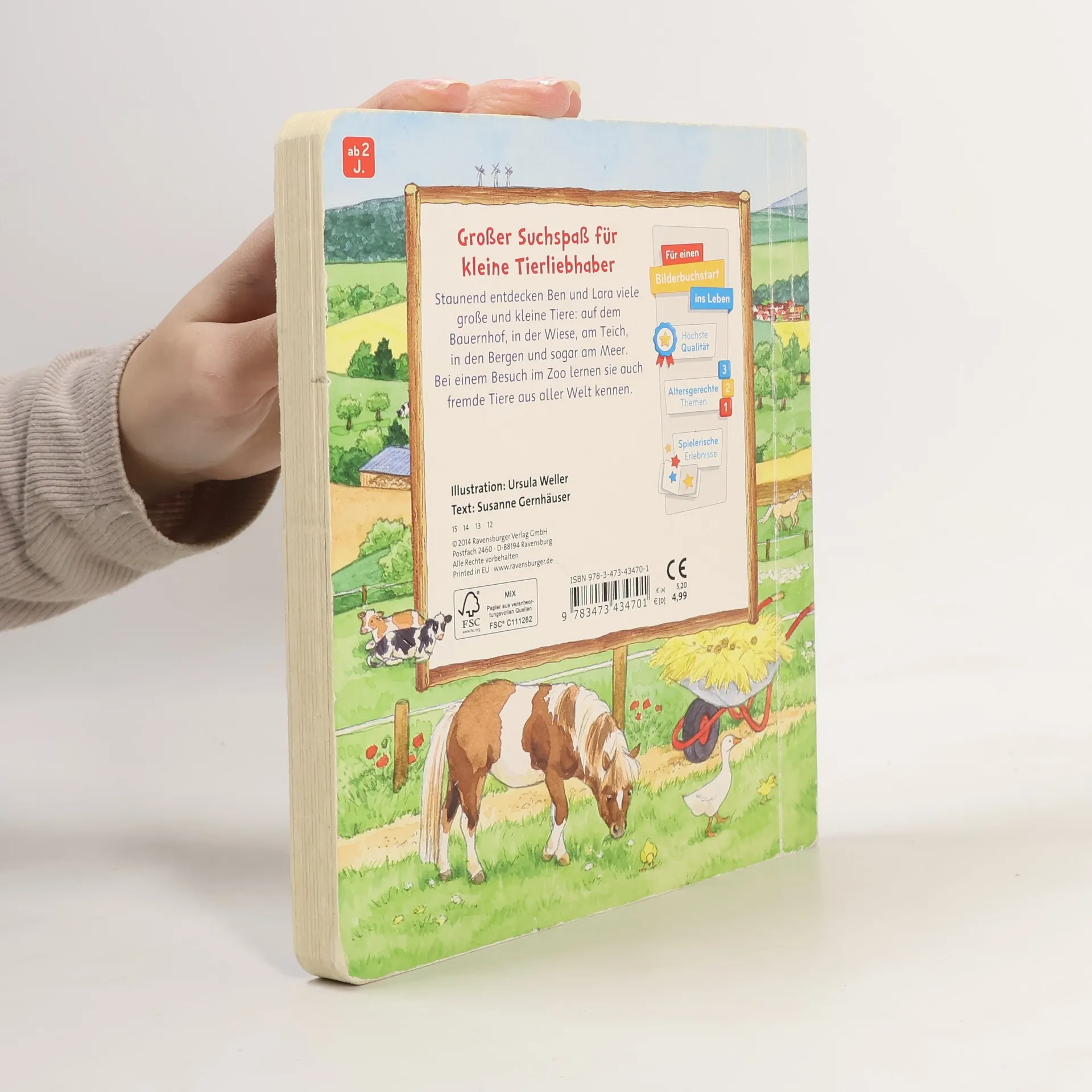 Staunend entdecken Ben und Lara viele heimische Tiere in ihrer Umgebung. Auf dem Bauernhof leben die Kühe, Pferde, Schweine, Hühner und viele andere mehr. In der Wiese kann man zahlreiche Insekten entdecken. Und welche Tiere leben im Wald, in den Bergen und in den Dünen? Zahlreiche Suchbilder helfen beim Benennen der Tiere und laden zum suchen und wiederfinden ein. Ein umfangreiches erstes Tierbilderbuch, das zum ständigen Begleiter für kleine Tierliebhaber wird. Kinder lieben Tiere! Auch wenn sie immer weniger Tiere in ihrem direkten Umfeld erleben, so interessieren sie sich schon sehr früh für ihre Namen und in welcher Umgebung sie leben. Auf 11 realitätsnahen Bildern werden zuerst die Bauernhoftiere, dann die heimischen Vögel und alle Tiere, die am Wasser leben, vorgestellt. Bei einem Blick in die Wiese gibt es allerlei Insekten zu entdecken und beim Besuch im Wald können auch die Rehe und Wildschweine in Ruhe beobachtet werden. Sogar die Tiere, die in den Bergen oder in den Dünen wohnen, bekommen einen Namen. Bei einem Besuch im Zoo gibt es dazu noch die wilden Tiere aus aller Welt zu sehen. Zahlreiche Suchbilder fordern zum genauen Hinsehen auf und laden zum Wiederfinden der kleinen Bilder ein.