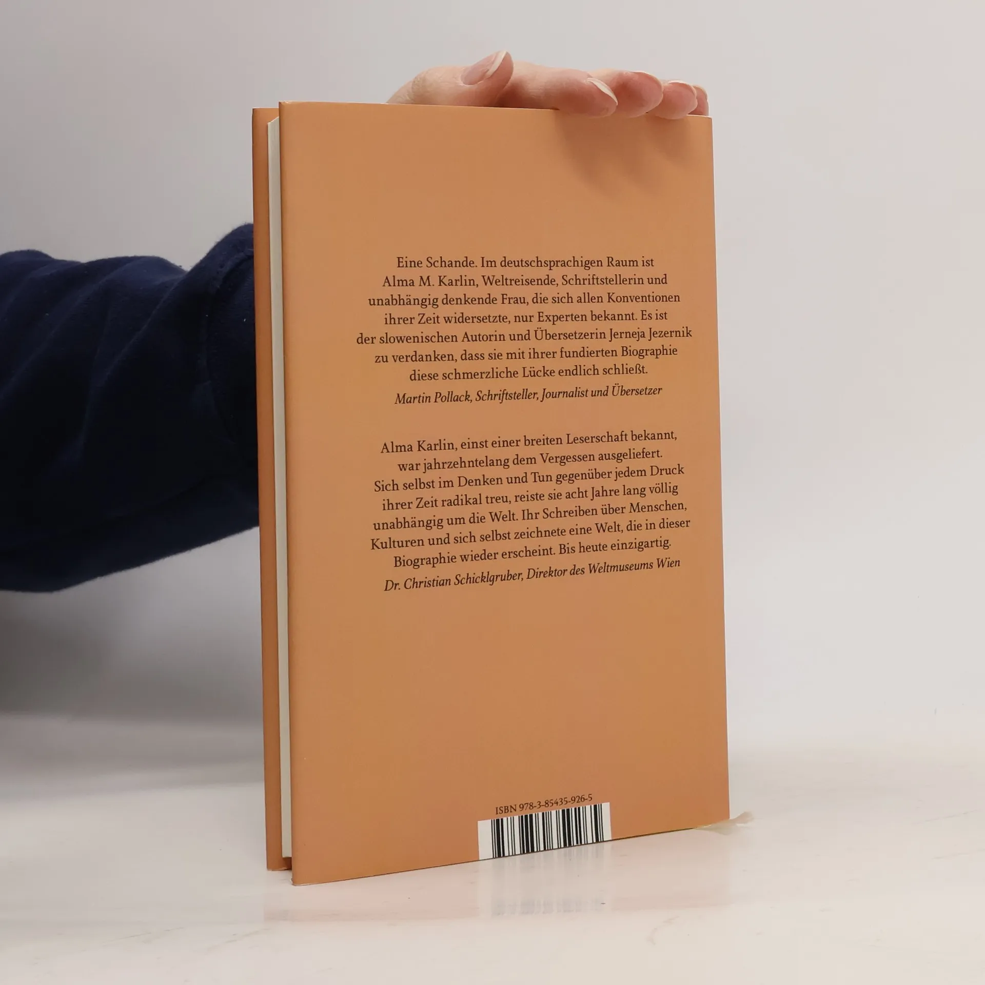 „Alma M. Karlin – Mit Bubikopf und Schreibmaschine um die Welt“ ist die erste deutsche Biographie in 10 Kapiteln über das Leben und Werk einer der größten Weltreisenden und deutschsprachigen Schriftstellerin Alma M. Karlin (1889–1950) aus Celje, Slowenien. Nach einer unglücklichen Kindheit in der zweisprachigen untersteiermärkischen Provinzstadt am Sann in der alten k. und k. Monarchie entflieht sie dem kleinbürgerlichen Milieu und geht 1908 nach London. Dort arbeitet sie in einem Übersetzungsbüro, legt 1914 Prüfungen in Norwegisch, Schwedisch, Dänisch, Englisch, Französisch, Spanisch, Italienisch und Russisch ab. Am 24. November 1919 verlässt sie mit dem Reisepass ihrer neuen Heimat, des Königreichs der Serben, Kroaten und Slowenen, den Cillier Bahnhof und bereist bzw. berührt in den Jahren 1919–1927 als allein reisende Frau alle Kontinente. Mit dabei im Koffer sind ihre Schreibmaschine Marke Erika und ihr handgeschriebenes Wörterbuch in zehn Sprachen. Acht Jahre lang ist sie unterwegs, einzig im Vertrauen auf die eigenen Fähigkeiten, sich überall auf der Welt durchs Unterrichten und Dolmetscherdienste als auch journalistische und belletristische Arbeit Verdienstmöglichkeiten zu verschaffen. Sie überschreitet nicht nur geographische Grenzen, sondern auch die der Gesellschaftskonventionen, indem sie die Welt als Frau, Künstlerin und Forscherin auf ihre eigene Art „erleben“ will.