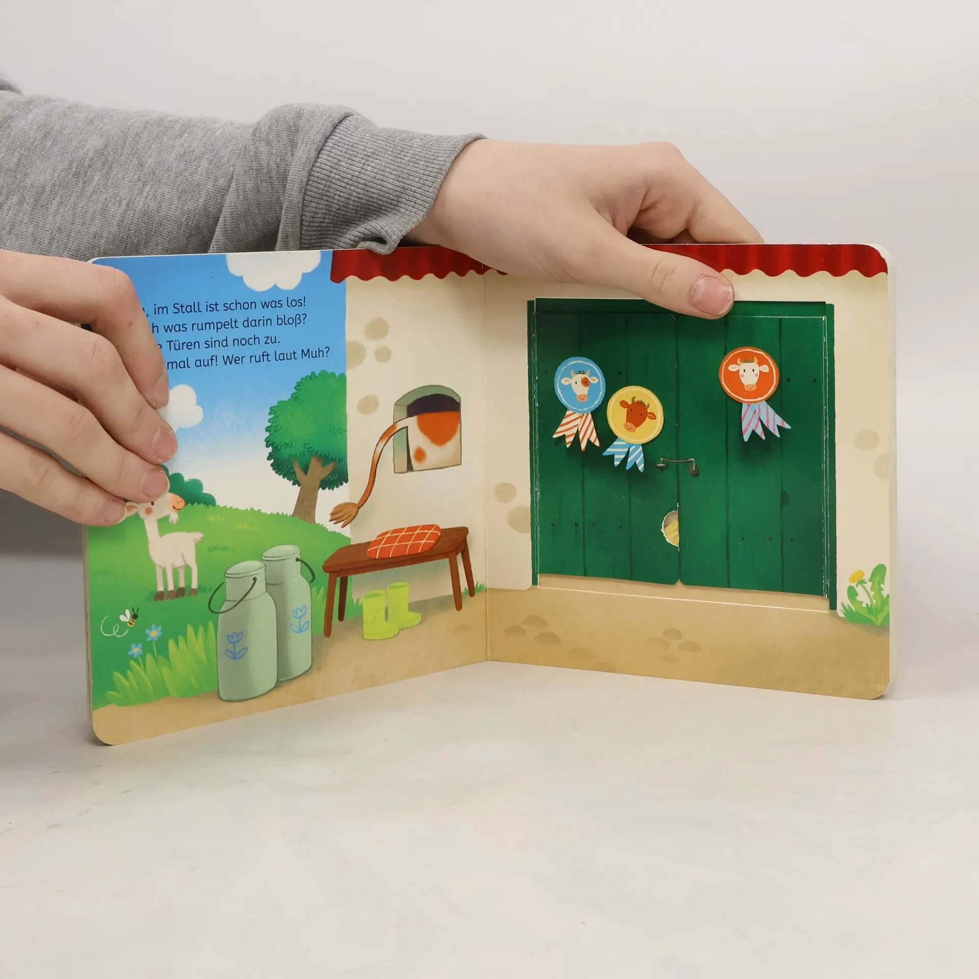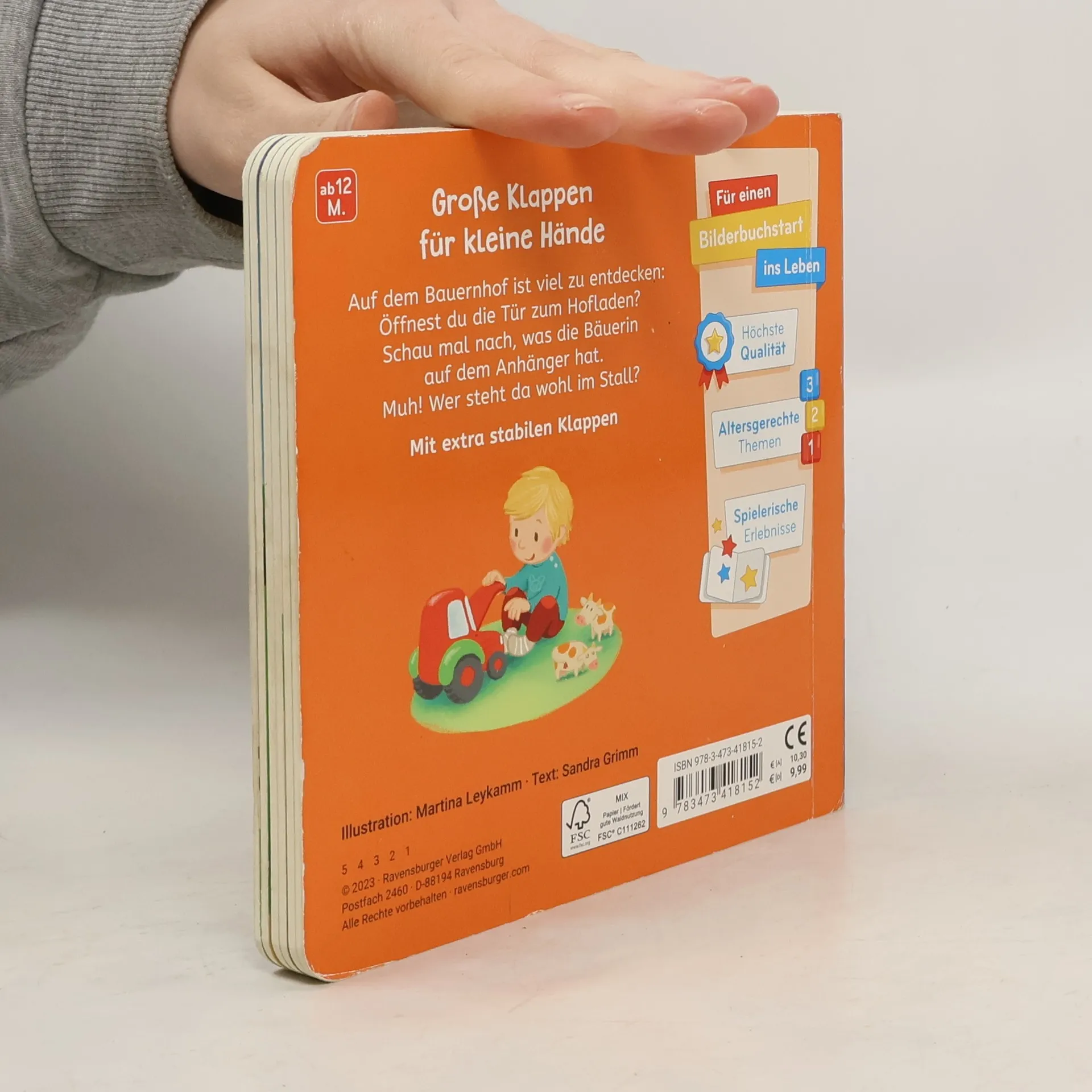 Bauernhof-Spielbuch mit Klappen ab 12 Monaten Auf dem Bauernhof ist viel los: Hinter jeder Klappe sind spannende Tiere zu entdecken: Muh – wer steht hier im Stall? Wen hat die Bäuerin auf dem Anhänger? Und wer piepst im Hühnerhaus? Ein tolles Bauernhof-Buch mit überraschenden Kuckuck-Effekten. Die fröhlichen Bilder und extra-dicken Klappen sind ideal geeignet für Kinder ab 12 Monaten. Auf jeder Seite gibt es einen kurzen Reim, der eine kleine Geschichte erzählt und zum Öffnen der Klappe auffordert. Die Klappen bestehen aus besonders dickem Material. So sind sie extra-stabil und perfekt für kleine Hände. Die Klappen lassen sich kinderleicht öffnen und fallen ganz allein wieder zu: So beginnt das Kuckuck-Spiel immer wieder von vorne! Großer Spielspaß für die Kleinen, der ganz nebenbei die Feinmotorik trainiert.