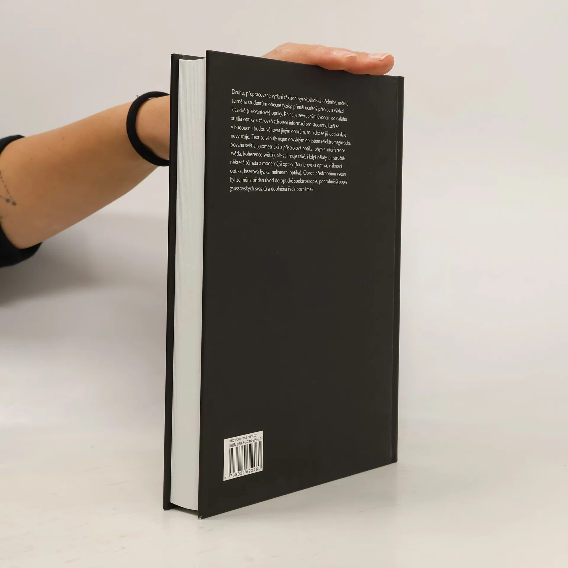 Druhé, přepracované vydání základní vysokoškolské učebnice, určené zejména studentům obecné fyziky, přináší ucelený přehled a výklad klasické (nekvantové) optiky. Kniha by měla být zevrubným úvodem do dalšího studia optiky a zároveň zdrojem informací pro studenty, kteří se v budoucnu budou věnovat jiným oborům, na nichž se již optika dále nevyučuje. Text se věnuje nejen obvyklým oblastem (elektromagnetická povaha světla, geometrická a přístrojová optika, ohyb a interference světla, koherence světla), ale zahrnuje také, i když někdy jen stručně, některá témata z modernější optiky (fourierovská optika, vláknová optika, laserová fyzika, nelineární optika). Oproti předchozímu vydání byl především rozšířen výklad gaussovských svazků a doplněn odstavec uvádějící základy optické spektroskopie.