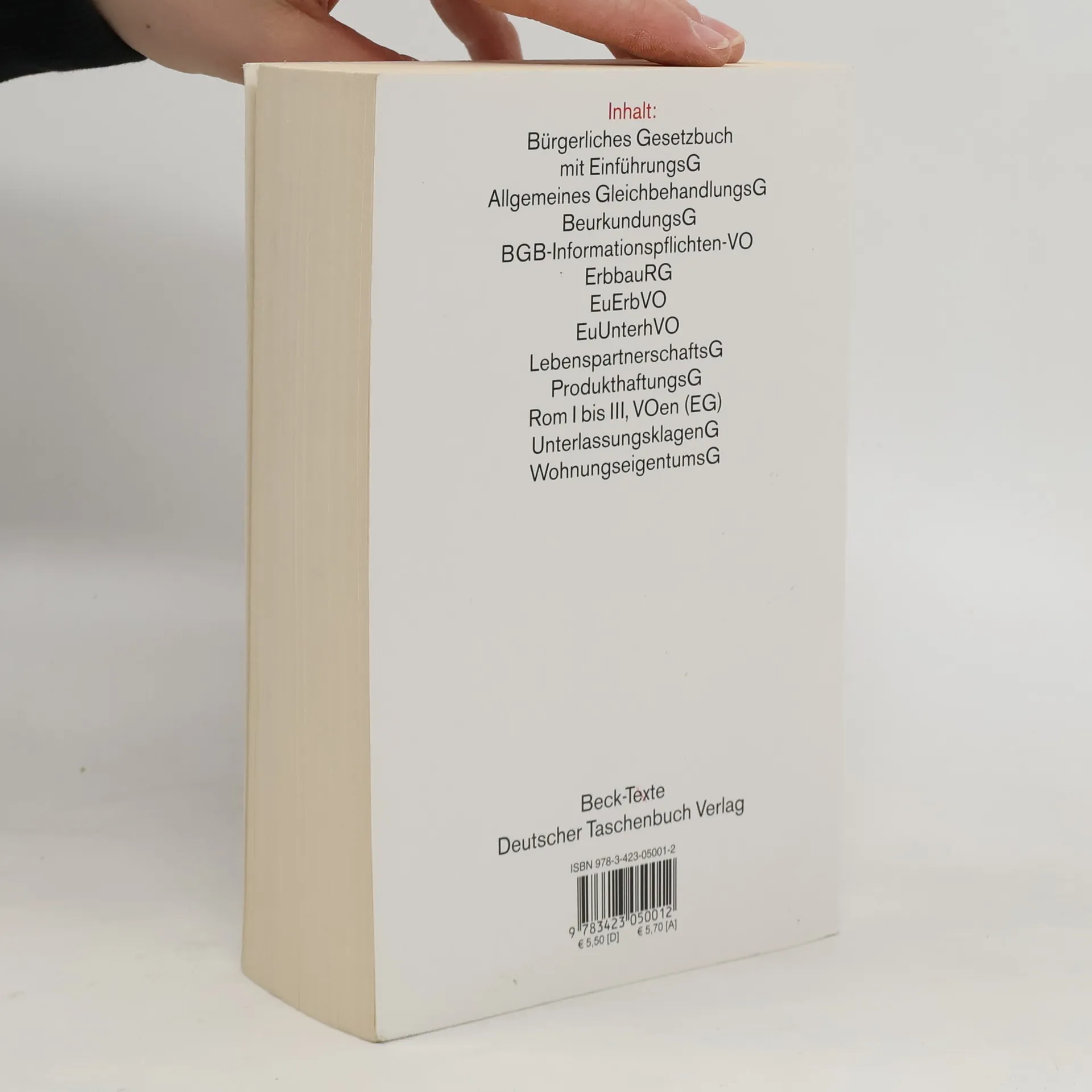 Bürgerliches Gesetzbuch mit EinführungsG, Allgemeines GleichbehandlungsG, BeurkundungsG, BGB-Informationspflichten-VO, ErbbaurechtsG, LebenspartnerschaftsG, ProdukthaftungsG, Rom I und II, VOen (EG), UnterlassungsklagenG, WohnungseigentumsG. Die Neuauflage enthält insbesondere textliche Bereinigungen und den neuen ab 1.1.2012 geltenden Basiszinssatz.