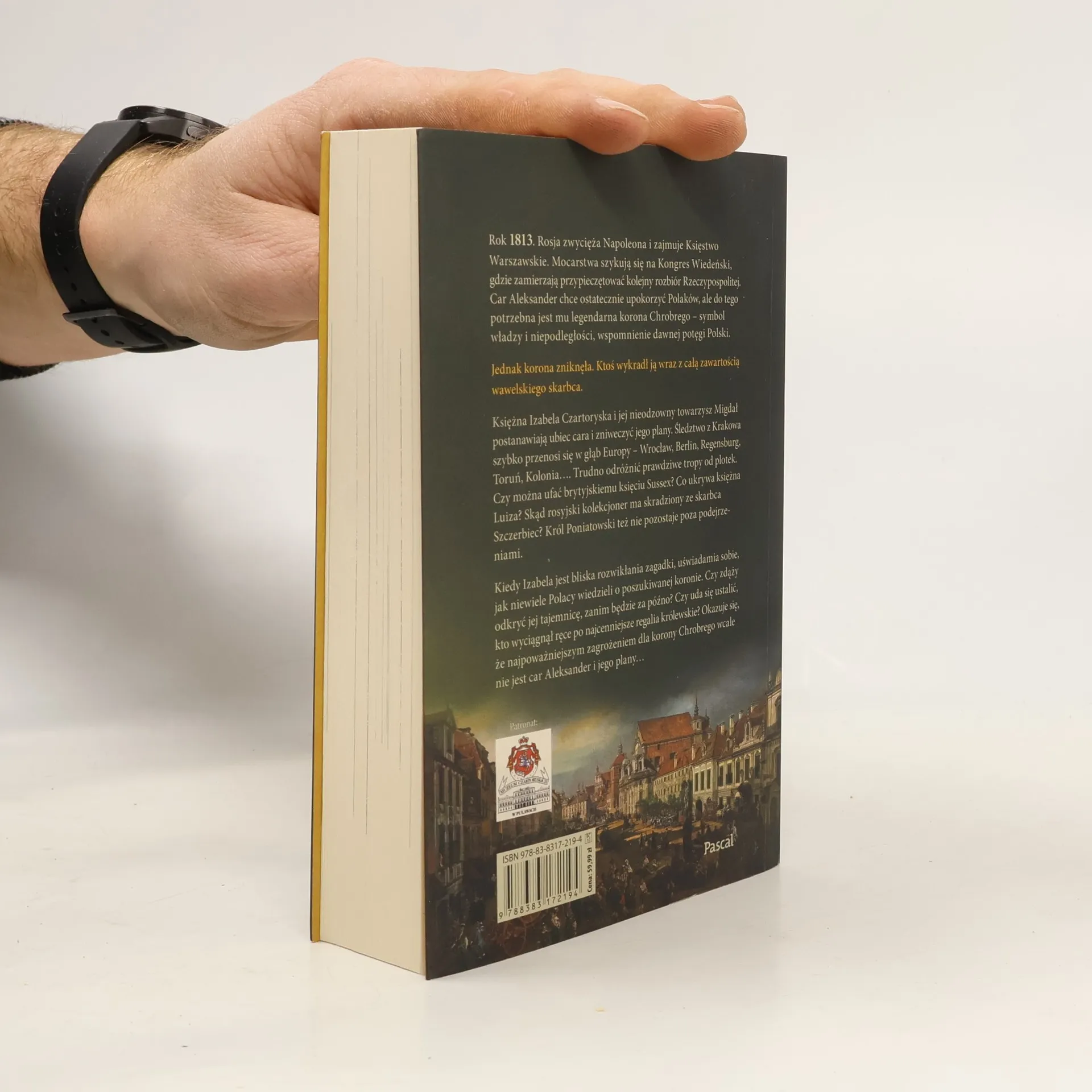Rok 1813. Rosja zwycięża Napoleona i zajmuje Księstwo Warszawskie. Mocarstwa szykują się na Kongres Wiedeński, gdzie zamierzają przypieczętować kolejny rozbiór Rzeczypospolitej. Car Aleksander chce ostatecznie upokorzyć Polaków, ale do tego potrzebna jest mu legendarna Korona Chrobrego -symbol władzy i niepodległości, wspomnienie dawnej potęgi Polski. Jednak korona zniknęła. Ktoś wykradł ją wraz z całą zawartością wawelskiego skarbca. Księżna Izabela Czartoryska i jej nieodzowny towarzysz Migdał postanawiają ubiec cara i zniweczyć jego plany. Śledztwo z Krakowa szybko przenosi się w głąb Europy - Wrocław, Berlin, Regensburg, Toruń, Kolonia. Trudno odróżnić prawdziwe tropy od plotek. Czy można ufać brytyjskiemu księciu Sussex? Co ukrywa księżna Luiza? Skąd rosyjski kolekcjoner ma skradziony ze skarbca Szczerbiec? Król Poniatowski też nie pozostaje poza podejrzeniami. Kiedy Izabela jest bliska rozwikłania zagadki, uświadamia sobie, jak niewiele Polacy wiedzieli o poszukiwanej koronie. Czy zdąży odkryć jej tajemnicę, zanim będzie za późno? Czy uda się ustalić, kto wyciągnął ręce po najcenniejsze regalia królewskie? Okazuje się, że najpoważniejszym zagrożeniem dla korony Chrobrego wcale nie jest car Aleksander i jego plany