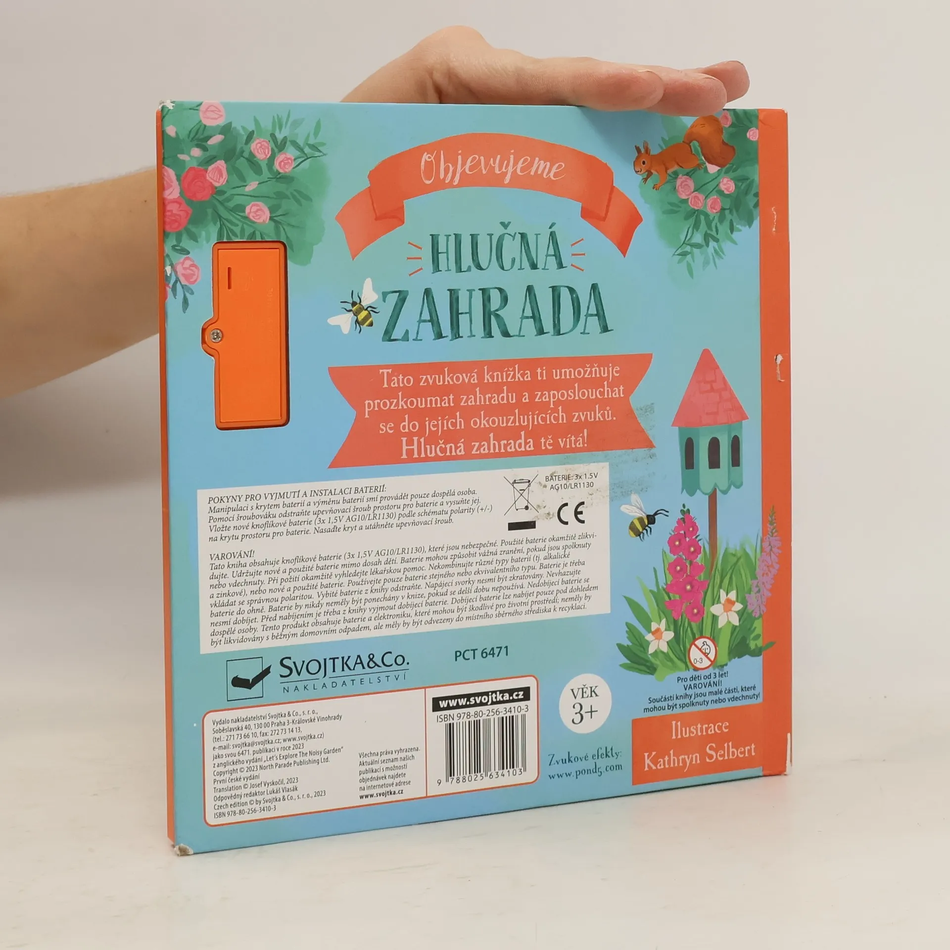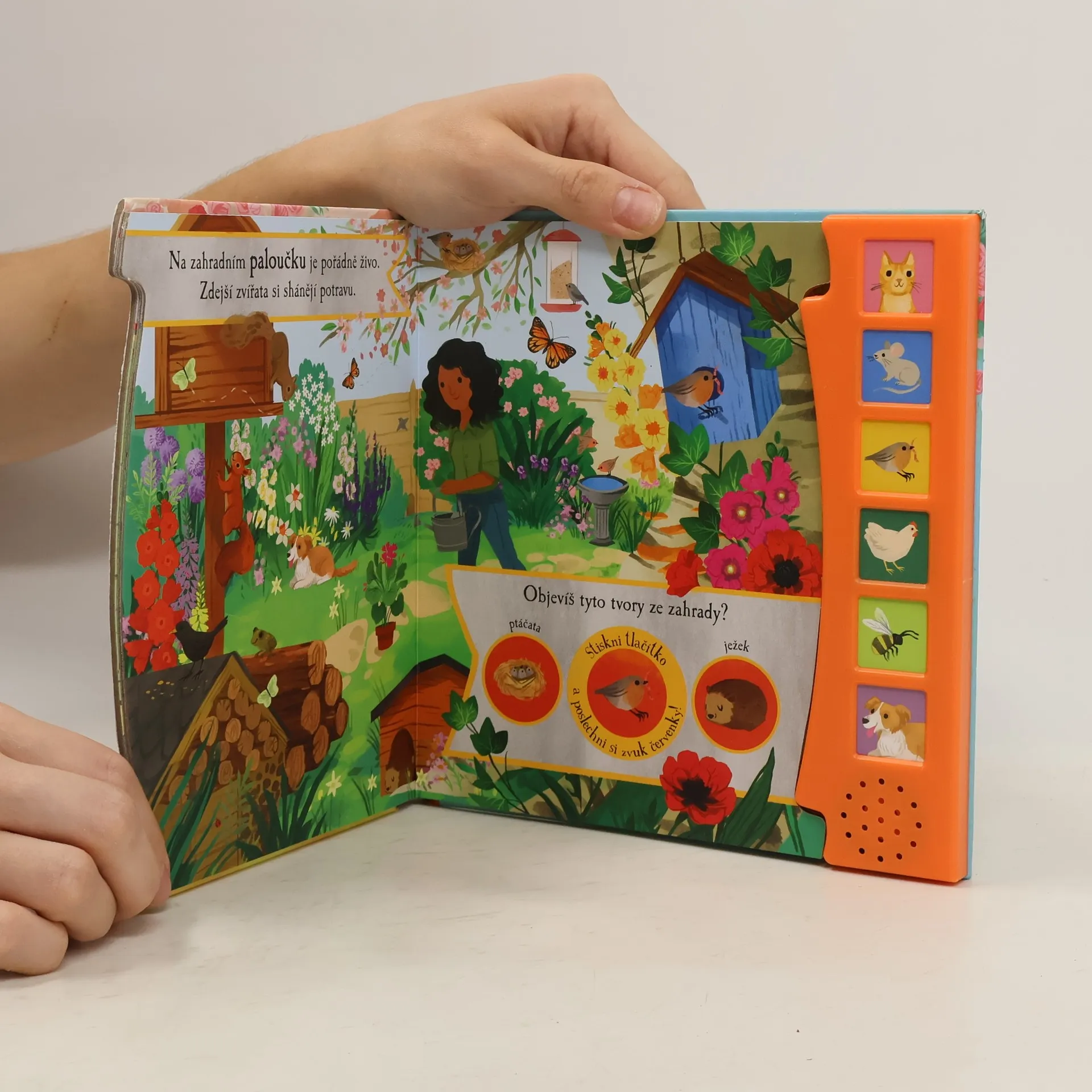 Zahrada je místo, kde můžeš stále něco objevovat a prožívat drobná dobrodružství. Zkus najít neposedné motýlky, zjisti, kde bydlí včely, nebo najdi místo, kam se slétávají hrdličky. V knize najdeš 6 zvuků, které tě přenesou do hlučné zahrady. Jednoduché popisky ti představí zahradu a její obyvatele. Poslouchej, objevuj a prozkoumávej!