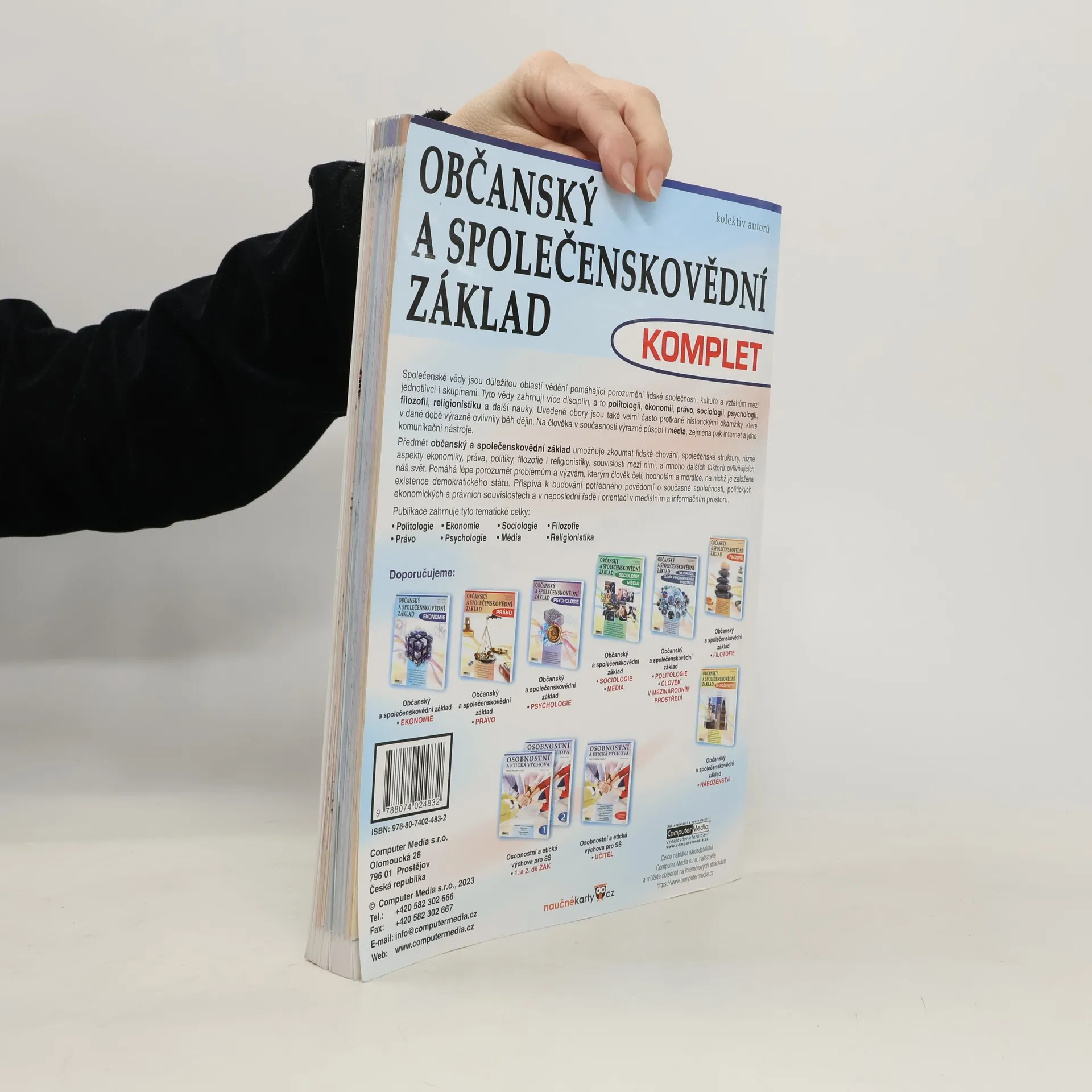 Učebnice Občanský a společenskovědní základ - KOMPLET v jediné knize pokrývá kompletní učivo tohoto předmětu. Plně odpovídá požadavkům RVP MŠMT. Je ideálním materiálem pro přípravu k maturitě. Obsahuje aktuální informace, je vizuálně atraktivně zpracovaná, srozumitelná a přehledná. Text je doplněn o velké množství názorných schémat, mapek, obrázků, grafů, tipů, zajímavostí a souvislostí. Učebnice navíc nabízí odkazy na doplňující informace formou QR kódů pro mobilní telefon. Studenti tak mohou k jednotlivým tématům okamžitě získat například související videa nebo další informační zdroje. Studium se díky tomu stává přitažlivější a zajímavější. Publikace zahrnuje tyto tematické celky: Politologie Právo Ekonomie Psychologie Sociologie Média Filozofie Religionistika