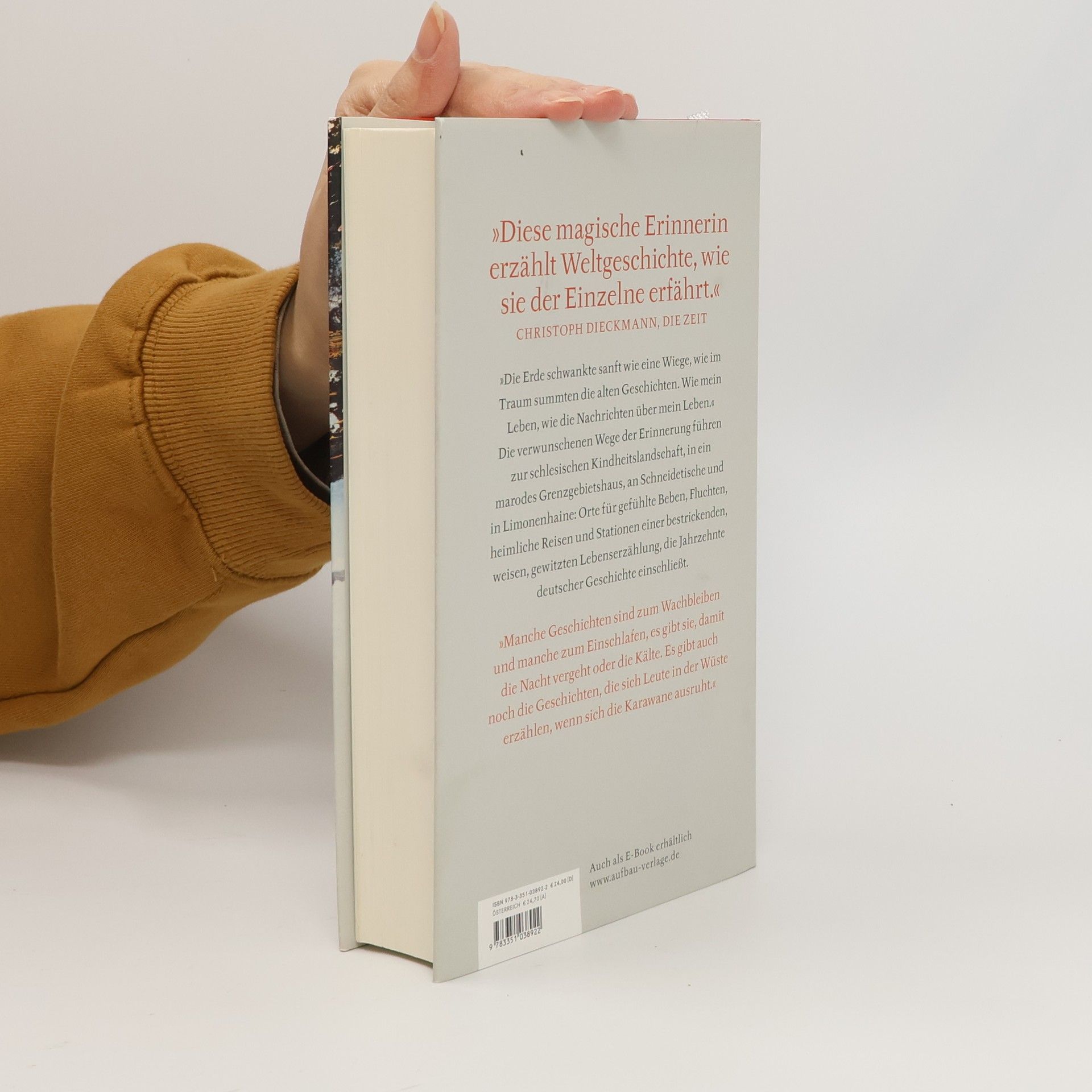 „Diese magische Erinnerin erzählt Weltgeschichte, wie sie der Einzelne erfährt.“ Christoph Dieckmann, Die Zeit. „Die Erde schwankte sanft wie eine Wiege, wie im Traum summten die alten Geschichten. Wie mein Leben, wie die Nachrichten über mein Leben.“ Die verwunschenen Wege der Erinnerung führen zur schlesischen Kindheitslandschaft, in ein marodes Grenzgebietshaus, an Schneidetische und in Limonenhaine: Orte für gefühlte Beben, Fluchten, heimliche Reisen und Stationen einer bestrickenden, weisen, gewitzten Lebenserzählung, die Jahrzehnte deutscher Geschichte einschließt. „Manche Geschichten sind zum Wachbleiben und manche zum Einschlafen, es gibt sie, damit die Nacht vergeht oder die Kälte. Es gibt auch noch die Geschichten, die sich Leute in der Wüste erzählen, wenn sich die Karawane ausruht.“ "Es ist die große Kunst von Helga Schütz, das Politische beiläufig und nebenbei mitzuerzählen." Jörg Magenau, SZ. "Ihre schwebende Prosa trifft ins Herz." Freie Presse.