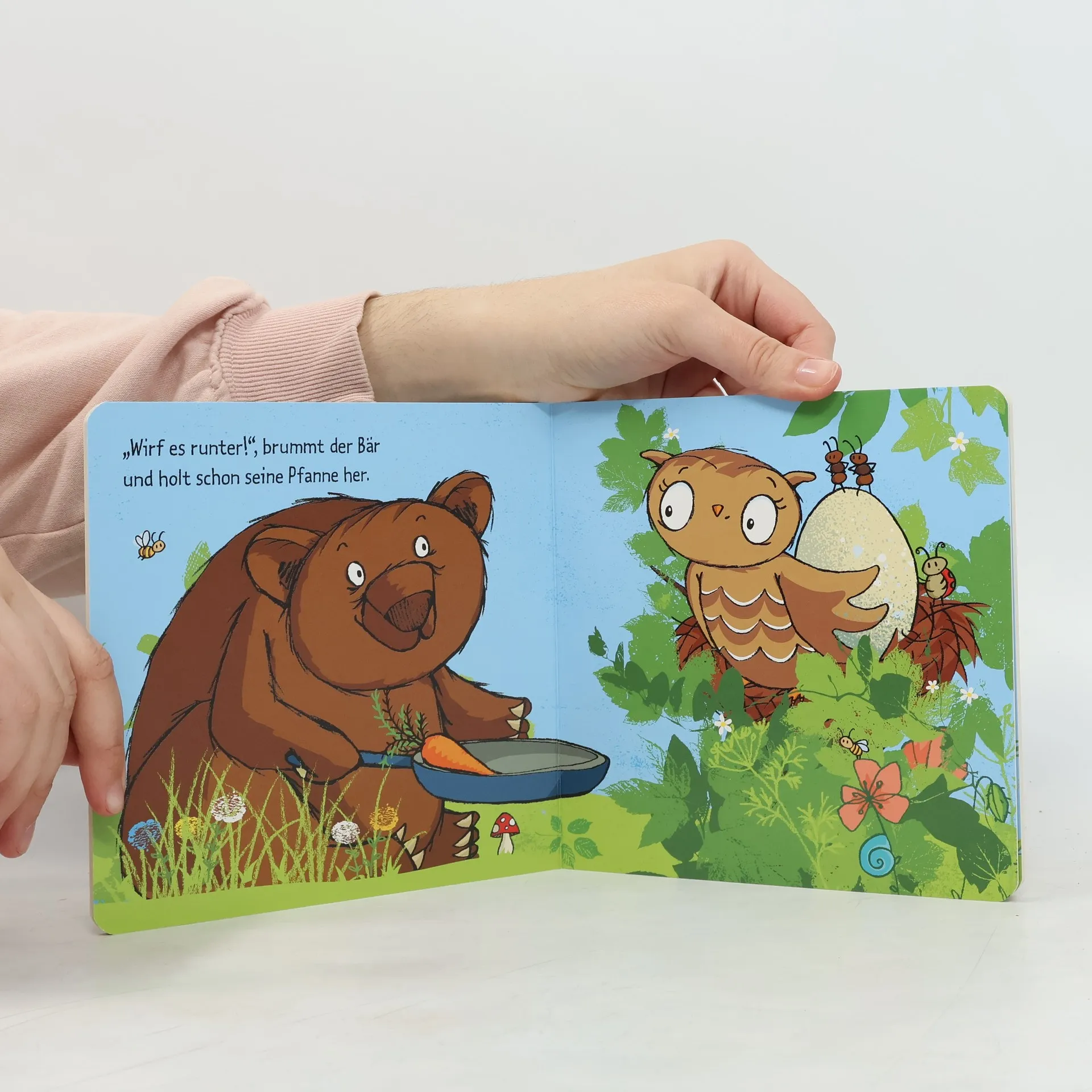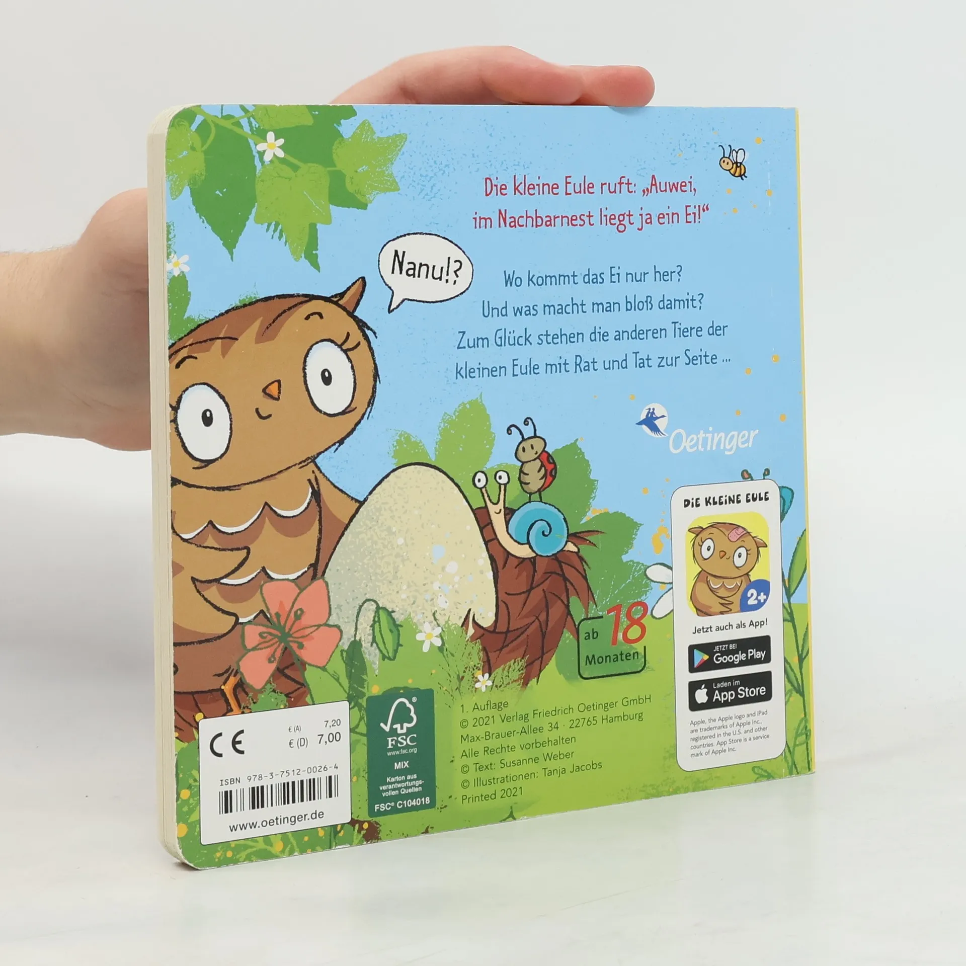 "Neugierige kleine Eule: Was versteckt sich im großen Ei?Die kleine Eule ruft: "Auwei, im Nachbarnest liegt ja ein Ei!" Woher kommt es? Und was ist zu tun? Der Hase, der Bär und die Schmetterlinge haben die verschiedensten Ideen, aber nur der Spatz weiß: Man muss das Ei wärmen. Und, knack - da passiert es: Ein kleines Küken schlüpft heraus. Hurra!" -- Various websites