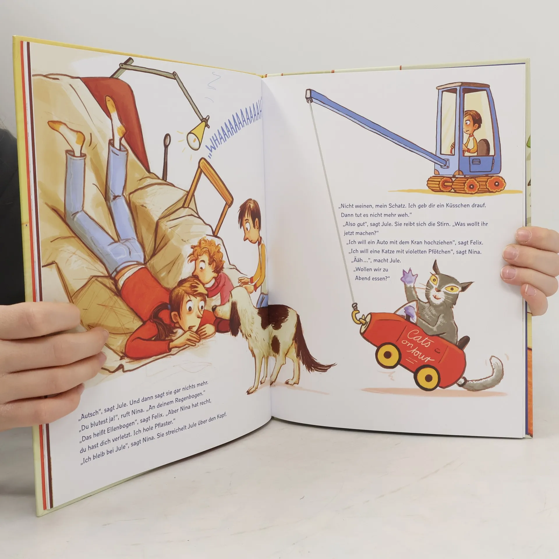 Das erste Bilderbuch zum wichtigen Alltagsthema Babysitting – für alle Kinder ab 3 Jahren. Heute kommt Jule, sie ist die neue Babysitterin. Die Aufregung ist groß. Felix und seine kleine Schwester Nina wollen am liebsten mit Jule in einer Rakete zum Mond fliegen oder einen Gorilla streicheln. Die Zeit verfliegt und die Abenteuer nehmen gar kein Ende. Selbst für ein großes Malheur hat Jule die Lösung. Und umgekehrt wissen Felix und Nina zum Glück, wie sie Jule trösten können. Eine humorvoll verdrehte Geschichte über zwei starke Kinder, die ihre Babysitterin lieben und es genießen, dass sie für sie da ist. Originell und humorvoll erzählt von Anna Woltz. Großartig illustriert von Regina Kehn.