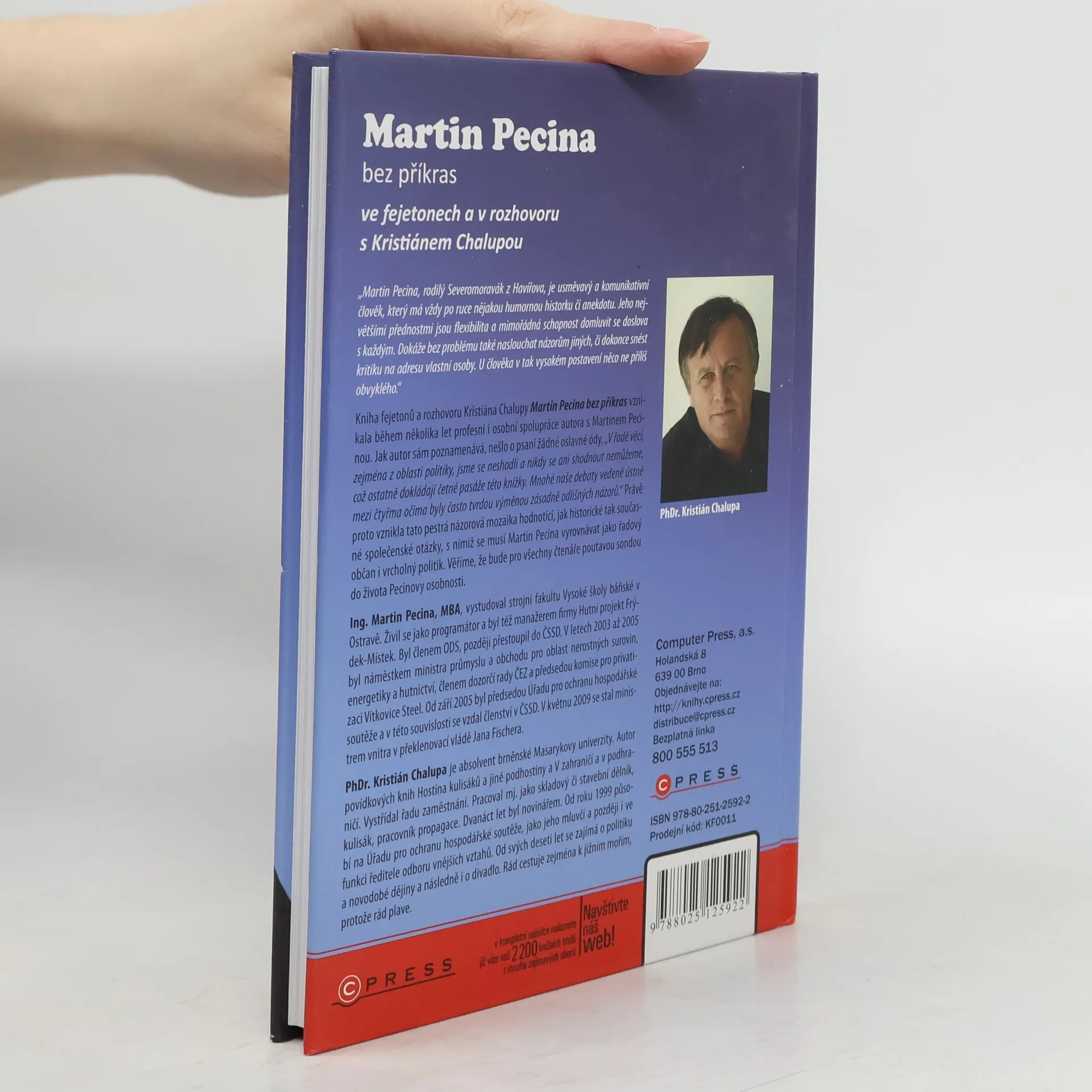Martin Pecina, rodilý Severomoravák z Havířova, je usměvavý a komunikativní člověk, který má vždy po ruce nějakou humornou historku či anekdotu. Jeho největšími přednostmi jsou fl exibilita a mimořádná schopnost domluvit se doslova s každým. Dokáže bez problému také naslouchat názorům jiných, či dokonce snést kritiku na adresu vlastní osoby. U člověka v tak vysokém postavení něco ne příliš obvyklého.“ Kniha fejetonů a rozhovoru Kristiána Chalupy Martin Pecina bez příkras vznikala během několika let profesní i osobní spolupráce autora s Martinem Pecinou. Jak autor sám poznamenává, nešlo o psaní žádné oslavné ódy. „V řadě věcí, zejména z oblasti politiky, jsme se neshodli a nikdy se ani shodnout nemůžeme, což ostatně dokládají četné pasáže této knížky. Mnohé naše debaty vedené ústně mezi čtyřma očima byly často tvrdou výměnou zásadně odlišných názorů.“ Právě proto vznikla tato pestrá názorová mozaika hodnotící, jak historické tak současné společenské otázky, s nimiž se musí Martin Pecina vyrovnávat jako řadový občan i vrcholný politik. Věříme, že bude pro všechny čtenáře poutavou sondou do života Pecinovy osobnosti.