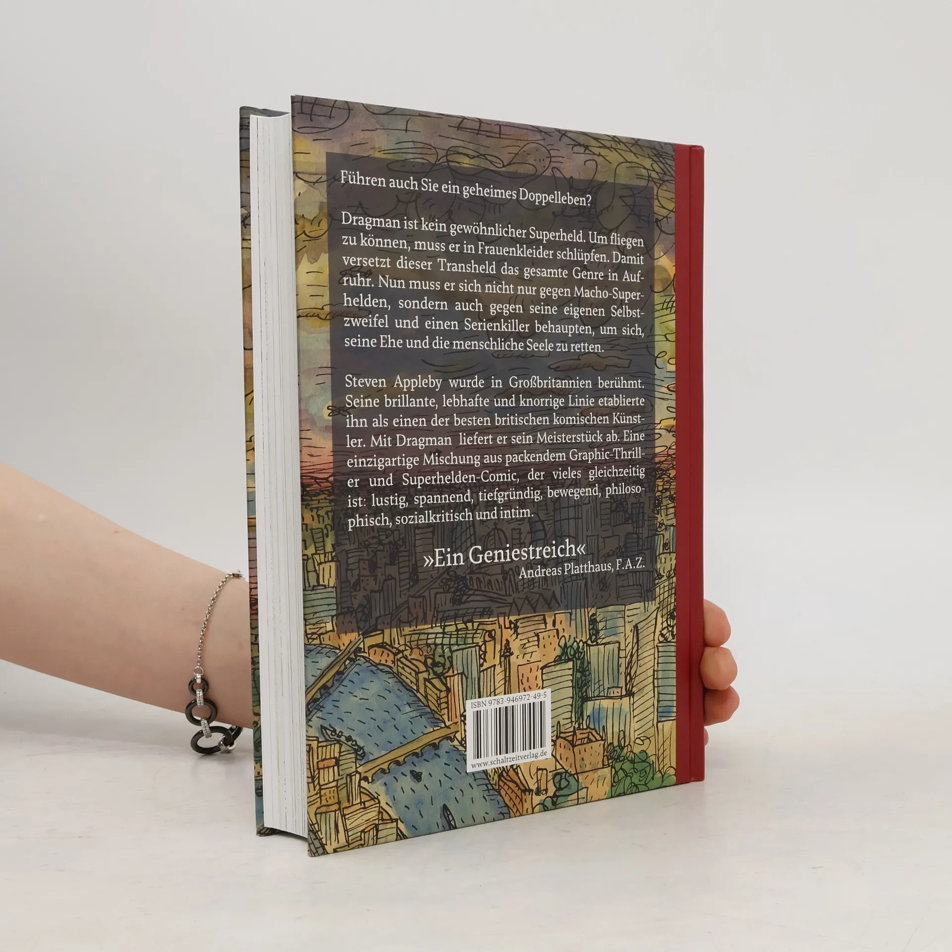 Von "Britanniens beliebtestem Comic-Künstler" stammt ein Superhelden-Epos wie kein anderes – ein gewöhnlicher Mann erhält Superkräfte, indem er Frauenkleidung trägt, und rettet London und vielleicht sogar sich selbst. August Crimp kann fliegen, aber nur, wenn er Frauenkleidung trägt. Hoch über einer wunderschönen, üppigen Aussicht auf London schwebt er als Dragman, fängt fallende Personen, verlorene Seelen und gelegentlich eine gestrandet Katze. Nachdem er von der Superhelden-Establishment abgelehnt wird, wo maskierte Männer eher nach Werbeverträgen als nach Verbrechern jagen, packt August stillschweigend sein Kleid und seine Kosmetik ein und zieht sich in die Normalität zurück – zu einer Frau und einem Sohn, die nichts von seinen Abenteuern oder Neigungen wissen. Als eine technologische Innovation es den Menschen ermöglicht, ihre Seelen zu verkaufen, tun sie dies massenhaft und werden leer, grausam und hoffnungslos. August hat Angst, enttarnt zu werden, fühlt sich jedoch gezwungen, Dragman zurückzubringen, als Cherry, seine junge Nachbarin, ihn bittet, ihre Eltern zu retten. Kann Dragman die Kräfte hinter diesem schrecklichen neuen Schwarzmarkt besiegen? Kann August Dragman annehmen und aus den Schatten treten?