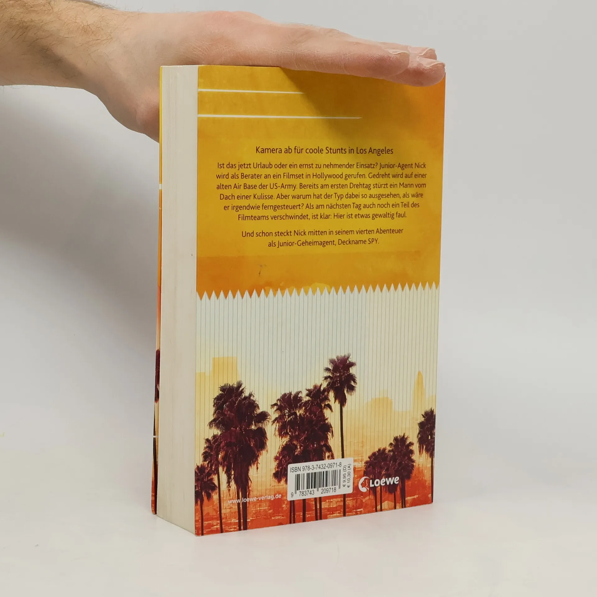 Kamera ab für coole Stunts in Los Angeles Ist das jetzt Urlaub oder ein ernstzunehmender Einsatz? Junior-Agent Nick wird als Berater an ein Filmset in Hollywood gerufen. Gedreht wird auf einer alten Air Base der US-Army. Bereits am ersten Drehtag stürzt ein Mann vom Dach einer Kulisse. Aber warum hat der Typ dabei so ausgesehen, als wäre er irgendwie ferngesteuert? Als am nächsten Tag fast das ganze Filmteam verschwindet, ist klar: Hier ist etwas gewaltig faul. Und schon steckt Nick mitten in seinem vierten Abenteuer als Junior-Geheimagent, Deckname SPY. Im neuen Teil der Abenteuer-Reihe schicken Bestsellerautor Arno Strobel und Nina Scheweling Nick zu seinem nächsten Auftrag nach Hollywood . Ein turboschnelles, actionreiches Abenteuer und ideales Lesefutter für Jungen und Mädchen .