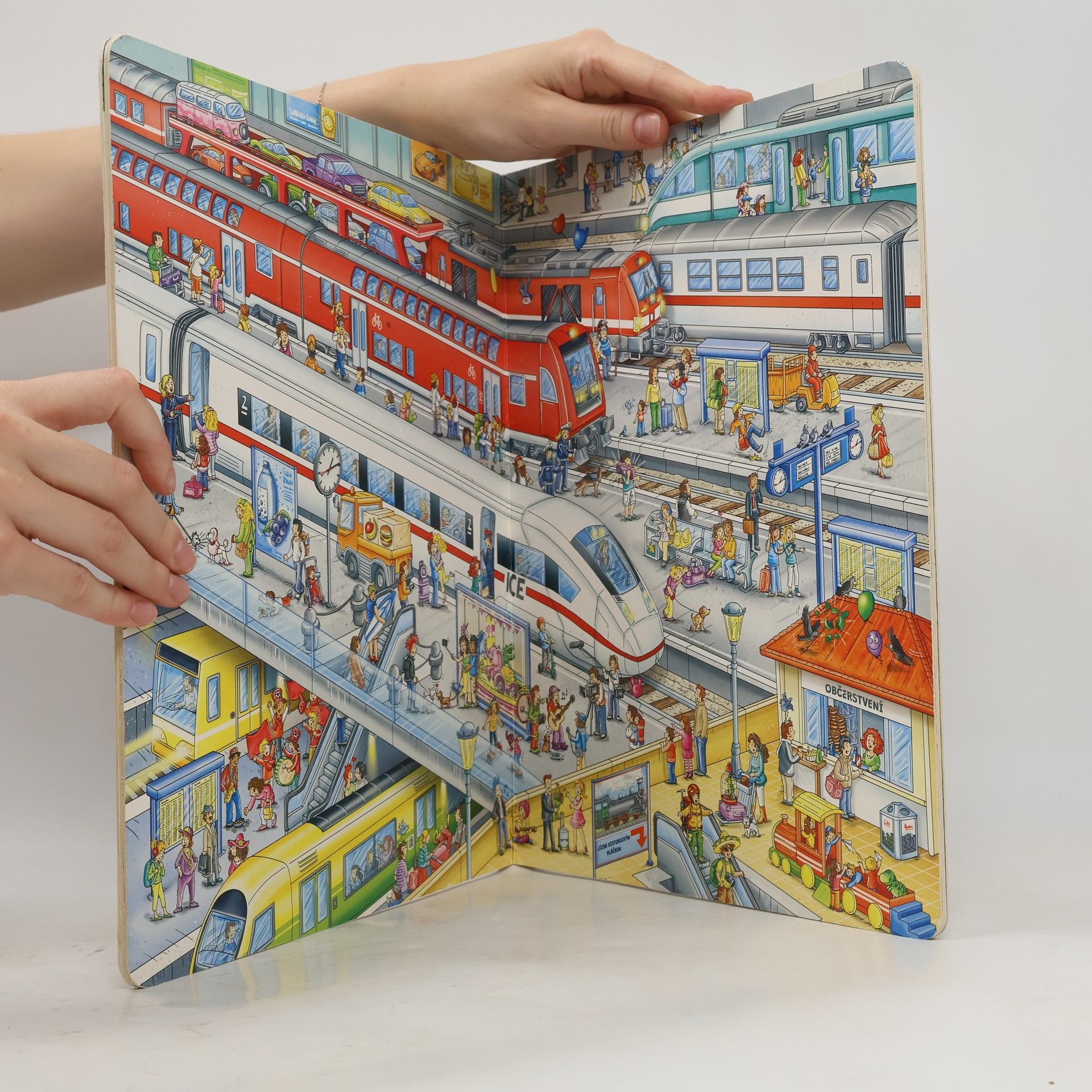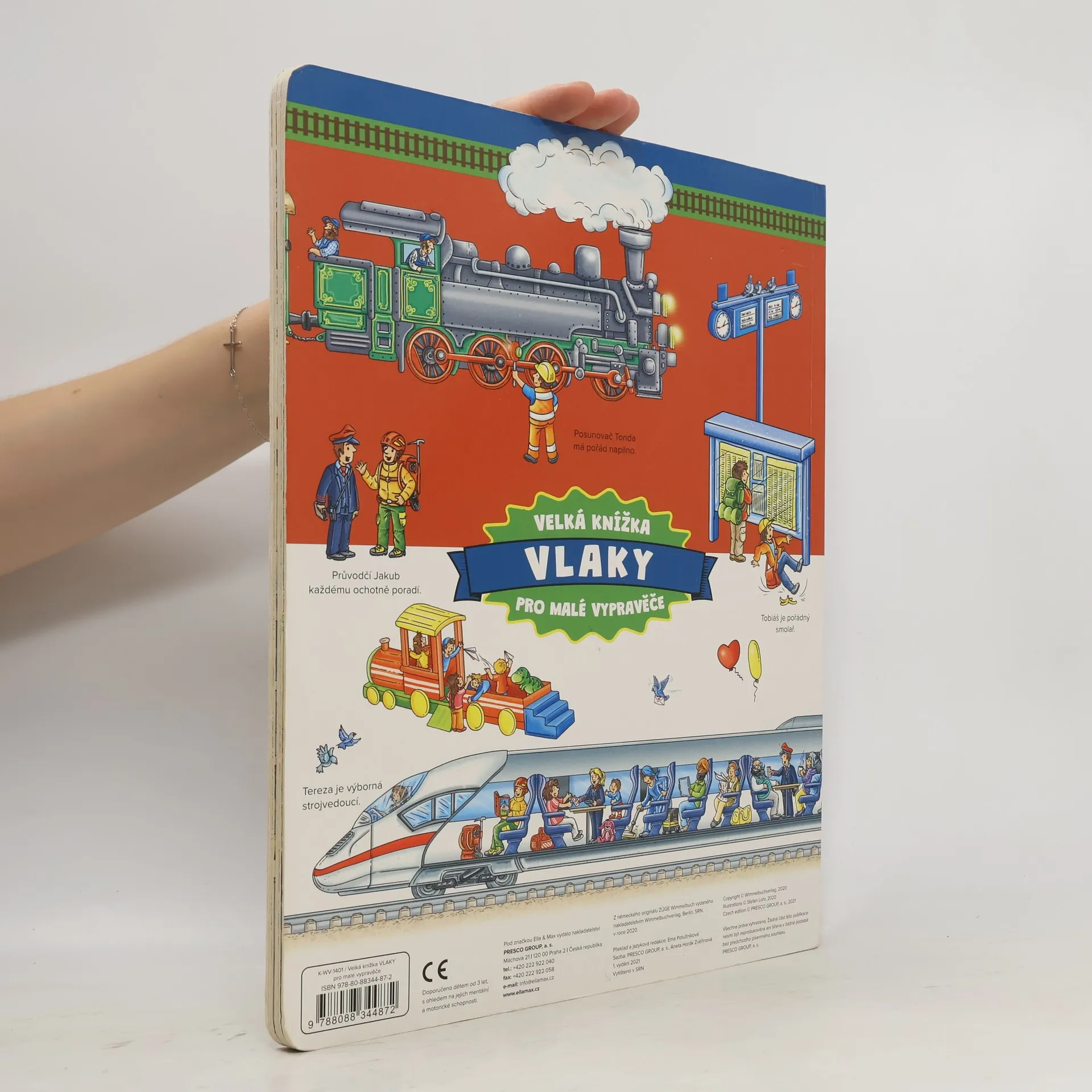 Tohle velkoformátové obrázkové leporelo ocení především fanoušci vlakové dopravy. Do světa lokomotiv, vagonů, kolejnic a nádraží se podívají velmi zblízka na úžasných detailních ilustracích. Seznámí se s těmi, kdo na železnici pracují, s cestujícími se vydají na fascinující výlet historickým vláčkem nebo nejmodernějším rychlíkem. Pojedou dnem i nocí, profrčí tunely i mosty. Poznají čilý ruch velkých nádraží i kouzlo malých venkovských stanic… A když se budou dobře dívat, objeví některé hrdiny na každém obrázku v knížce, a tak s nimi mohou prožívat jejich příběhy.