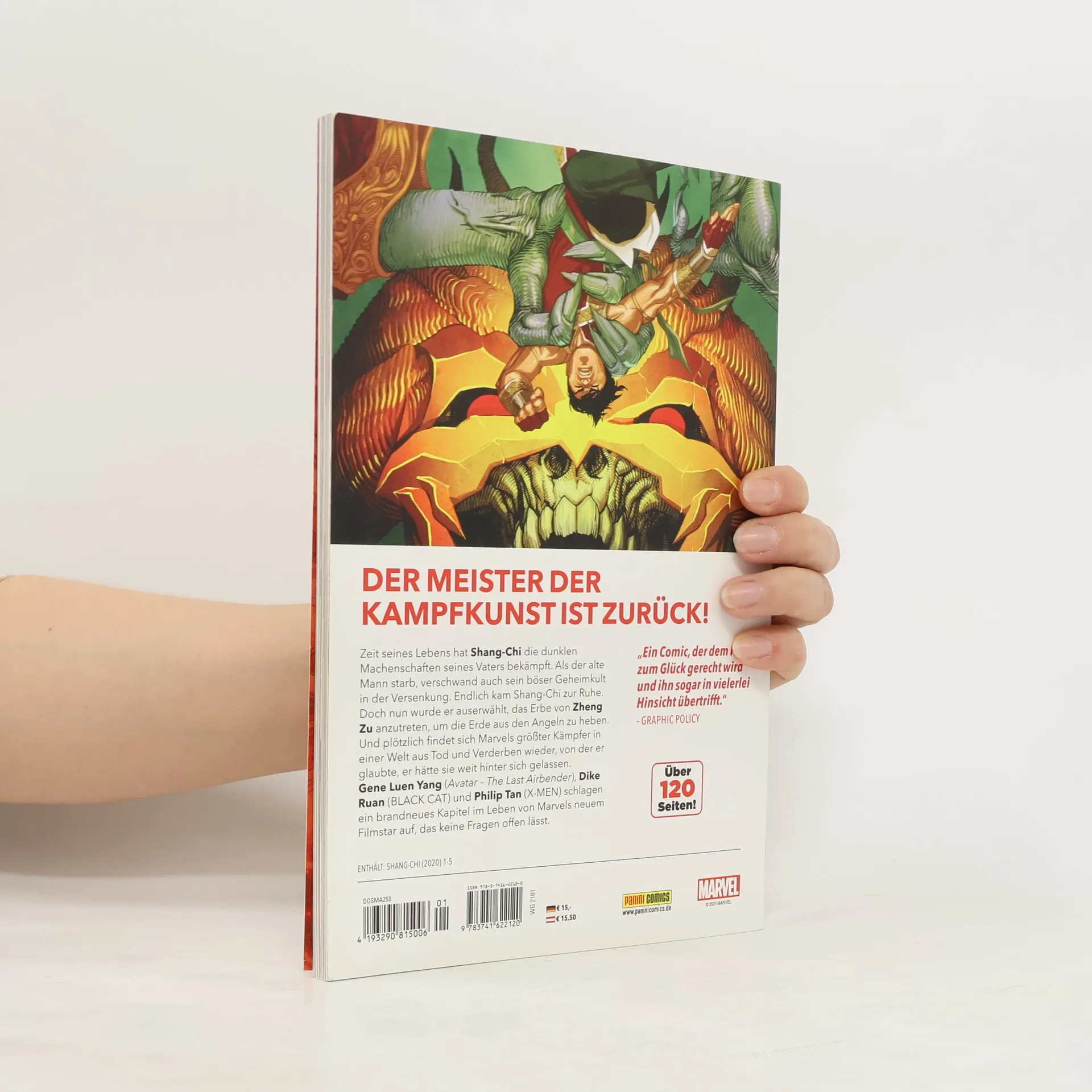 DER MEISTER DER KAMPFKUNST IST ZURÜCK! Zeit seines Lebens hat Shang-Chi die dunklen Machenschaften seines Vaters bekämpft. Als der alte Mann starb, verschwand auch sein böser Geheimkult in der Versenkung. Endlich kam Shang-Chi zur Ruhe. Doch nun wurde er auserwählt, das Erbe von Zheng Zu anzutreten, um die Erde aus den Angeln zu heben. Und plötzlich findet sich Marvels größter Kämpfer in einer Welt aus Tod und Verderben wieder, von der er glaubte, er habe sie weit hinter sich gelassen. Gene Luen Yang (Avatar – The Last Airbender), Dike Ruan (BLACK CAT) und Philip Tan (X-MEN) schlagen ein brandneues Kapitel im Leben von Marvels neuem Filmstar auf, das keine Fragen offen lässt. ENTHÄLT: SHANG-CHI (2020) 1-5
