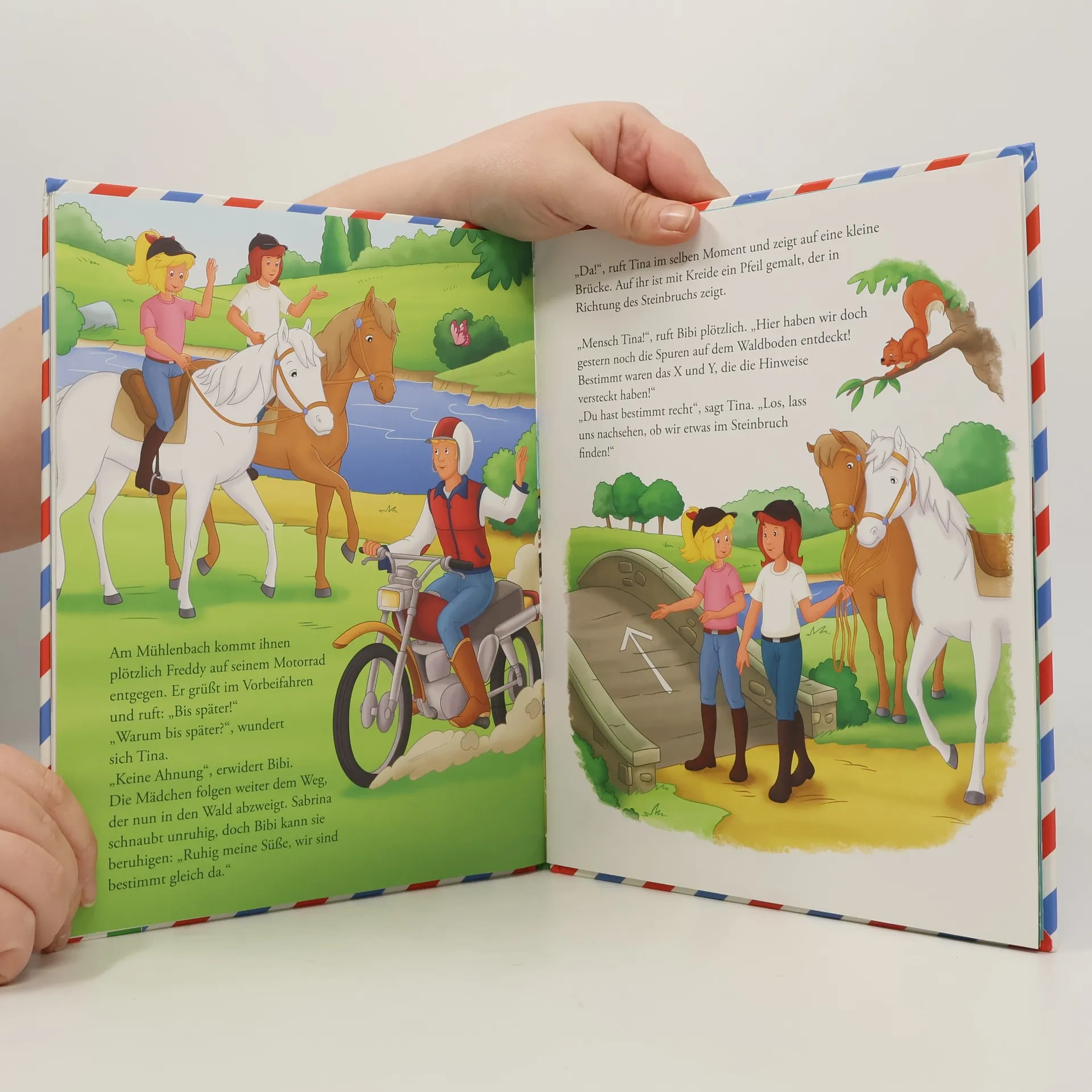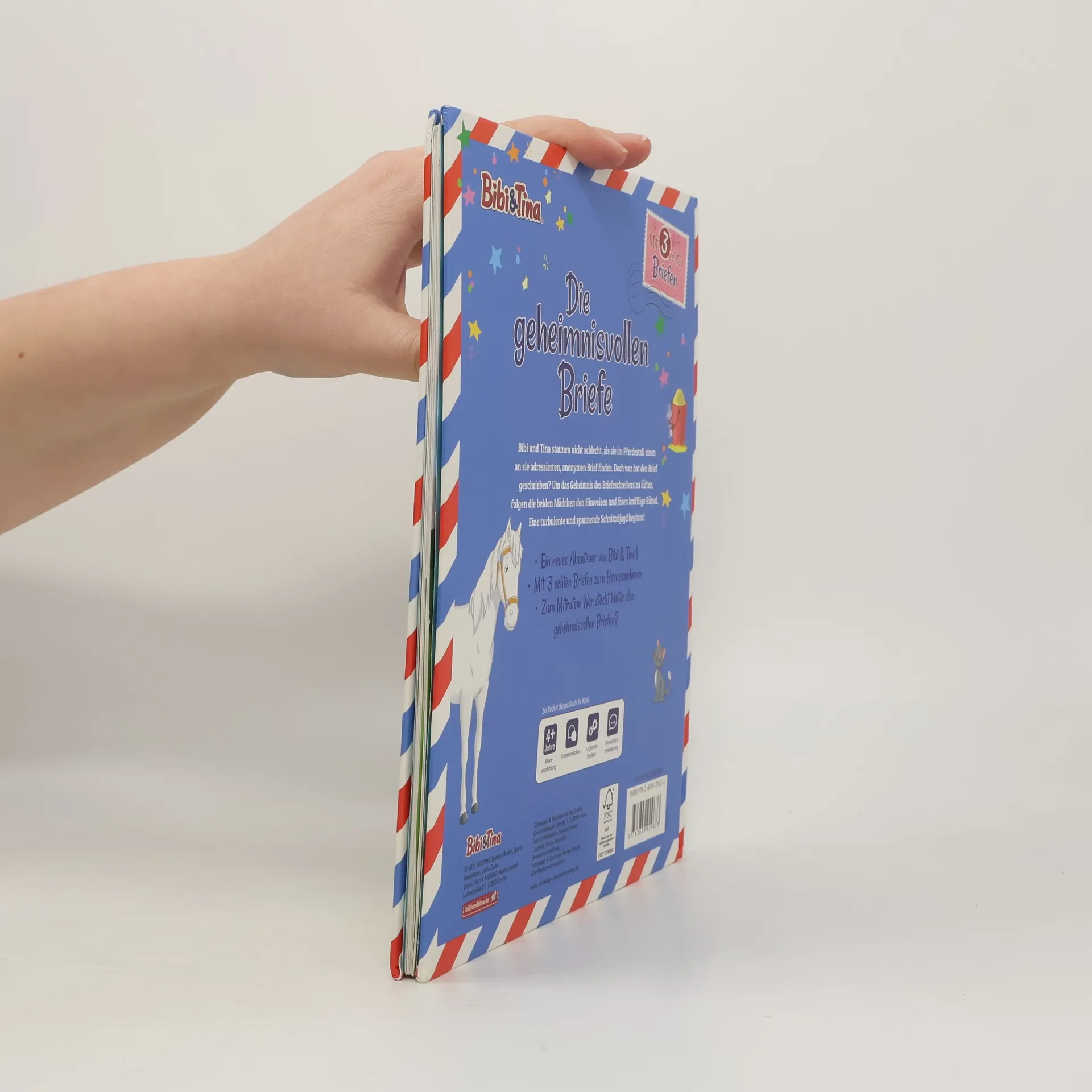 Eine abenteuerliche Schnitzeljagd mit Bibi und Tina! Eine spannende Geschichte zum Mitraten - Wer steckt hinter den geheimnisvollen Briefen? Mit 3 echten Briefen Ein tolles Bibi & Tina Abenteuer für Kinder ab 4 Jahren Bibi und Tina finden einen an sie adressierten Brief im Pferdestall, aber ohne Absender … Wer könnte den Brief geschrieben haben? Um das herauszufinden, begeben sie sich auf eine aufregende Schnitzeljagd, bei der sie knifflige Rätsel lösen müssen. Als erstes geht es zum Schloss Falkenstein. Gibt es dort in der Ahnengalerie etwas Ungewöhnliches zu entdecken? Hilf den beiden, folge den Hinweisen und löse die pfiffigen Rätsel! In diesem kunterbunten Buch wartet ein neues Abenteuer rund um Bibi und Tina auf alle frechen Pferdefreund*innen. Dazu gibt es 3 echte Briefe in Briefumschlägen, die einer nach dem anderen geöffnet werden müssen, um dem anonymen Briefeschreiber auf die Spur zu kommen. Ganz nebenher werden so logisches Denken und Kommunikation gefördert und der Wortschatz von Kindern ab 4 Jahren erweitert. Das perfekte Geschenk für alle Bibi und Tina-Fans!