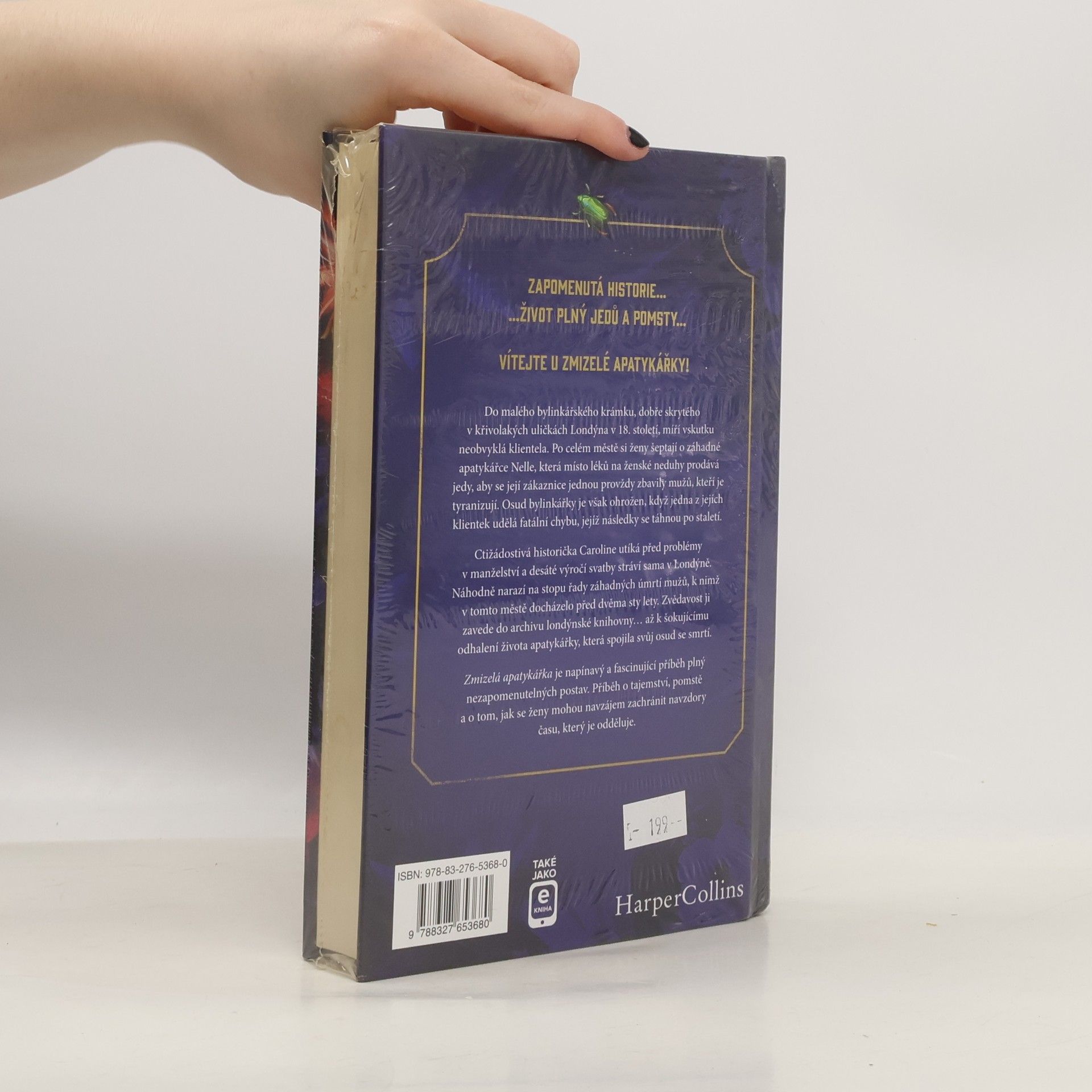 Do malého bylinkářského krámku, dobře skrytého v křivolakých uličkách Londýna v 18. století, míří vskutku neobvyklá klientela. Po celém městě si ženy šeptají o záhadné apatykářce Nelle, která místo léků na ženské neduhy prodává jedy, aby se její zákaznice jednou provždy zbavily mužů, kteří je tyranizují. Osud bylinkářky je však ohrožen, když jedna z jejích klientek udělá fatální chybu, jejíž následky se táhnou po staletí. Ctižádostivá historička Caroline utíká před problémy v manželství a desáté výročí svatby stráví sama v Londýně. Náhodně narazí na stopu řady záhadných úmrtí mužů, k nimž v tomto městě docházelo před dvěma sty lety. Zvědavost ji zavede do archivu londýnské knihovny… až k šokujícímu odhalení života apatykářky, která spojila svůj osud se smrtí. Zmizelá apatykářka je napínavý a fascinující příběh plný nezapomenutelných postav. Příběh o tajemství, pomstě a o tom, jak se ženy mohou navzájem zachránit navzdory času, který je odděluje.