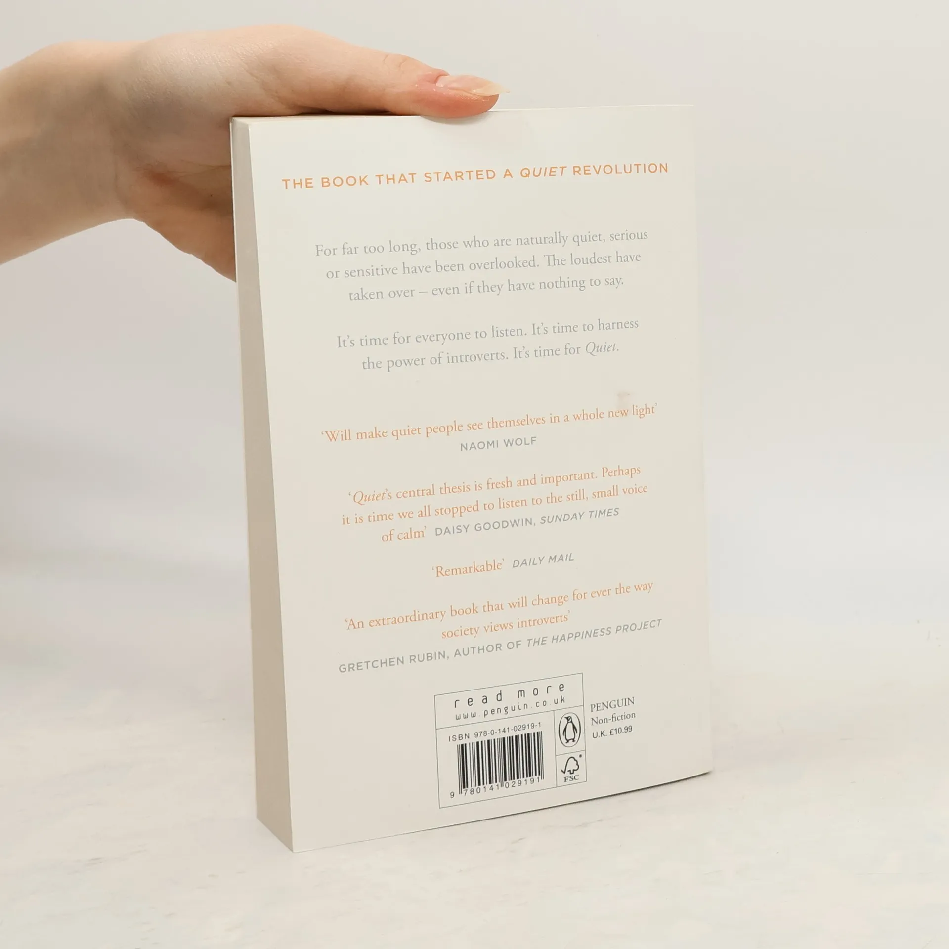 'Quiet is a startling, important and readable page-turner. It will make quiet people see through themselves in a whole new light.' Naomi Wolf, author of The Beauty Myth 'Once in a blue moon, a book comes along that gives us startling new insights. Quiet is that book: part page-turner, part cutting edge science, it will change the way you see yourself, other people, and the world.' Adam Grant, The Wharton School of Business 'Quiet legitimizes and even celebrates the 'niche' that represents half the people in the world. Think Malcolm Gladwell for people who don't take themselves too seriously. Mark my words, this book will be a bestseller.' Guy Kawasaki, author of Enchantment 'Happiness is . . . Quiet, an extraordinary book that will change for ever the way society views introverts. Superbly researched and deeply insightful, Quiet is an indispensable resource for anyone who wants to understand the gifts of the introverted half of the population.' Gretchen Rubin, author of The Happiness Project 'An intriguing and potentially life-altering examination of the human psyche that is sure to benefit both introverts and extroverts alike.' Kirkus Reviews