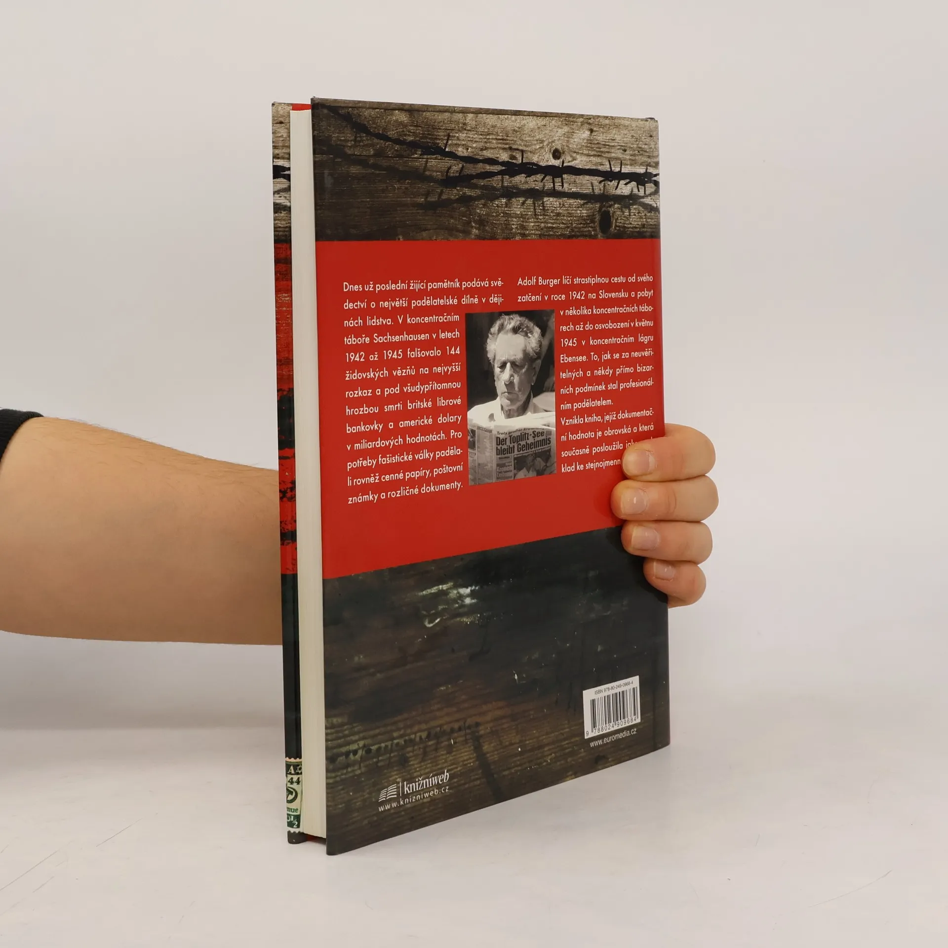 Největší padělatelská operace všech dob Autobiografický příběh muže, který jako vězeň několika nacistických koncentračních táborů byl donucen vyrábět padělky peněz pro Německo. Autobiografické vzpomínky A. Burgera, vězně nacistických koncentračních táborů. Autor byl vyučený sazeč. V roce 1942 byl odvlečen se svou ženou ze Žiliny do koncentračního tábora Osvětim. V první části vzpomínek popisuje otřesné poměry a život v Osvětimi a Březince i různé způsoby likvidace vězňů. Jeho žena v táboře zahynula, kdežto A. Burger byl jako knihtiskař a sazeč převezen do Sachsenhausenu, kde byl nucen pracovat v nacistické padělatelské dílně. Zde vznikly padělky liber v mnohamilionové hodnotě, padělky známek i jiných dokumentů. Z tohoto tábora vedla cesta padělatelské skupiny přes Mauthausen až do Ebensee, kde se dočkali osvobození. Po válce byly padělky vyloveny z jezera Toplitz-see, kde je nacisté ukryli. (méně textu)