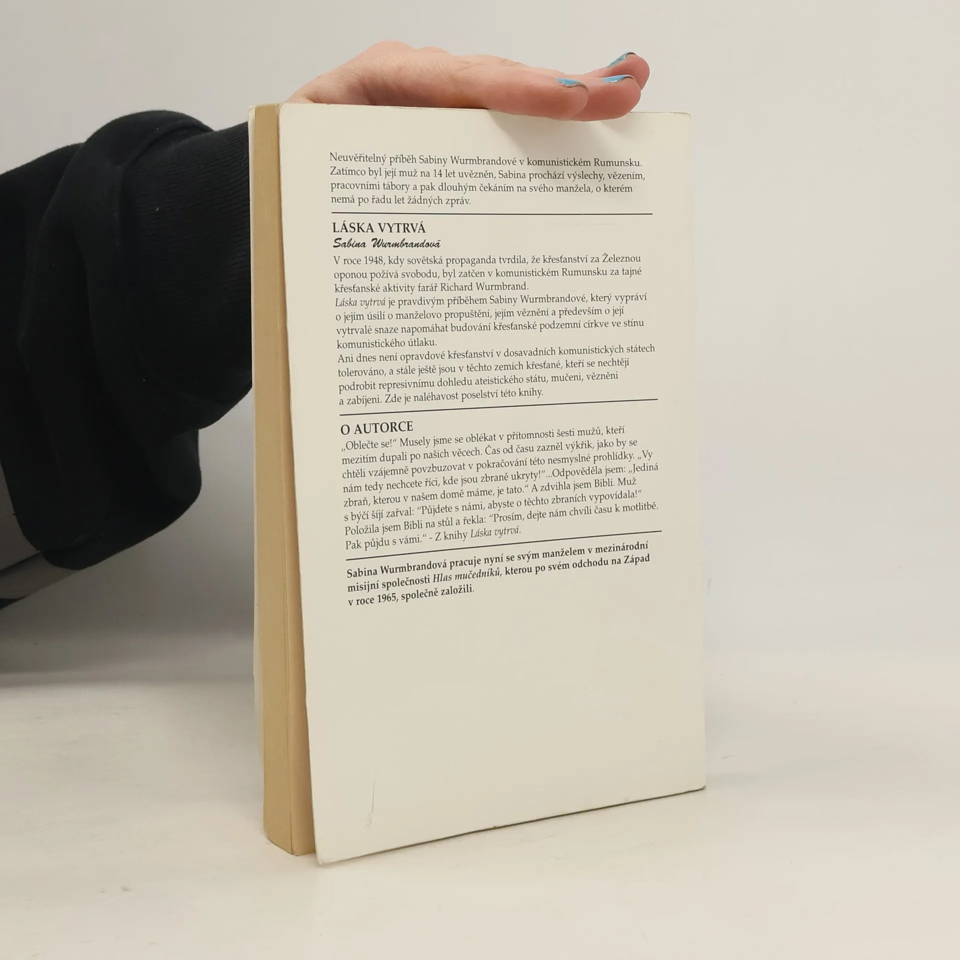 V roce 1948, kdy sovětská propaganda tvrdila, že se křesťané ve východním bloku těší plné náboženské svobodě, zatkla rumunská tajná policie faráře Richarda Wurmbranda. Důvodem byla jeho komunistickému režimu nepohodlná snaha zachovat věrnost vlastnímu přesvědčení a duchovní službě. Kniha Láska vytrvá je skutečným příběhem Sabiny Wurmbrandové, která se po uvěznění svého manžela sama záhy ocitá v pracovním táboře. Navzdory děsivým podmínkám si uchovává víru a vytrvalou křesťanskou lásku. Po propuštění Sabina pokračuje ve své předchozí křesťanské práci, třebaže nemá žádné zprávy o manželovi a dokonce ani neví, zda je ještě naživu. Za lidsky zoufalých okolností a navzdory komunistické represi se Sabina snaží předávat křesťanské poselství a spolu s dalšími budovat ilegální komunitu věřících i ve stínu státem ovládané loutkové církve. V autobiografické výpovědi autorka empaticky líčí také osud a strasti svých spoluvězeňkyň a snaží se najít cestu k odpuštění věznitelům, jakkoli je to téměř nemožné. Oba manželé se nakonec znovu shledávají a po odchodu na Západ zakládají organizaci Hlas mučedníků, která se stává ve svobodném světě mluvčím pronásledované církve. Láska vytrvá je strhujícím textem napsaným výsostným literárním stylem, který čtenáře vtáhne do nepříznivé doby, v níž silné osobnosti, jako byla Sabina Wurmbrandová, dokázaly najít naději a světlo.