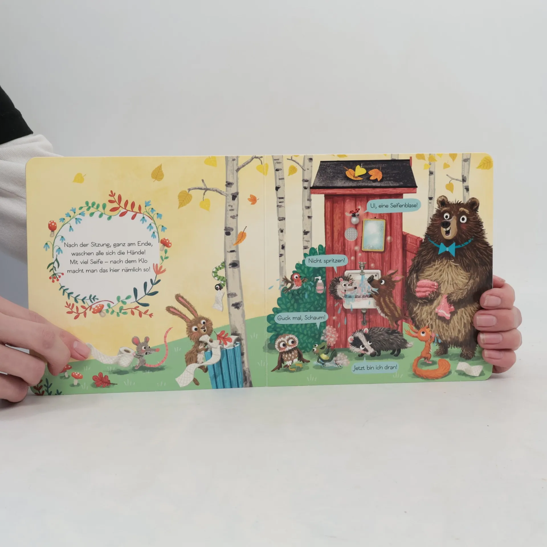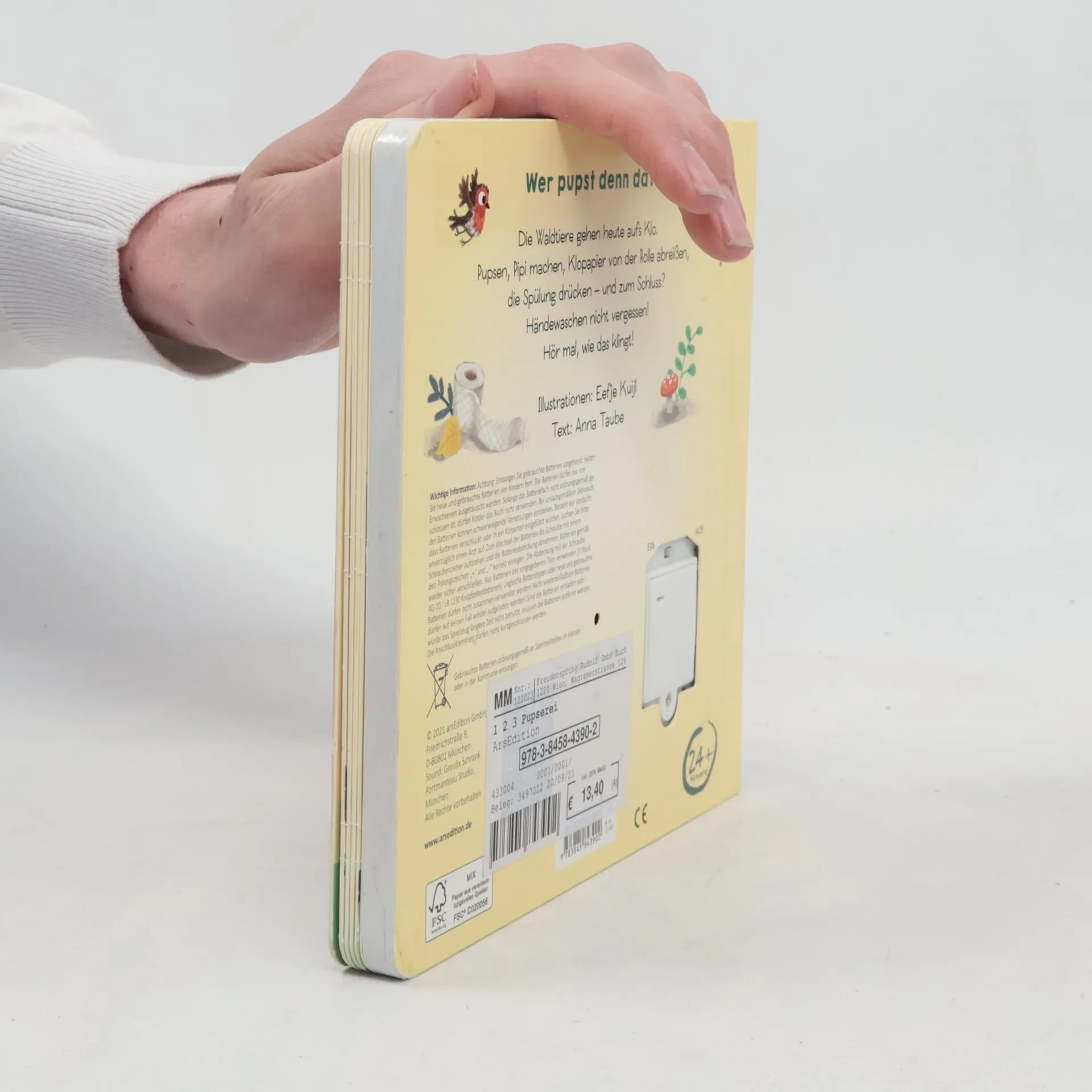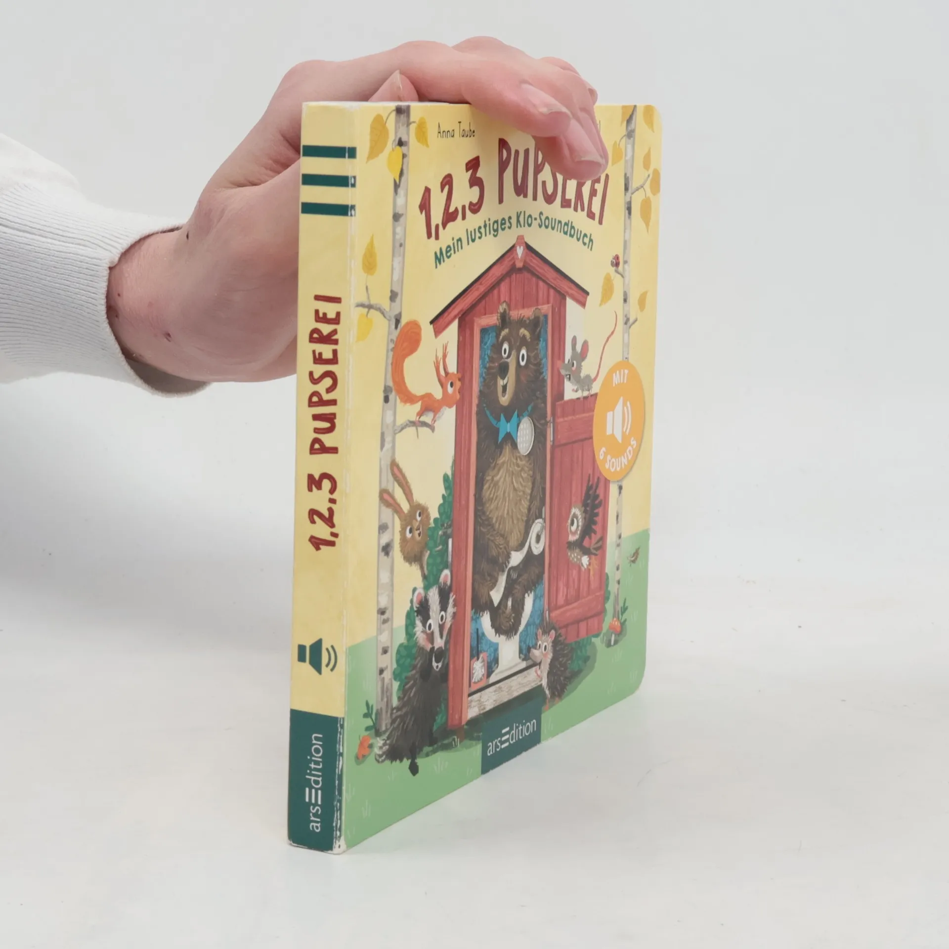 Wer pupst denn da? Nanu, was steht denn da im Wald für ein Häuschen? Da kommen ja lauter Pupse raus! Doch es ist nur der Bär, der auf dem neuen Klo sein Geschäft verrichtet. Nun wollen die anderen Tiere auch: Pipi machen, Klopapier von der Rolle abreißen und dann die Klospülung drücken. Händewaschen nicht vergessen! Was für ein Spaß! Mein lustiges Klosoundbuch Das Lieblingsthema der Kleinsten, verpackt in eine tierisch gereimte Geschichte, untermalt mit lustigen Sounds. Da macht das Sauberwerden gleich doppelt so viel Spaß. Egal ob Windelträger, Töpfchengeher oder Klokönig - hier lachen alle mit! • Wichtiger Entwicklungsschritt: Das Thema „Sauberwerden“ lustig erzählt in einer gereimten Geschichte • Mit Soundeffekt: 6 extraleicht auslösbare Sounds für kleine Kinderhände • Ton abschaltbar: Mit praktischem An- und Ausschalter auf der Buchrückseite • Batterien auswechselbar: Das Buch enthält handelsübliche Knopfzellenbatterien vom Typ LR 1130 mit je 1,5 V, die sich problemlos auswechseln lassen • Das Buch unterliegt strengen Sicherheitsanforderungen und regelmäßigen Qualitätskontrollen nach europäischer Spielzeugsicherheitsrichtlinie