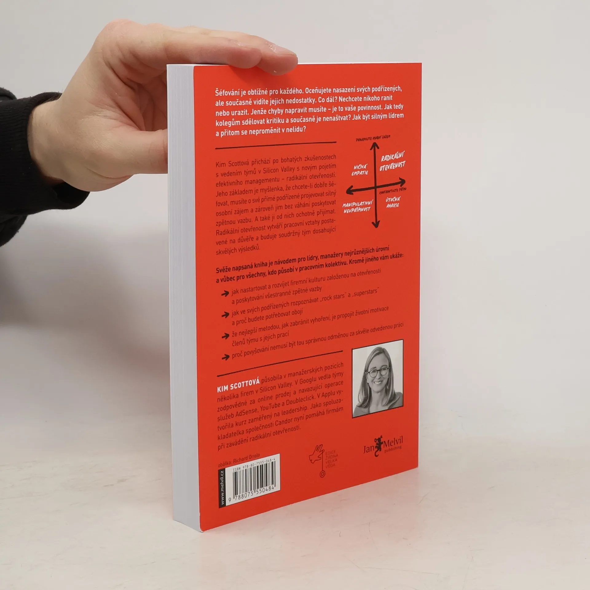 Šéfování je obtížné pro každého. Oceňujete nasazení svých podřízených, ale současně vidíte jejich nedostatky. Co dál? Nechcete nikoho ranit nebo urazit. Jenže chyby napravit musíte – je to vaše povinnost. Jak tedy kolegům sdělovat kritiku a současně je nenaštvat? Jak být silným lídrem a přitom se neproměnit v nelidu? Kim Scottová přichází po bohatých zkušenostech s vedením týmů v Silicon Valley s novým pojetím efektivního managementu – radikální otevřeností. Jeho základem je myšlenka, že chcete-li dobře šéfovat, musíte o své přímé podřízené projevovat silný osobní zájem a zároveň jim bez váhání poskytovat zpětnou vazbu. A také ji od nich ochotně přijímat. Radikální otevřenost vytváří pracovní vztahy postavené na důvěře a buduje soudržný tým dosahující skvělých výsledků. Svěže napsaná kniha je návodem pro lídry, manažery nejrůznějších úrovní a vůbec pro všechny, kdo působí v pracovním kolektivu. Kromě jiného vám ukáže: - jak nastartovat a rozvíjet firemní kulturu založenou na otevřenosti a poskytování všestranné zpětné vazby - jak ve svých podřízených rozpoznávat „rock star“ a „superstar“ a proč budete potřebovat obojí - že nejlepší metodou, jak zabránit vyhoření, je propojit životní motivace členů týmu s jejich prací - proč povyšování nemusí být tou správnou odměnou za skvěle odvedenou práci