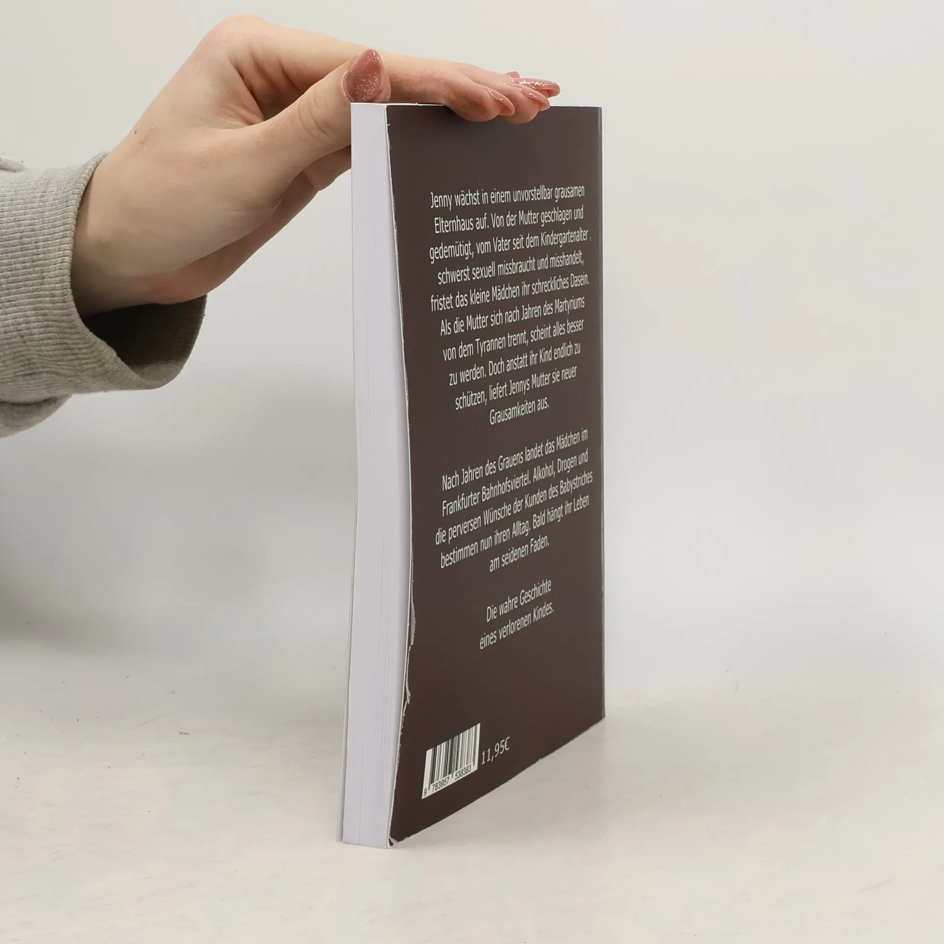Jenny wächst in einem unvorstellbar grausamen Elternhaus auf. Von der Mutter geschlagen und gedemütigt, vom Vater seit dem Kindergartenalter schwerst sexuell missbraucht und misshandelt, fristet das kleine Mädchen ihr schreckliches Dasein. Als die Mutter sich nach Jahren des Martyriums von dem Tyrannen trennt, scheint alles besser zu werden. Doch anstatt ihr Kind endlich zu schützen, liefert Jennys Mutter sie neuer Grausamkeiten aus. Nach Jahren des Grauens landet das Mädchen im Frankfurter Bahnhofsviertel. Alkohol, Drogen und die perversen Wünsche der Kunden des Babystriches bestimmen nun ihren Alltag. Bald hängt ihr Leben am seidenen Faden. Die wahre Geschichte eines verlorenen Kindes. Als Taschenbuch mit 182 Seiten.