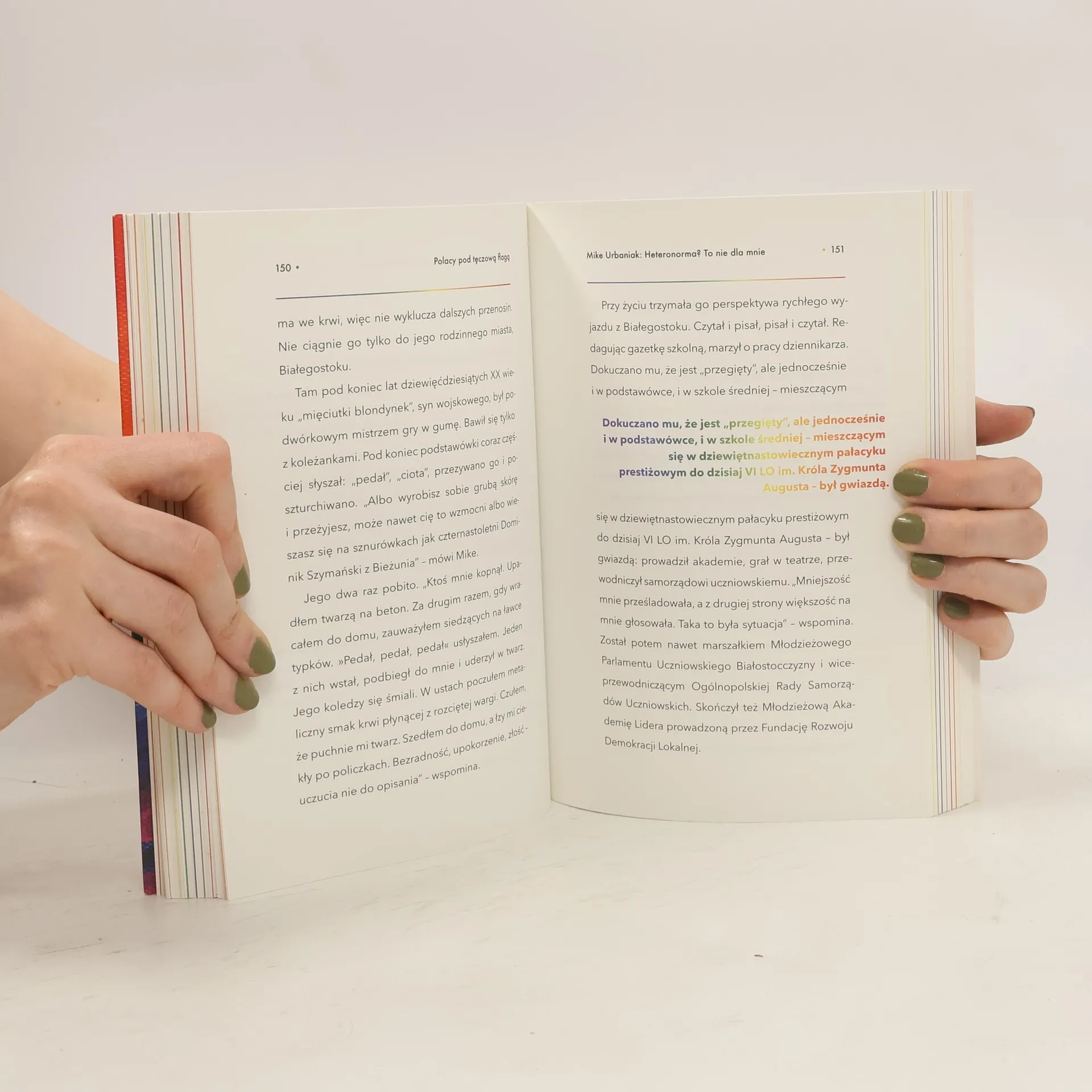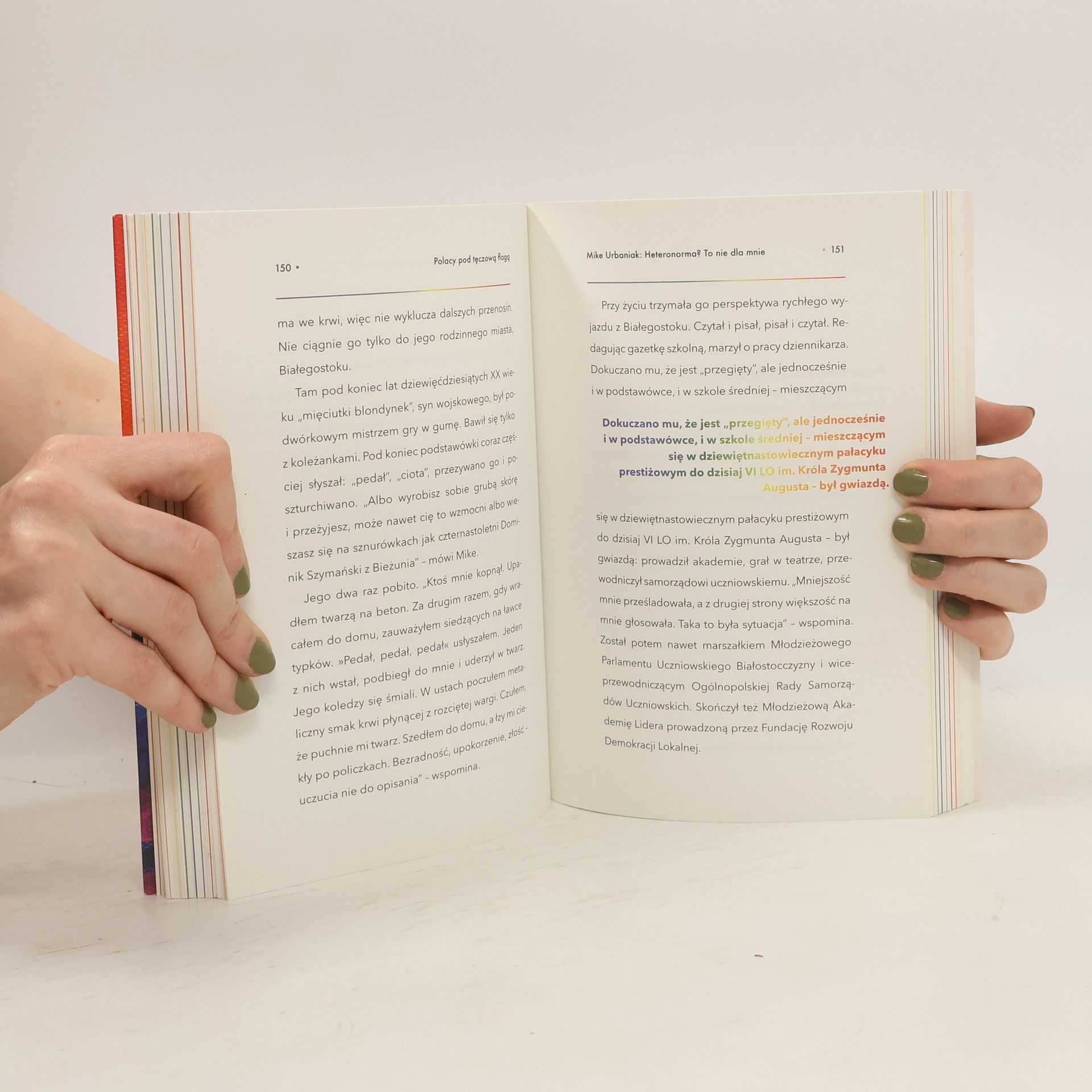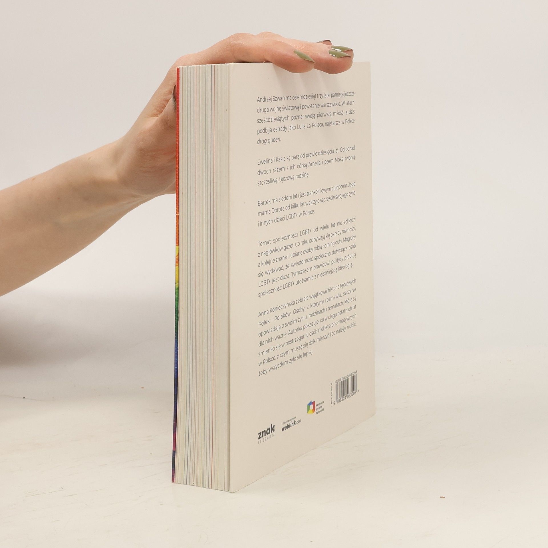 Ludzie, nie ideologia Andrzej Szwan ma osiemdziesiąt trzy lata, pamięta jeszcze drugą wojnę światową i powstanie warszawskie. W latach sześćdziesiątych poznał swoją pierwszą miłość, a dziś podbija estrady jako Lulla La Polaca, najstarsza w Polsce drag queen. Ewelina i Kasia są parą od prawie dziesięciu lat. Od trzech razem z ich córką Amelią i psem Moką tworzą szczęśliwą, tęczową rodzinę. Bartek ma siedem lat i jest transpłciowym chłopcem. Jego mama Dorota od kilku lat walczy o szczęście swojego syna i innych dzieci LGBT+ w Polsce. Temat społeczności LGBT+ od wielu lat nie schodzi z nagłówków gazet. Co roku odbywają się parady równości, a kolejne znane i lubiane osoby robią coming outy. Mogłoby się wydawać, że świadomość społeczna dotycząca osób LGBT+ jest duża. Tymczasem prawicowi politycy próbują społeczność LGBT+ utożsamić z nieistniejącą ideologią. Anna Konieczyńska zebrała wyjątkowe historie tęczowych Polek i Polaków. Osoby, z którymi rozmawia, szczerze opowiadają o swoim życiu, rodzinach i tematach, które są dla nich ważne. Autorka pokazuje, co w ciągu ostatnich lat zmieniło się w postrzeganiu osób nieheteronormatywnych w Polsce, z czym muszą się dziś mierzyć i co należy zrobić, żeby wszystkim żyło się lepiej. Wśród bohaterek i bohaterów znajdują się znane osoby LGBT+, m.in. Mike Urbaniak, Bart Staszewski czy Areta Szpura.