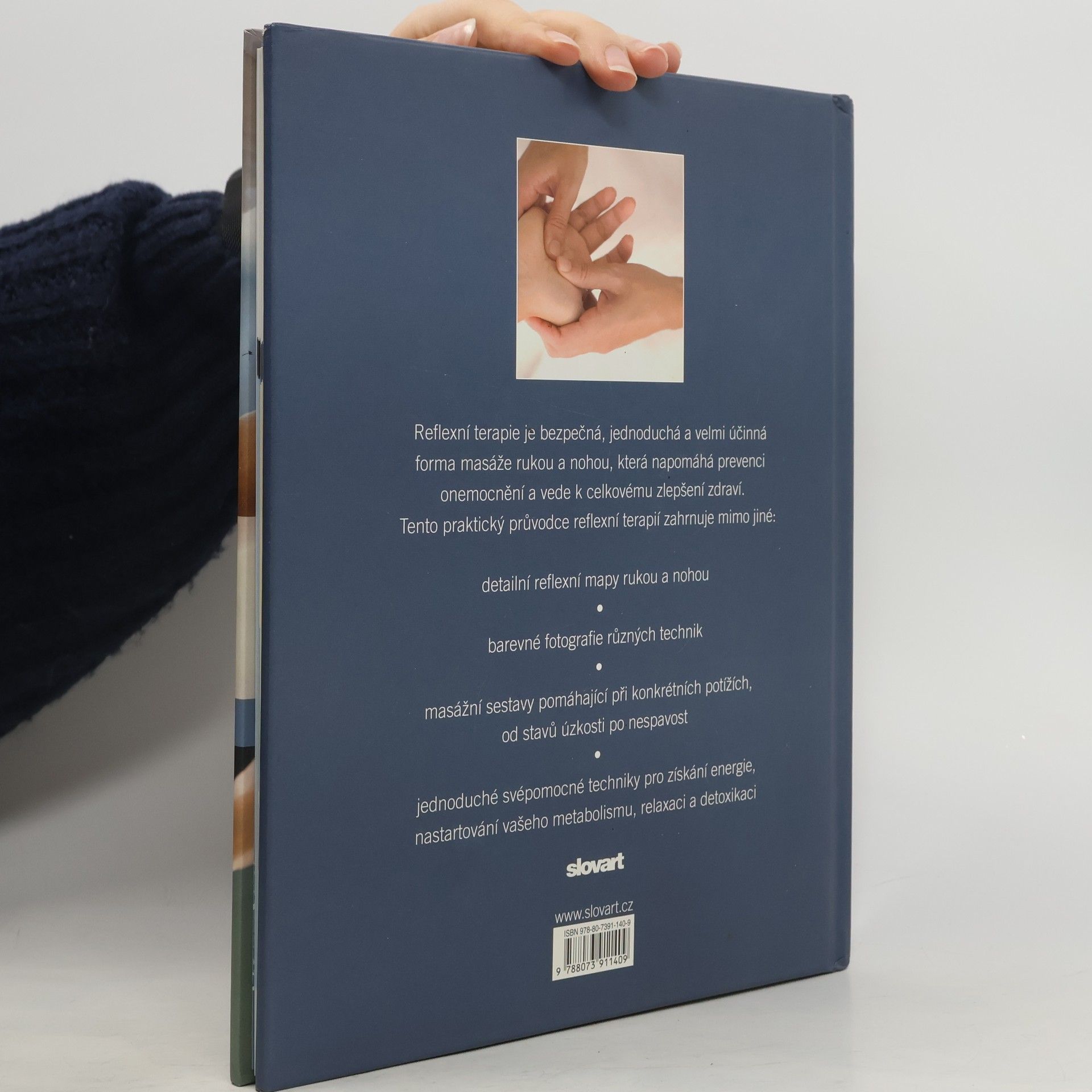 Reflexní terapie je přirozený způsob práce s lidským tělem i psychikou. Masážní techniky a postupy jednotlivých terapeutických škol se mohou lišit, všem je však společná holistická myšlenka, že každá část těla obsahuje tělo celé. Na základě citlivosti reflexních plošek je možné zjistit, zda není některý vnitřní orgán oslaben. Pomocí reflexní terapie lze stimulovat léčivé schopnosti těla a podstatně napomoci k jeho uzdravení. Tento praktický průvodce ukazuje, jak reflexní terapie funguje a vybízí k aktivnímu přístupu k vlastnímu zdraví. Podrobně, krok za krokem vysvětluje jednotlivé masážní techniky, které napomáhají k uvolnění a detoxikaci organismu, nastartování metabolismu. Obsahuje mapy reflexních plošek a kapitoly o léčení specifických obtíží jako jsou unavené oči, bolesti hlavy a zad, zácpa, premenstruační syndrom, kocovina, stres, stavy úzkosti, nespavost a další.