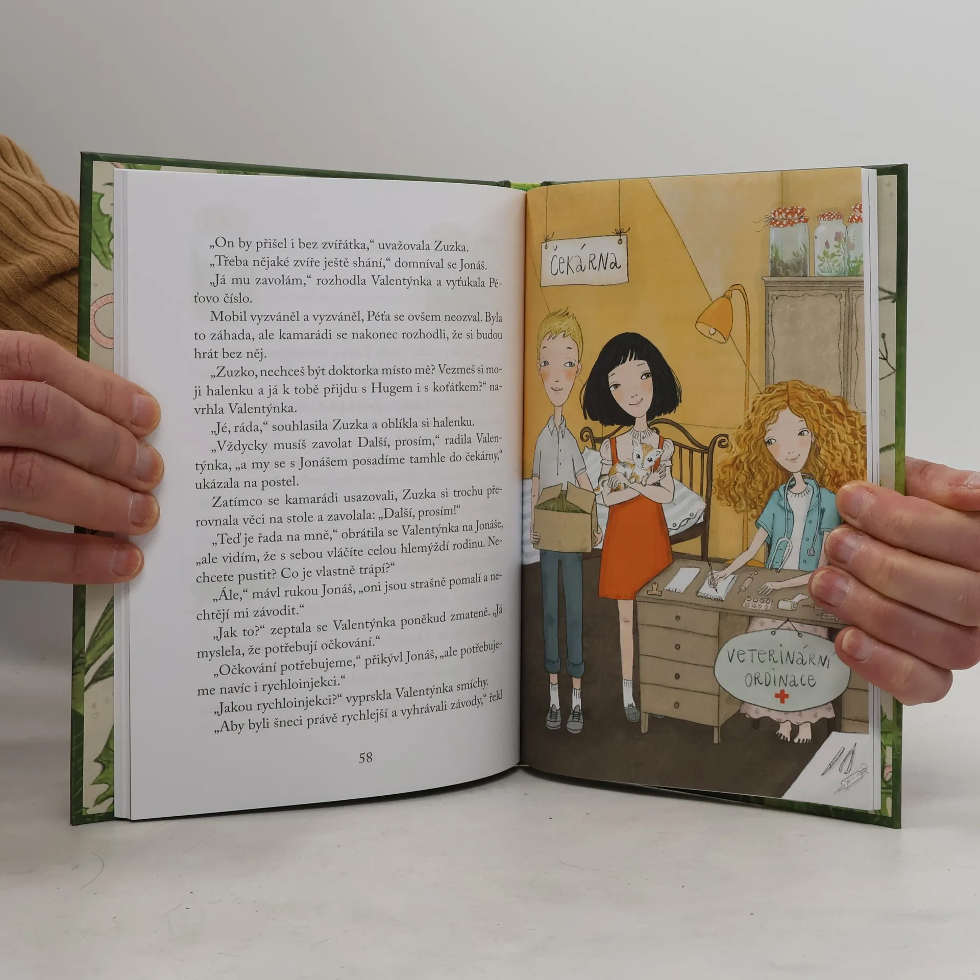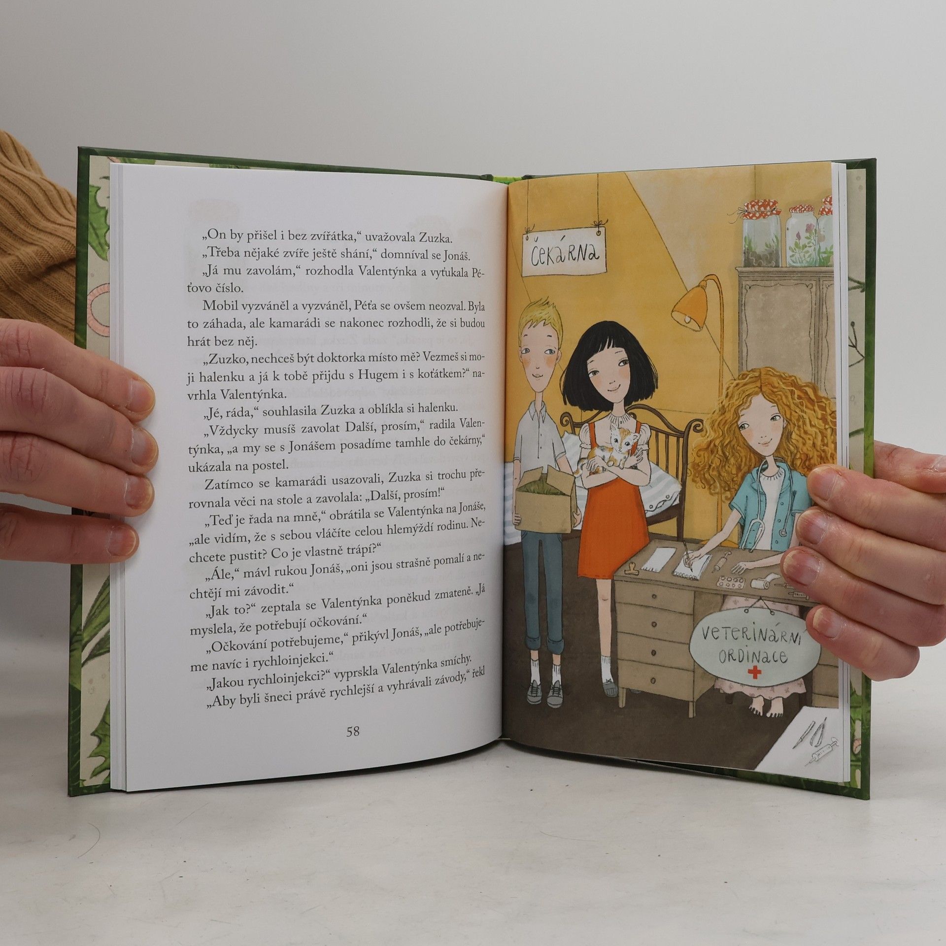 Pokračování příběhů o nápadité a podnikavé holčičce Valentýnce a jejích kamarádech Jonášovi, Zuzce a Péťovi. Tentokrát Valentýnku k nové hře inspiruje její pejsek Hugo, který si zraní ucho. Po návštěvě veterinární kliniky Valentýnka dětem navrhne, že si společně zařídí ordinaci. Budou léčit zvířátka! Poradí si malí veterináři se všemi případy? Nakladatelská anotace.