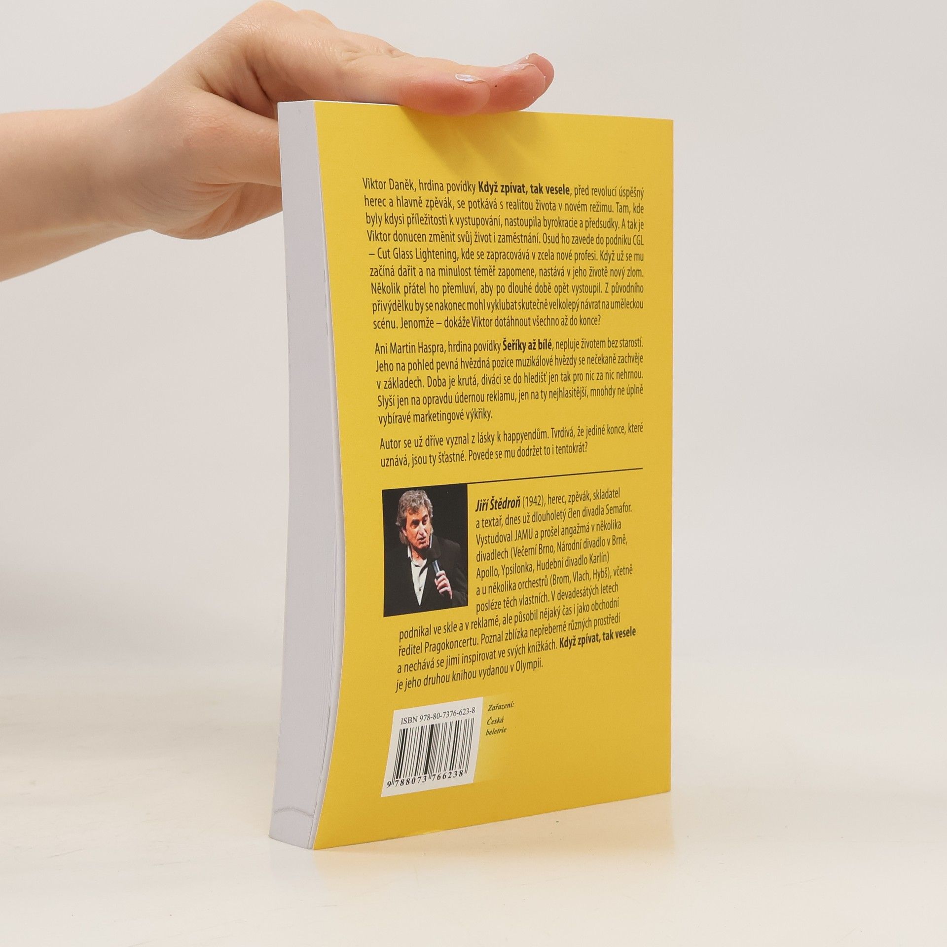 Jiří Štědroň píše stejně, jako zpívá, hraje nebo skládá písničky. Aby pobavil. Lehce a s úsměvem. Hrdinové jeho dvou povídek „Když zpívat, tak vesele“ a „Šeříky až bílé“ se pohybují prostředími, která autor důvěrně zná. Jsou to profesionálové, ale nevychloubají se tím, jsou sympatičtí, ale nehřeší na to, jsou skromní a slušní, ale když o něco jde, třeba se i poperou. Hledají a pochybují a to správné nerozpoznají vždycky na první pokus.