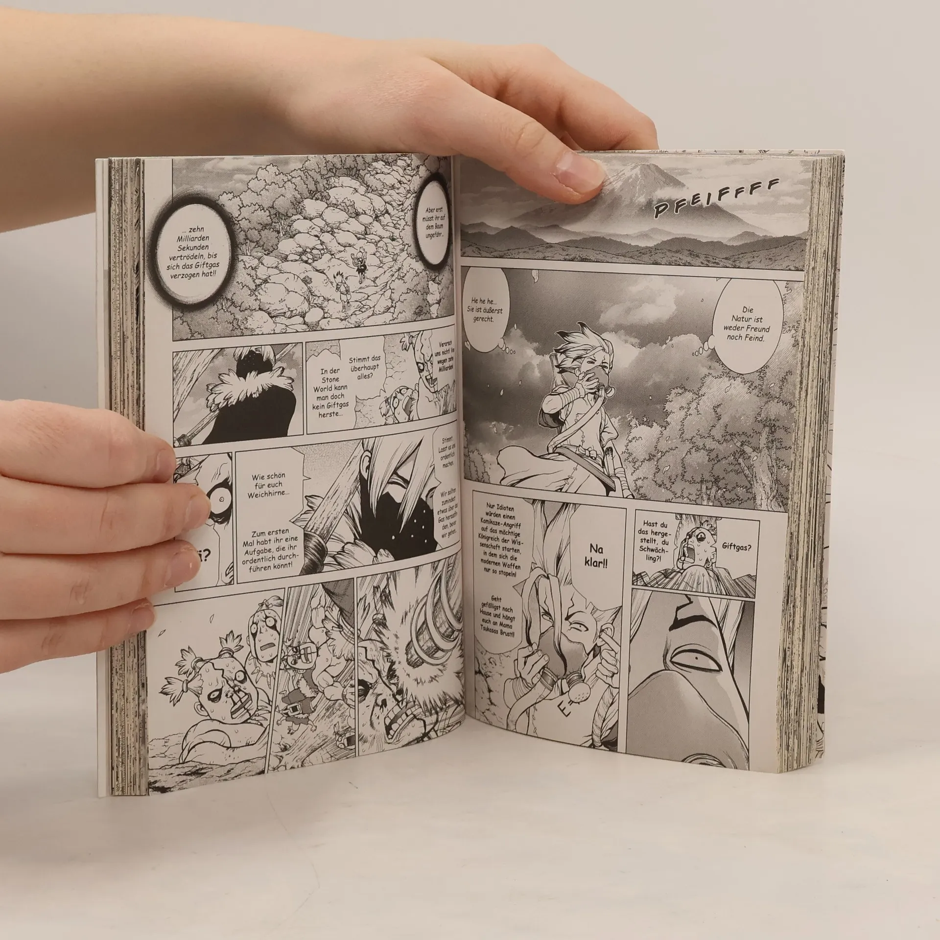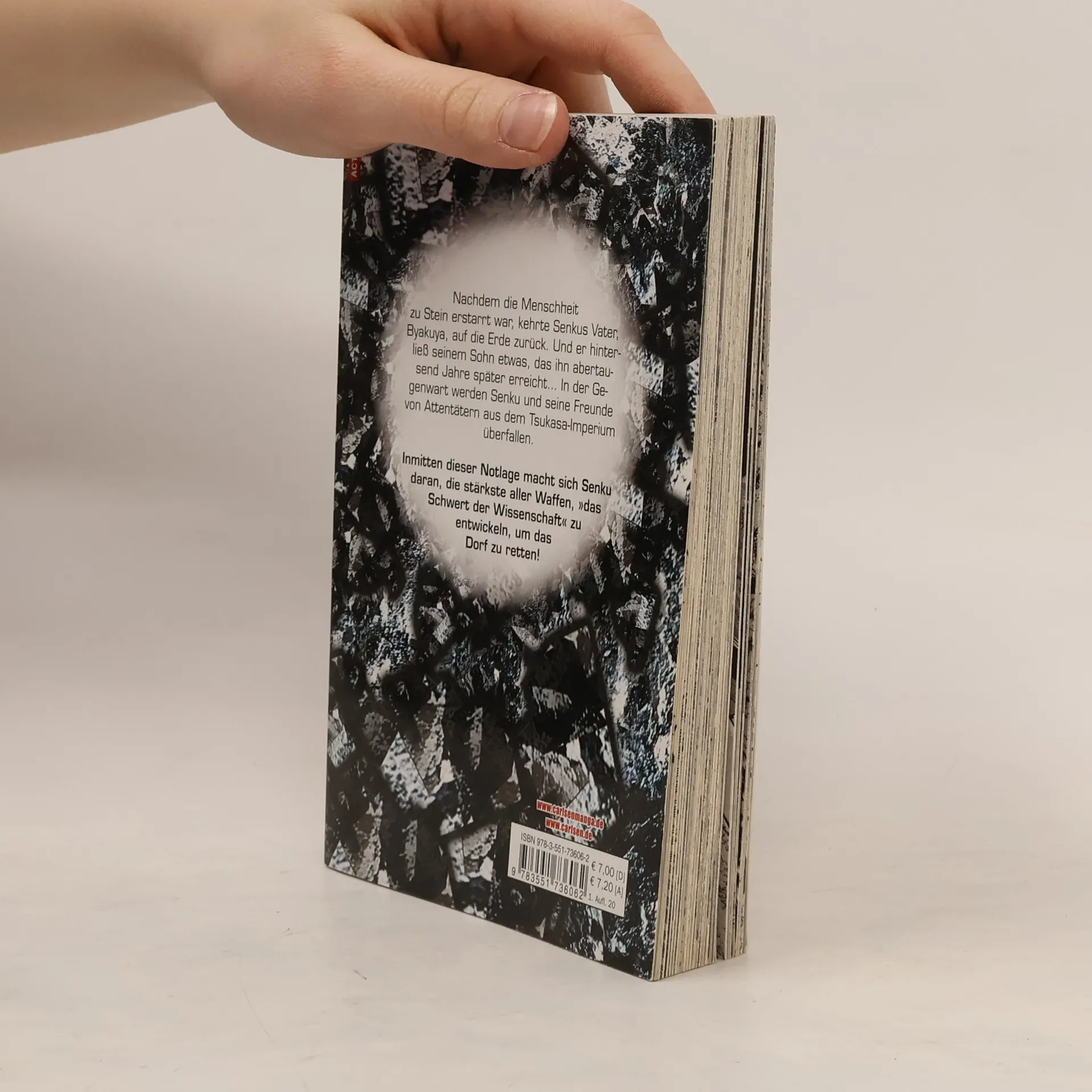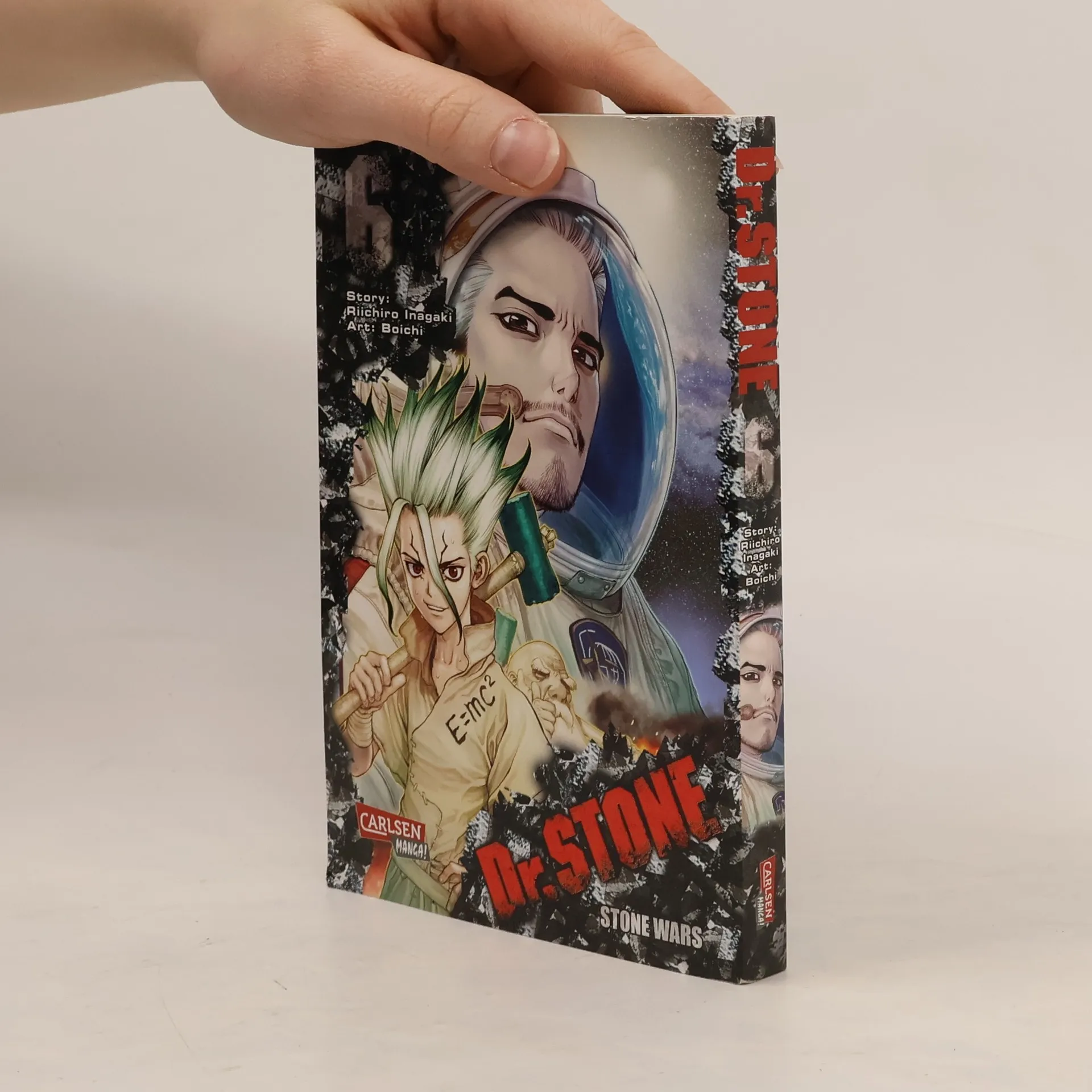 DR. STONE ist einer der beliebtesten Manga in Japan und begeistert mittlerweile auch Animefans auf der ganzen Welt! Ein Augenblick, und die Menschheit erstarrt auf mysteriöse Weise zu Stein. Als die beiden Highschool-Schüler Senku und Taiju mehr als dreitausend Jahre später erwachen, beschließen sie, die menschliche Zivilisation im Alleingang neu aufzubauen! Ein beispielloses Science-Fiction-Abenteuer beginnt! Das erwartet dich in diesem Band: Nachdem die Menschheit zu Stein erstarrt war, kehrte Senkus Vater, Byakuya, auf die Erde zurück. Und er hinterließ seinem Sohn etwas, das ihn abertausend Jahre später erreicht… In der Gegenwart werden Senku und seine Freunde von Attentätern aus dem Tsukasa-Imperium überfallen. Inmitten dieser Notlage macht sich Senku daran, die stärkste aller Waffen, »das Schwert der Wissenschaft« zu entwickeln, um das Dorf zu retten! Abenteuer, Action, Witz und Wissenschaft vereinen sich in diesem Manga für Jungs, Mädchen und alle Geschlechter. Und das Beste: Physik und Chemie sind hier ein Riesenspaß! Weitere Informationen: - Abgeschlossen in 26 Bänden - Top Titel der japanischen WEEKLY SHONEN JUMP - Perfekt für alle Mangafans ab 14 Jahren - Anime seit August 2019 auf Crunchyroll