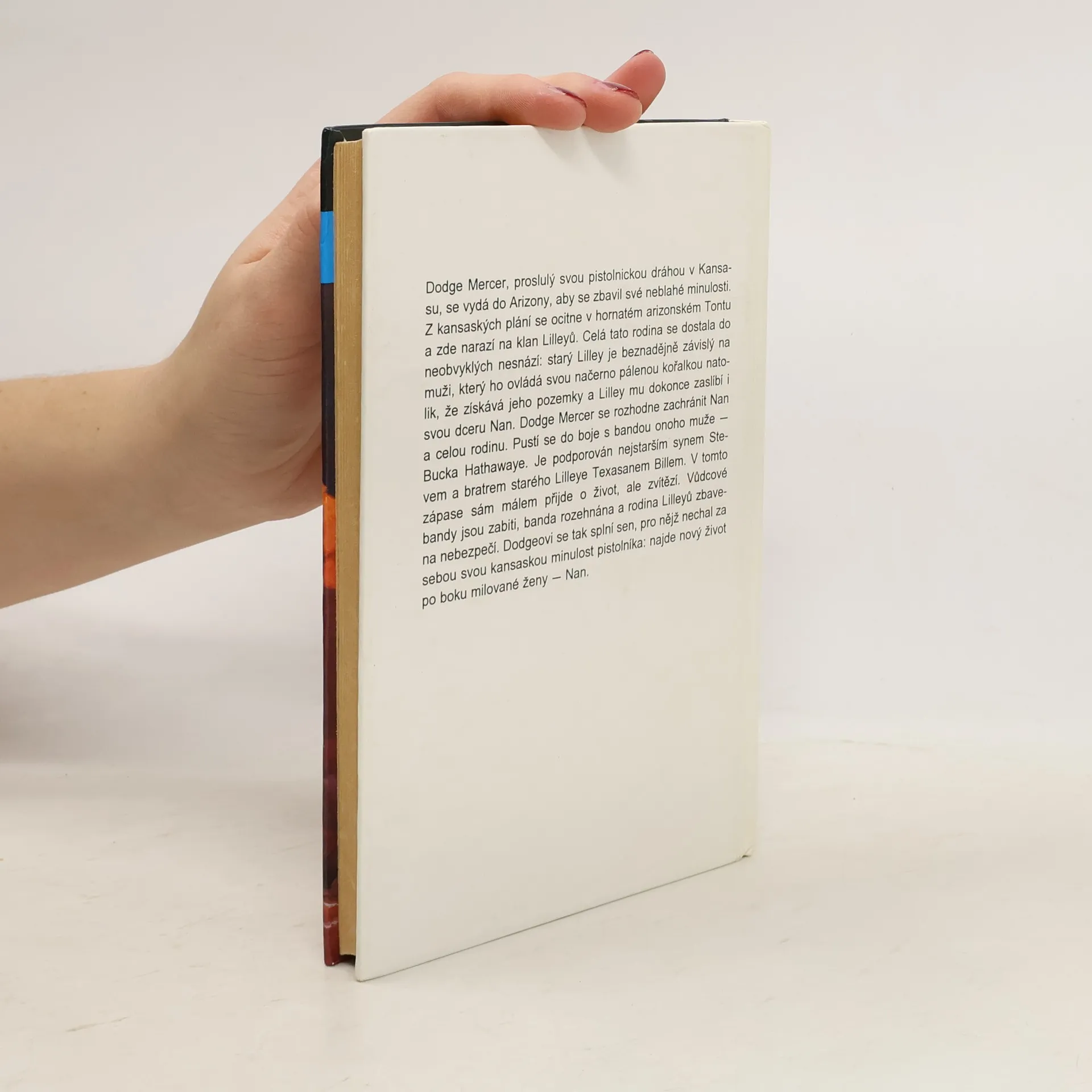 Dodge Mercer, proslulý svou pistolnickou dráhou v Kansasu, se vydá do Arizony, aby se zbavil své neblahé minulosti. Ocitne se v hornatém arizonském Tontu a zde narazí na klan Lilleyů. Celá rodina se dostala do neobvyklých nesnází: starý Lilley je beznadějně závislý na muži, který ho ovládá svou načerno pálenou kořalkou natolik, že získává jeho pozemky a dokonce mu zaslíbí svou dceru Nan. Dodge Mercer se rozhodne zachránit Nan a celou rodinu. ISBN 80-85767-96-1 je chybné