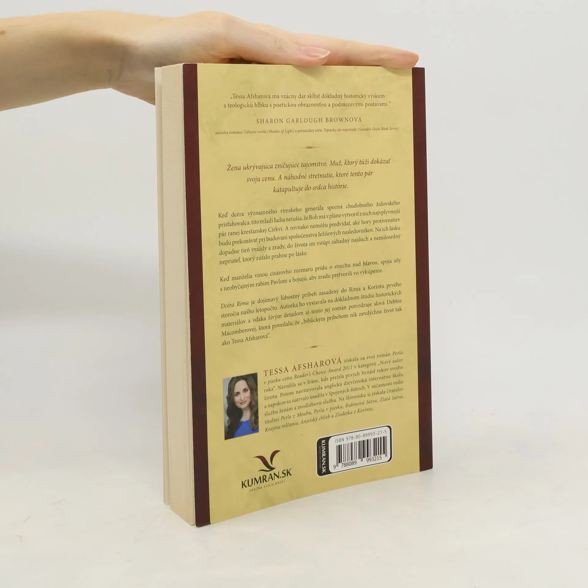 Žena ukrývajúca zničujúce tajomstvo. Muž, ktorý túži dokázať svoju cenu. A náhodné stretnutie, ktoré tento pár katapultuje do srdca histórie. Keď dcéra významného rímskeho generála spozná chudobného židovského prisťahovalca, títo mladí ľudia netušia, že Boh má v pláne vytvoriť z nich najvplyvnejší pár ranej kresťanskej Cirkvi. A rovnako nemôžu predvídať, aké hory protivenstiev budú prekonávať pri budovaní spoločenstva Ježišových nasledovníkov. Na ich lásku dopadne tieň vraždy a zrady, do života im vstúpi záhadný najdúch a nemilosrdný nepriateľ, ktorý zúfalo prahne po láske. Keď manželia vinou cisárovho rozmaru prídu o strechu nad hlavou, spoja sily s neobyčajným rabim Pavlom a bojujú, aby zradu pretvorili vo vykúpenie. Dcéra Ríma je dojímavý ľúbostný príbeh zasadený do Ríma a Korintu prvého storočia nášho letopočtu. Autorka ho vystavala na dôkladnom štúdiu historických materiálov a vďaka živým detailom aj tento jej román potvrdzuje slová Debbie Macomberovej, ktorá povedala, že „biblickým príbehom nik nevdýchne život tak ako Tessa Afsharová“.