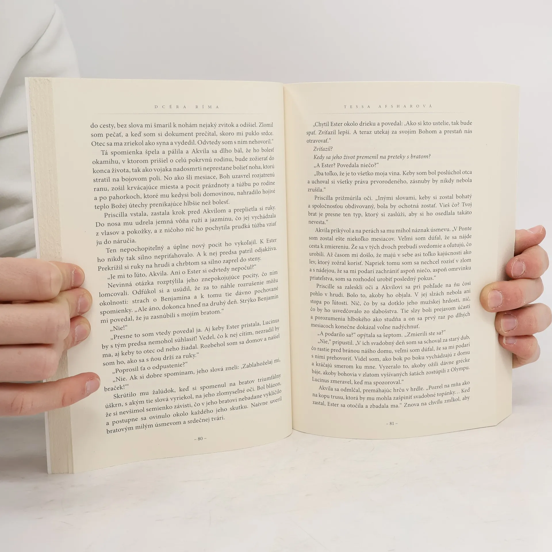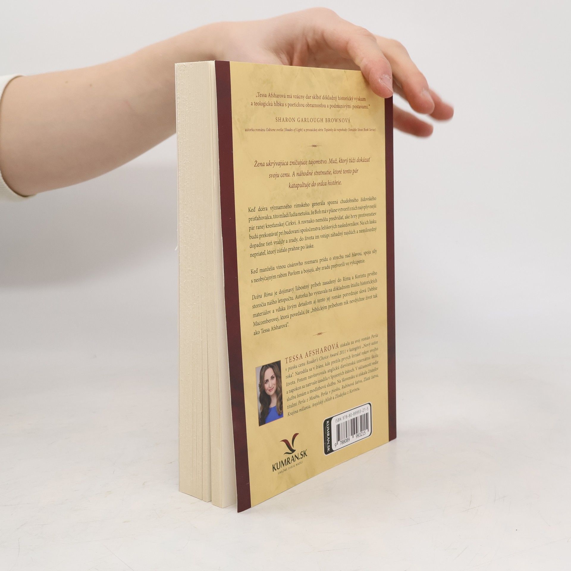 Žena ukrývajúca zničujúce tajomstvo. Muž, ktorý túži dokázať svoju cenu. A náhodné stretnutie, ktoré tento pár katapultuje do srdca histórie. Keď dcéra významného rímskeho generála spozná chudobného židovského prisťahovalca, títo mladí ľudia netušia, že Boh má v pláne vytvoriť z nich najvplyvnejší pár ranej kresťanskej Cirkvi. A rovnako nemôžu predvídať, aké hory protivenstiev budú prekonávať pri budovaní spoločenstva Ježišových nasledovníkov. Na ich lásku dopadne tieň vraždy a zrady, do života im vstúpi záhadný najdúch a nemilosrdný nepriateľ, ktorý zúfalo prahne po láske. Keď manželia vinou cisárovho rozmaru prídu o strechu nad hlavou, spoja sily s neobyčajným rabim Pavlom a bojujú, aby zradu pretvorili vo vykúpenie. Dcéra Ríma je dojímavý ľúbostný príbeh zasadený do Ríma a Korintu prvého storočia nášho letopočtu. Autorka ho vystavala na dôkladnom štúdiu historických materiálov a vďaka živým detailom aj tento jej román potvrdzuje slová Debbie Macomberovej, ktorá povedala, že „biblickým príbehom nik nevdýchne život tak ako Tessa Afsharová“.