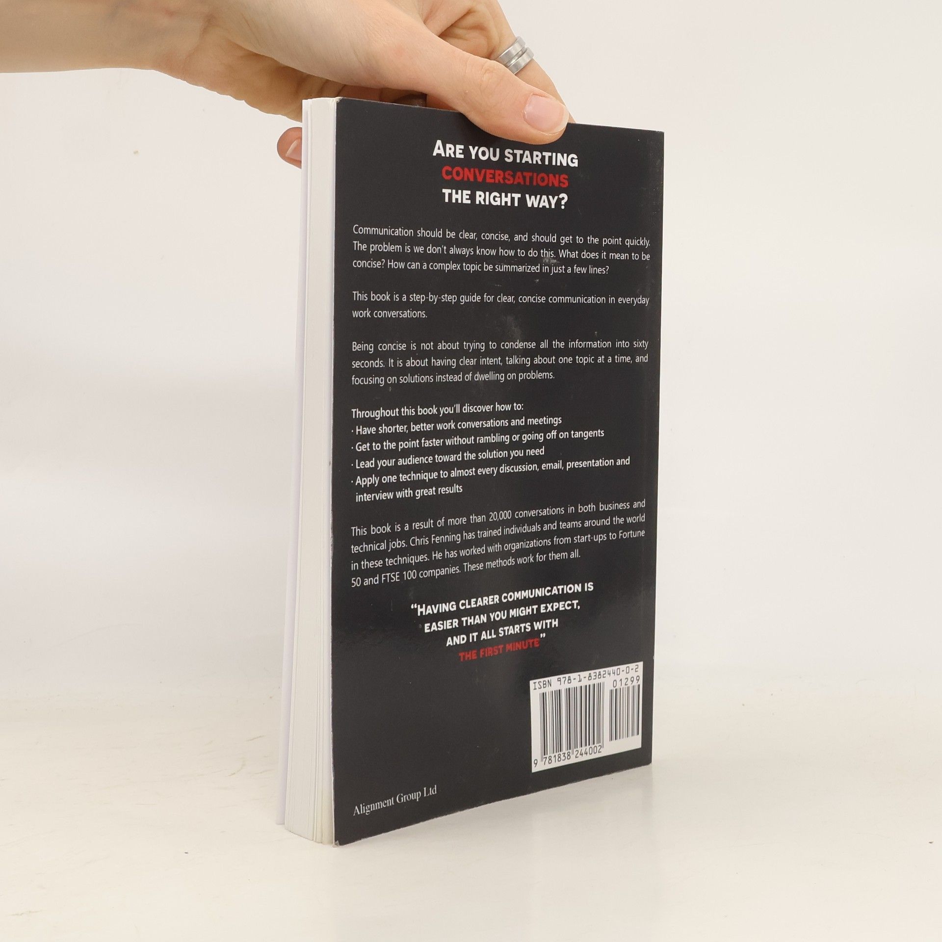 Are you starting conversations the right way? Communication should be clear, concise, and should get to the point quickly. The problem is we don't always know how to do this. What does it mean to be concise? How can a complex topic be summarized in just a few lines? This short book is a step-by-step guide for clear, concise communication in everyday work conversations. Being concise is not about trying to condense all the information into sixty seconds. It is about having clear intent, talking about one topic at a time, and focusing on solutions instead of dwelling on problems. Throughout this book you'll discover how to: Have shorter, better work conversations and meetings Get to the point faster without rambling or going off on tangents Lead your audience toward the solution you need Apply one technique to almost every discussion, email, presentation and interview with great results This book is a result of more than 20,000 conversations in both business and technical jobs. Chris Fenning has trained individuals and teams around the world in these techniques. He has worked with organizations from start-ups to Fortune 50 and FTSE 100 companies. These methods work for them all. Having clearer communication is easier than you might expect, and it all starts with the first minute.