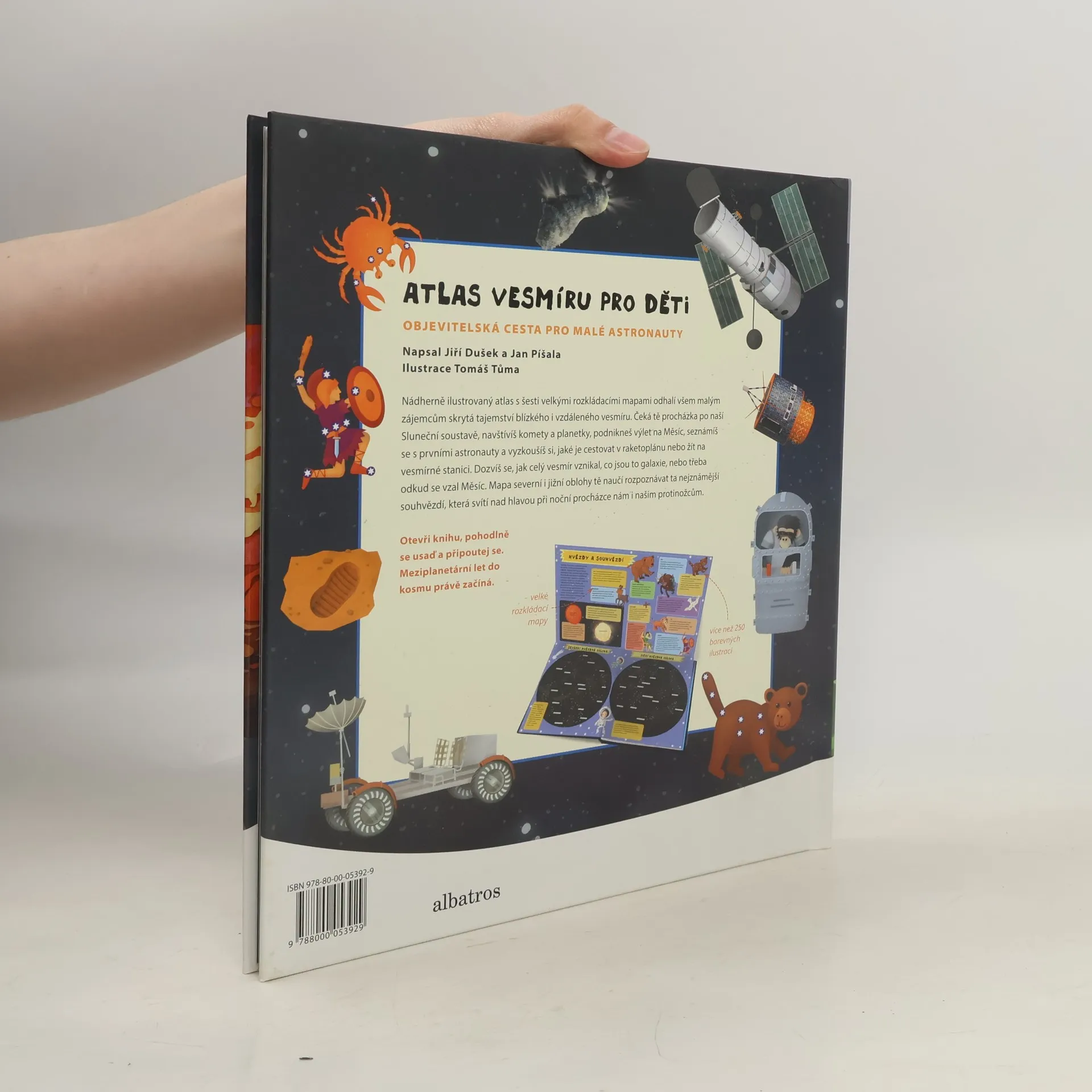 Nádherně ilustrovaný atlas s šesti velkými rozkládacími mapami odhalí všem malým zájemcům skrytá tajemství blízkého i vzdáleného vesmíru. Čeká tě procházka po naší Sluneční soustavě, navštívíš komety a planetky, podnikneš výlet na Měsíc, seznámíš se s prvními astronauty a vyzkoušíš si, jaké je cestovat v raketoplánu nebo žít na vesmírné stanici. Mapa severní i jižní oblohy tě naučí rozpoznávat ta nejznámější souhvězdí.