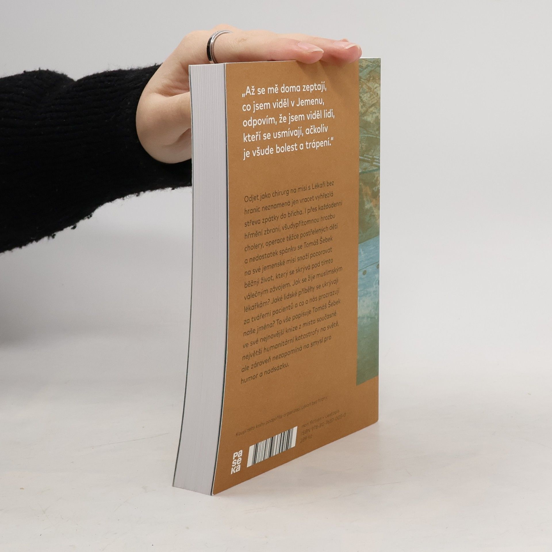 Odjet jako chirurg na misi s Lékaři bez hranic neznamená jen vracet vyhřezlá střeva zpátky do břicha. I přes každodenní hřmění střelby, všudypřítomnou hrozbu cholery, operace těžce postřelených dětí a nedostatek spánku se Tomáš Šebek na své jemenské misi snaží pozorovat běžný život, který se skrývá pod tímto válečným závojem. Jak se žije muslimským lékařkám? Jaké lidské příběhy se ukrývají za tvářemi pacientů a co o nás prozrazují naše jména? To vše popisuje Tomáš Šebek ve své nejnovější knize z místa současné největší humanitární katastrofy na světě, ale zároveň nezapomíná zapojit i smysl pro humor a nadsázku.