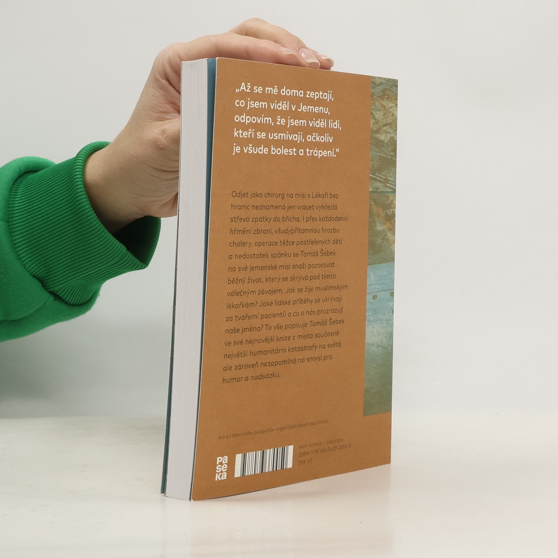 Odjet jako chirurg na misi s Lékaři bez hranic neznamená jen vracet vyhřezlá střeva zpátky do břicha. I přes každodenní hřmění střelby, všudypřítomnou hrozbu cholery, operace těžce postřelených dětí a nedostatek spánku se Tomáš Šebek na své jemenské misi snaží pozorovat běžný život, který se skrývá pod tímto válečným závojem. Jak se žije muslimským lékařkám? Jaké lidské příběhy se ukrývají za tvářemi pacientů a co o nás prozrazují naše jména? To vše popisuje Tomáš Šebek ve své nejnovější knize z místa současné největší humanitární katastrofy na světě, ale zároveň nezapomíná zapojit i smysl pro humor a nadsázku.